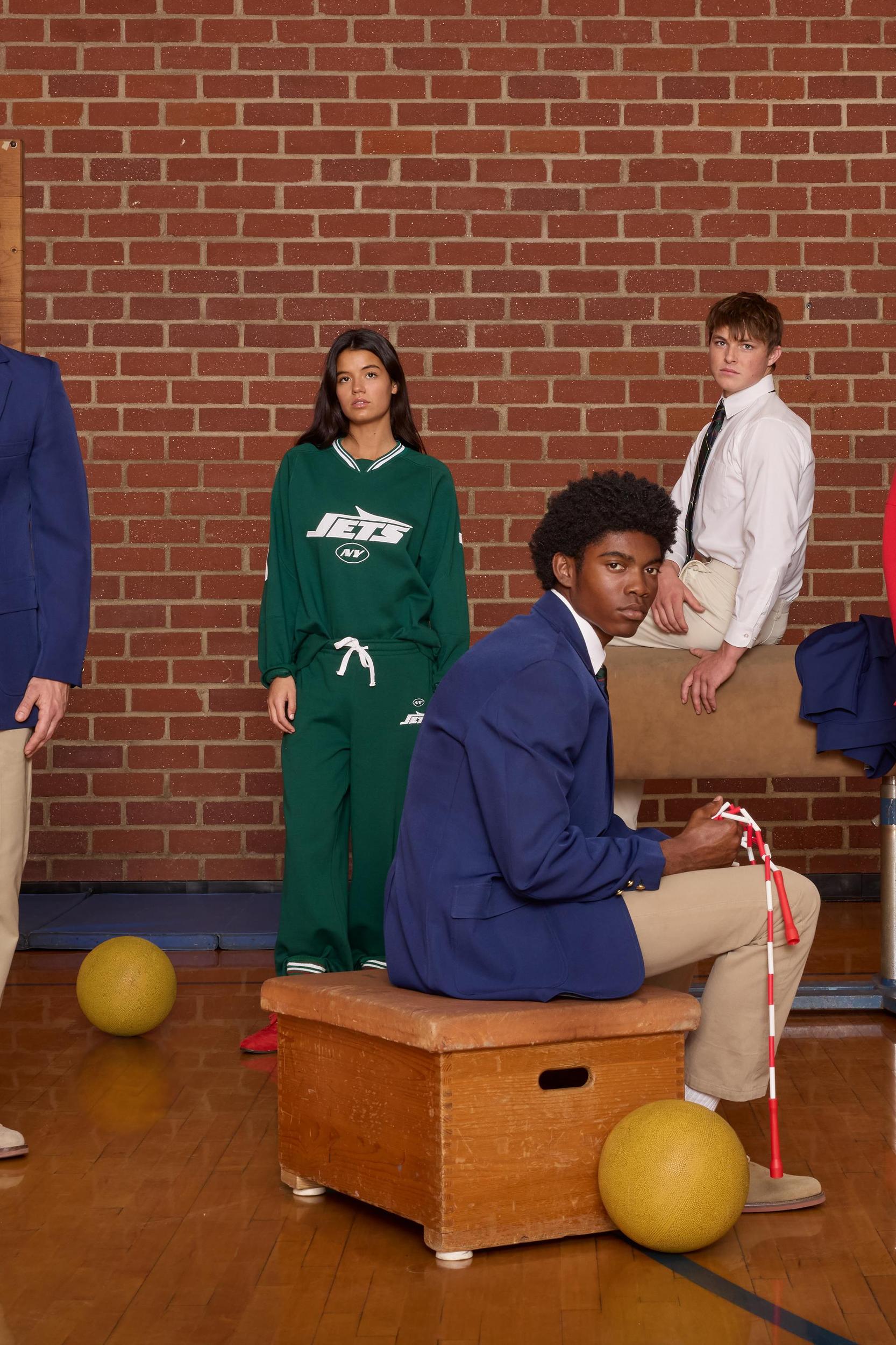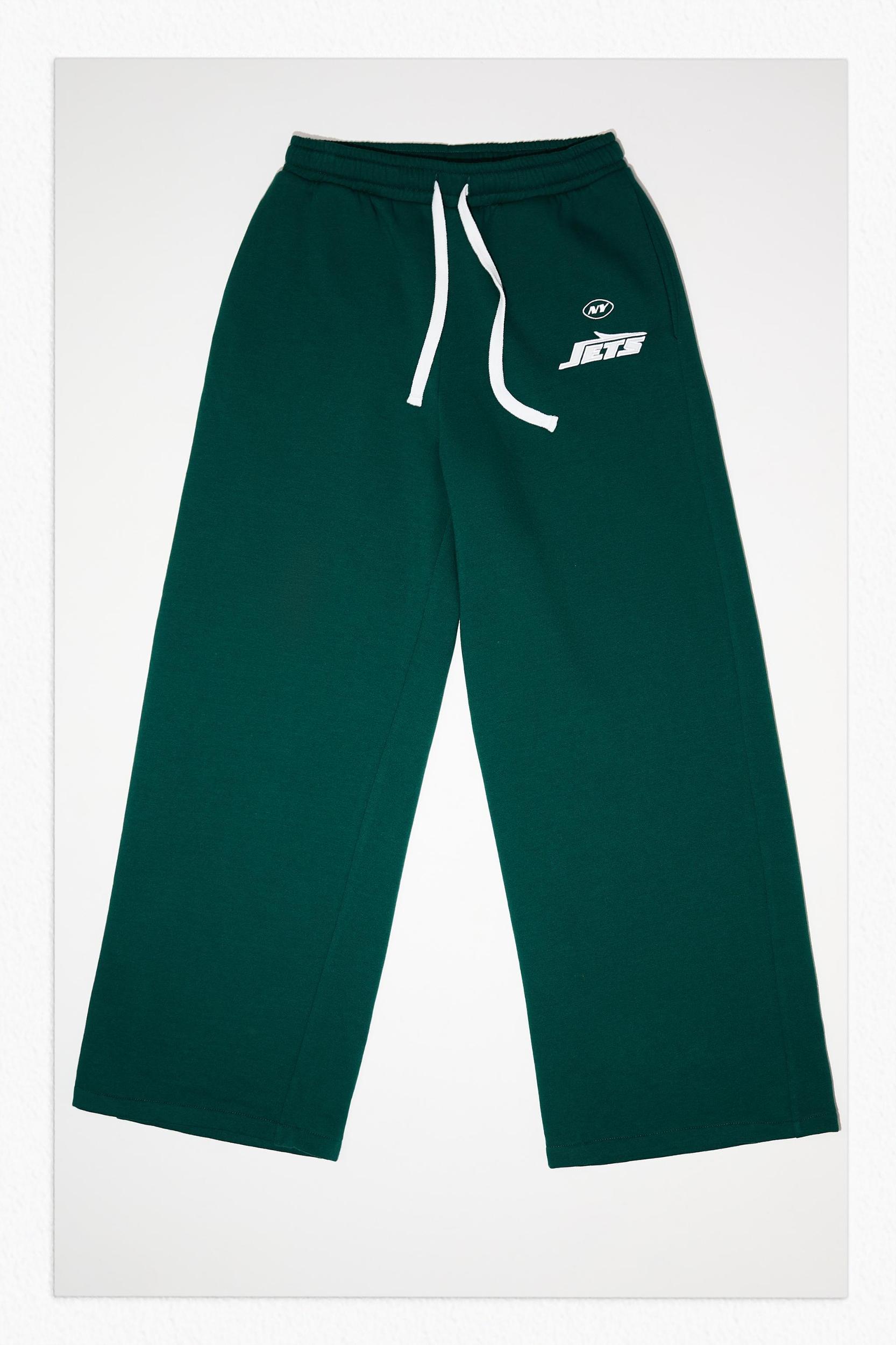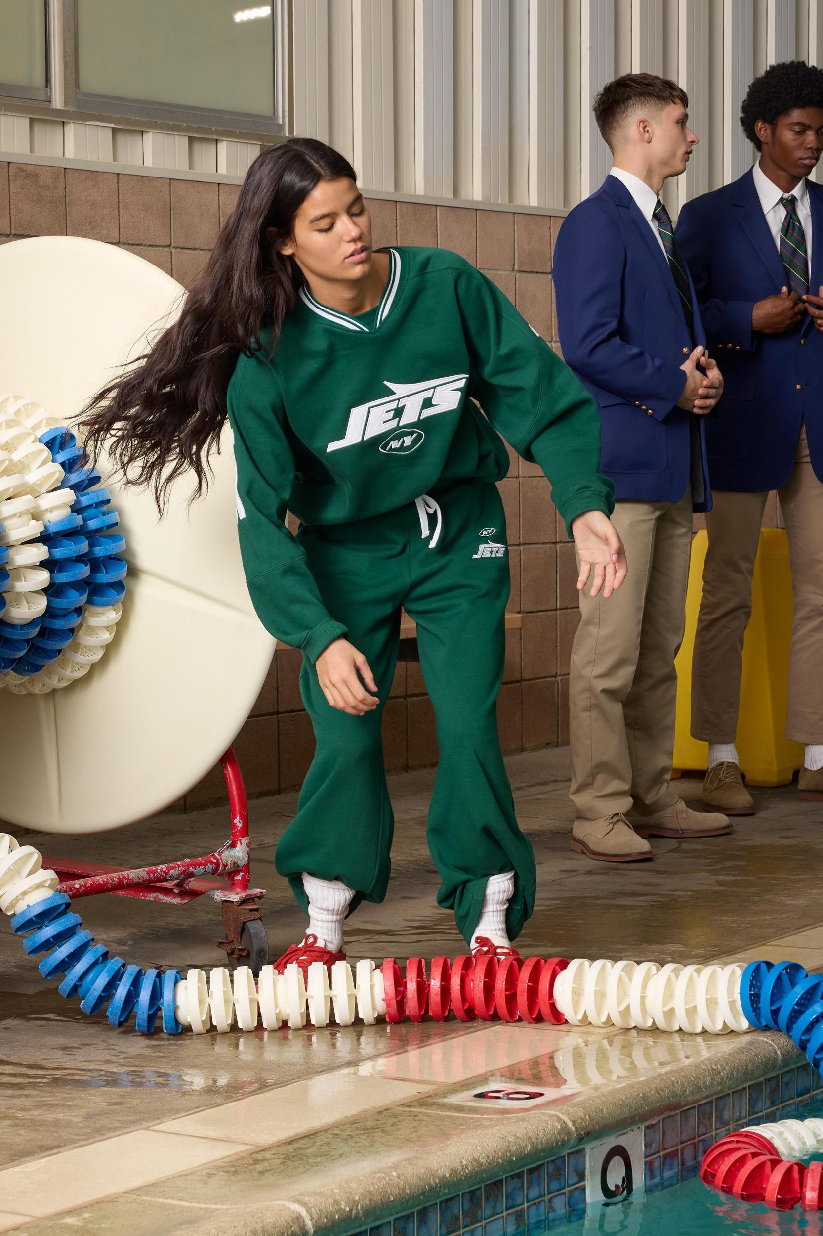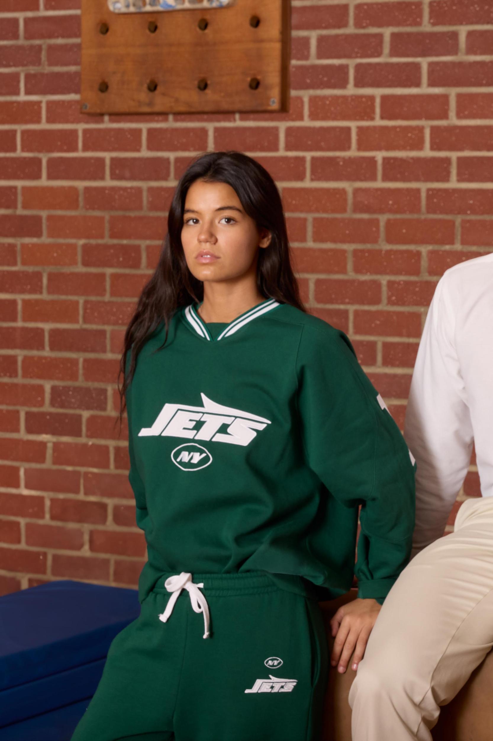 V-neck sweatshirt with contrasting rib. Long sleeves with cuffs. Text, embroidery, and NFL JETS patch detail.