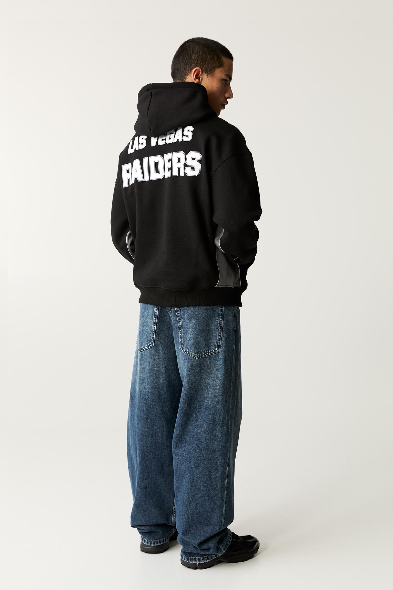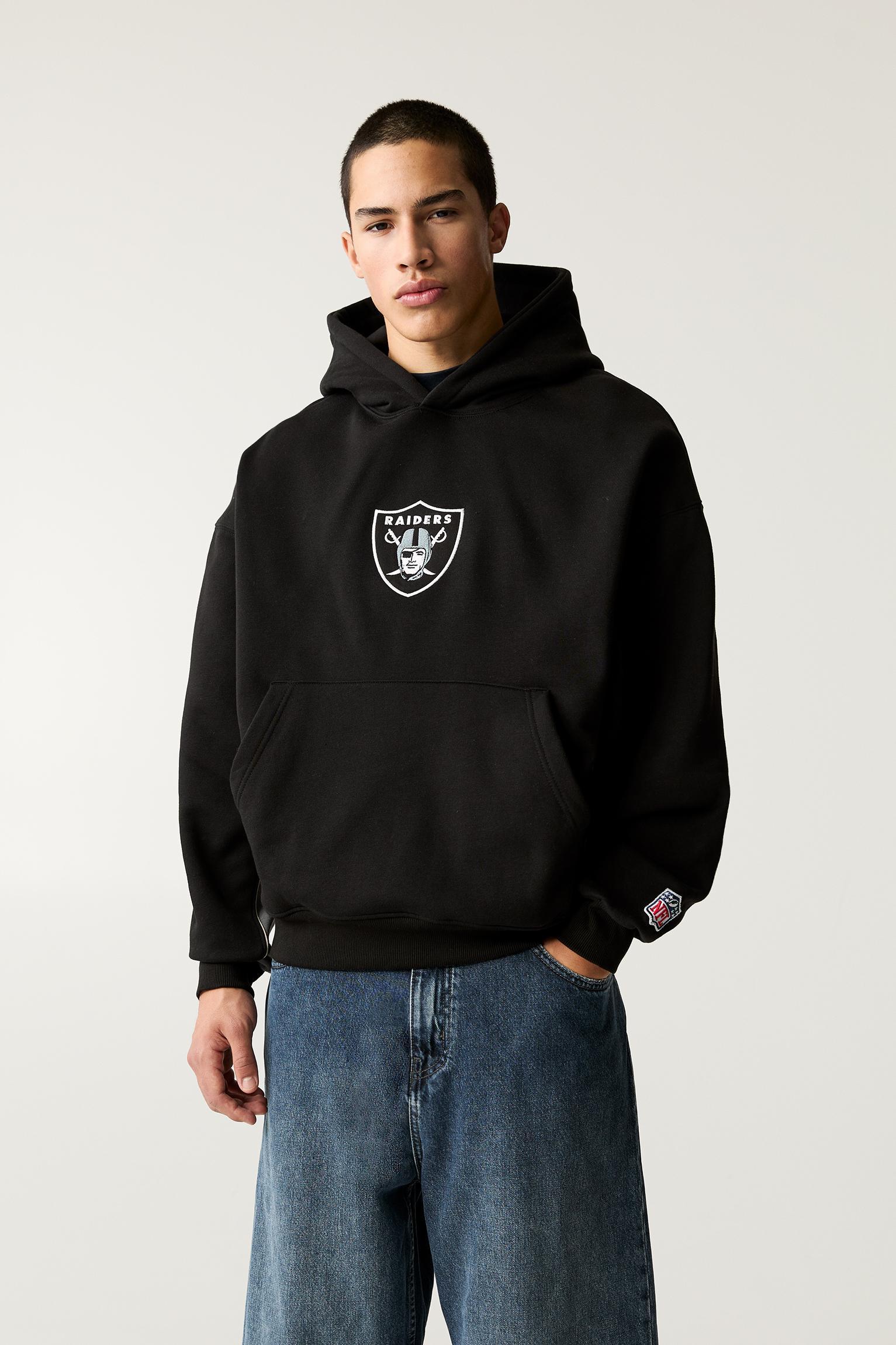 Black NFL license sweatshirt with a contrast Las Vegas Raiders graphic, a hood and front pouch pocket. Made of cotton.