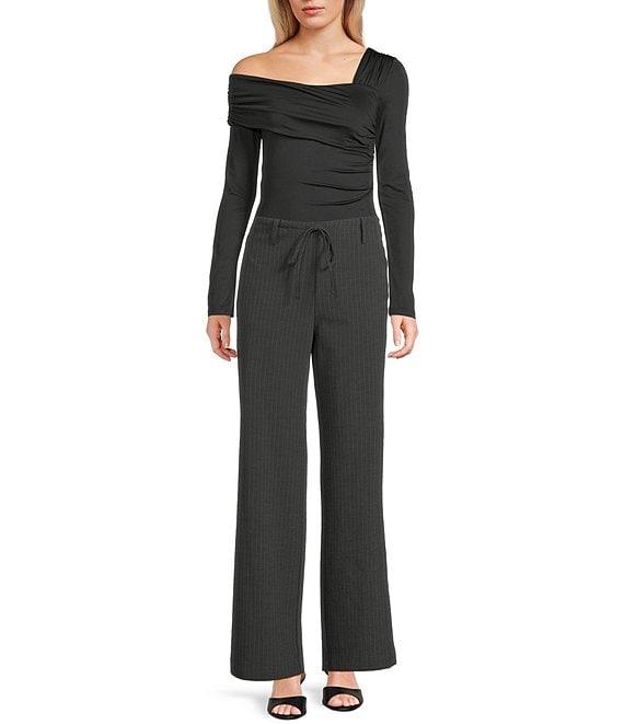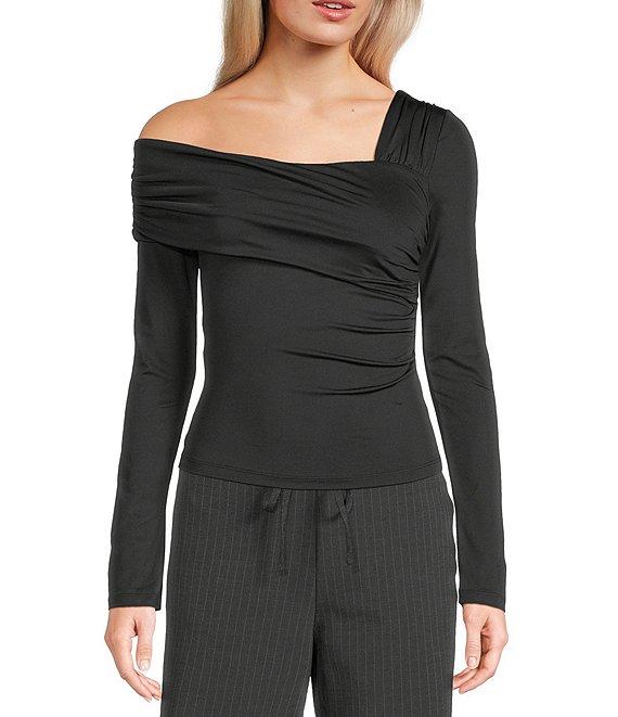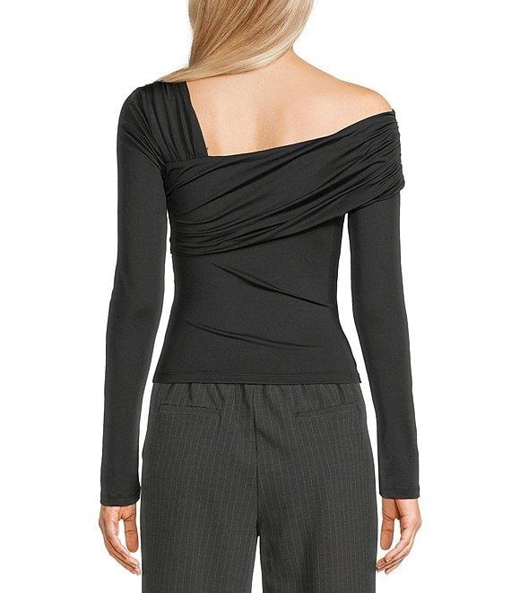 From NIA, this top features: Jersey knit fabrication One shoulder Long sleeves Fitted Polyester/rayon Machine wash; tumble dry Imported.