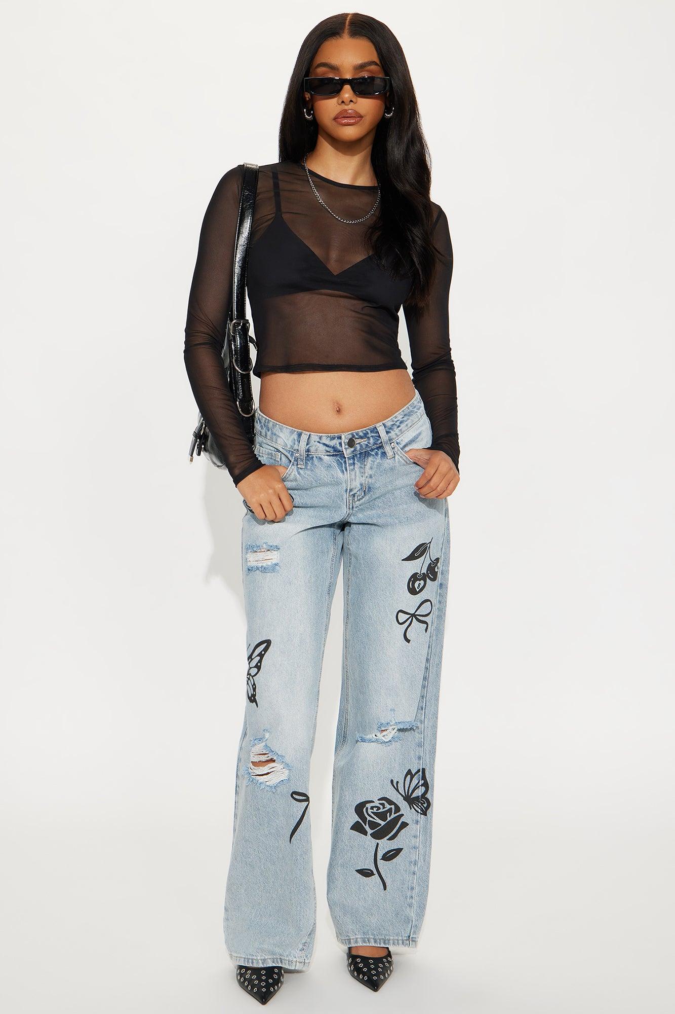 Nia Mesh Crew Neck Long Sleeve Top - Black