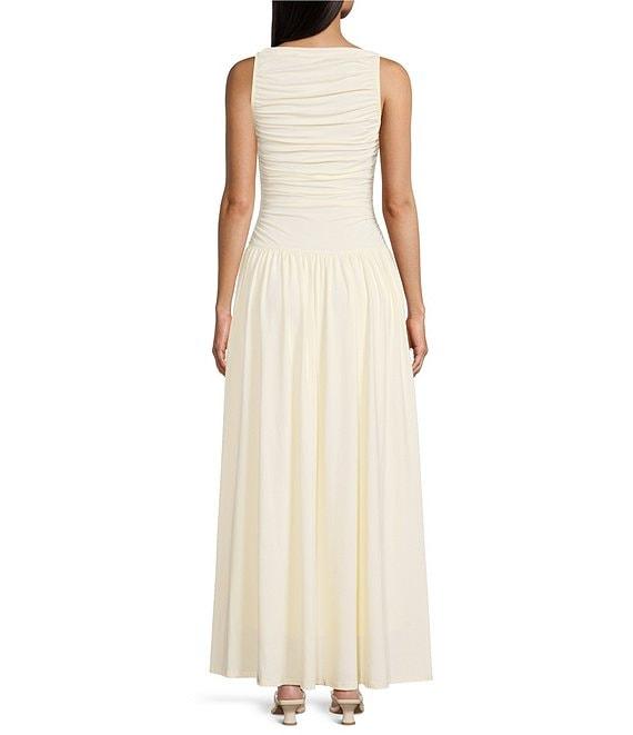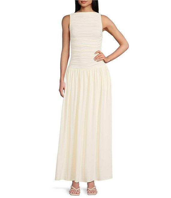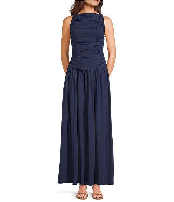 From NIA, this dress features: Knit fabric Boat neck Sleeveless Zip side closure Drop waist Maxi length Polyester/rayon Machine wash; tumble dry Imported.