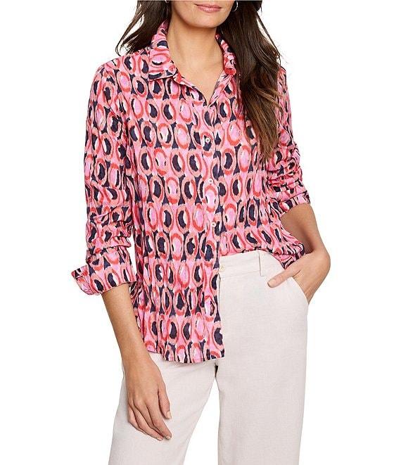 From NIC + ZOE, this shirt features: Woven fabrication Ikat rings print Collar v-neckline Long sleeves Shirttail hem Button Front closure Approx. 27" length Cotton Machine wash Imported.
