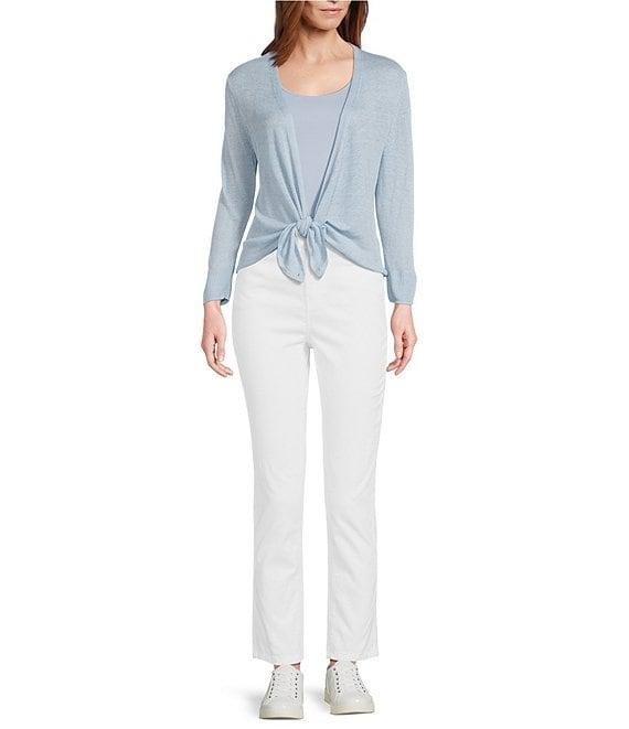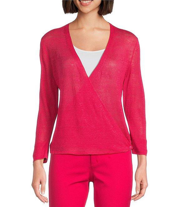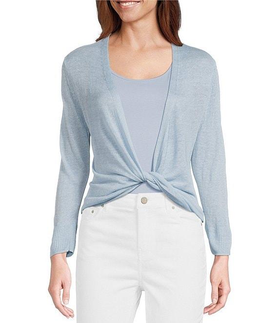 From NIC + ZOE, this cardigan features: Jersey knit fabrication V-neckline 3/4 sleeves Straight hem Open front closure One button at each side of waist to create wrap front effect Approx. 21.5" length Linen/viscose Hand wash Imported.