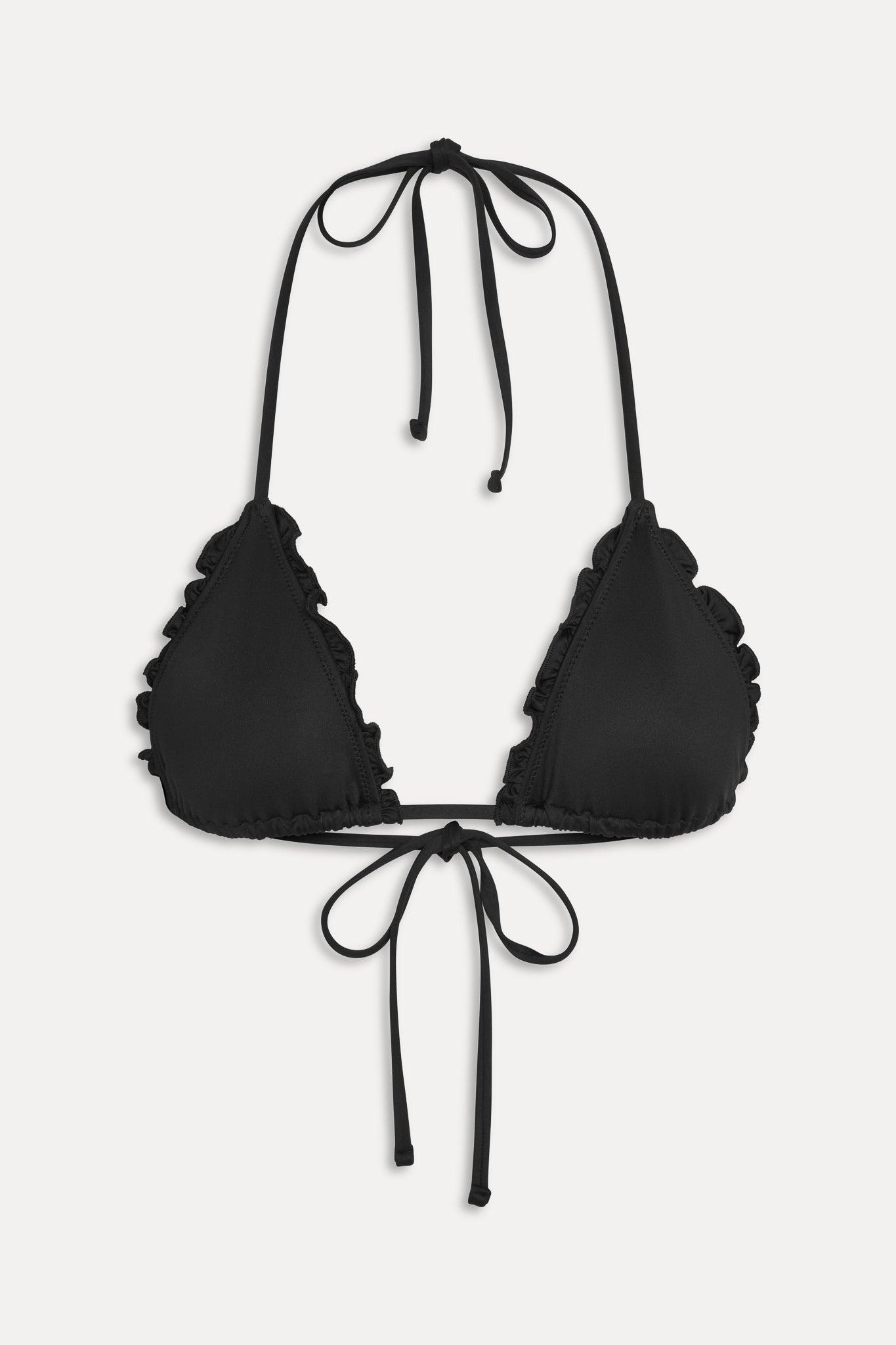 Our most tried and true triangle bikini top is here to stay. Nick features adjustable string ties that wrap around your neck and back for a personalized fit. Details Ruffle trim Halter bikini top Skimpy triangle coverage Ties at the neck and back Ruched detailing