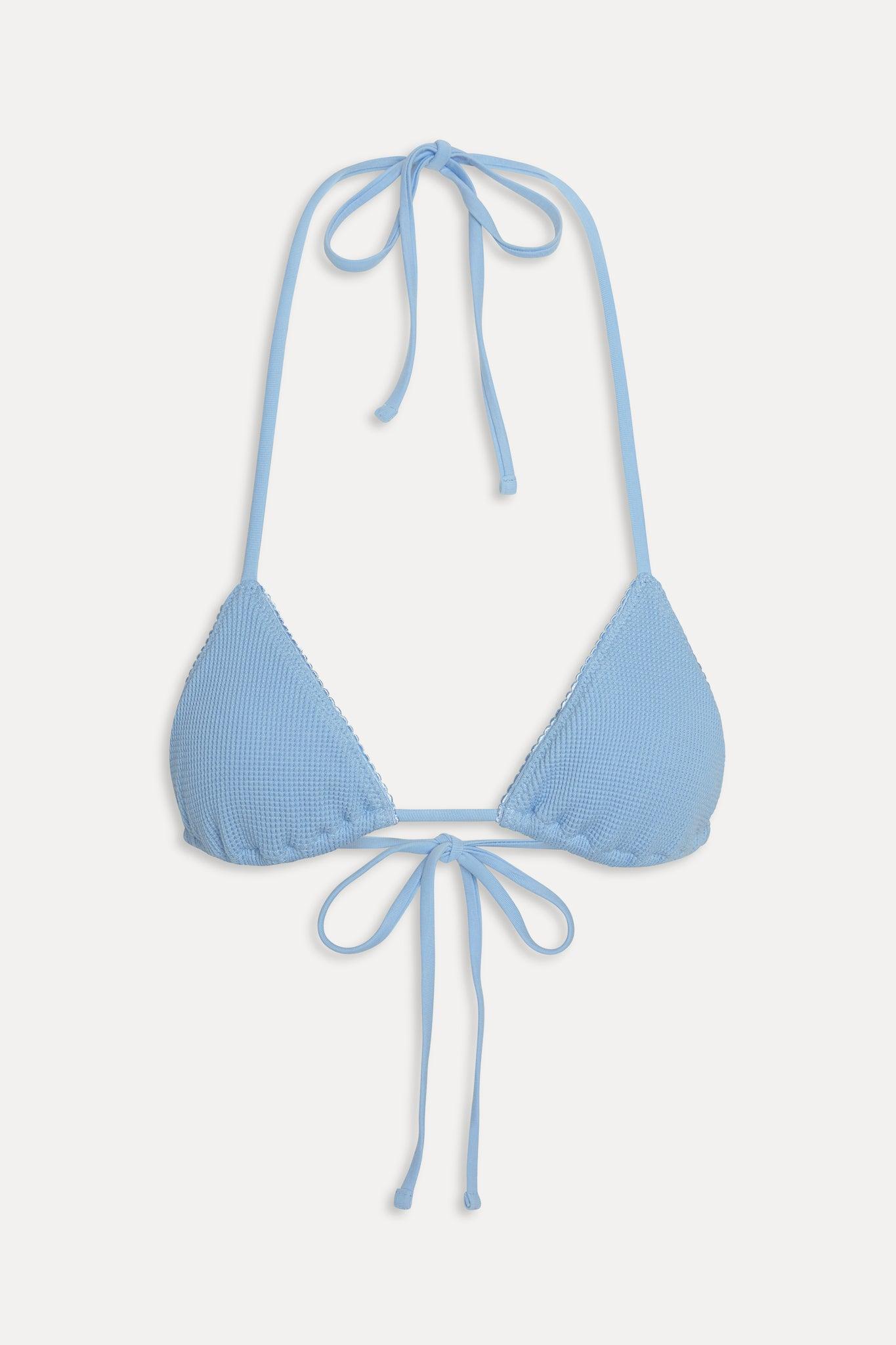 Our most tried and true triangle bikini top is here to stay. Nick features a new thermal swim fabric and adjustable string ties that wrap around your neck and back for a personalized fit. Details Halter bikini top Skimpy coverage Designed in new thermal swim fabric Ties at the neck and back Ruched and trim detailing New Made to Fade Thermal Our waffle thermal fabric is one of a kind and designed to fade over time like your perfect vintage find. Care Instructions Add ½ cup distilled vinegar in the first wash Turn inside out Cold wash with mild detergent Avoid laundry pods Wash separately Tumble dry low or line dry