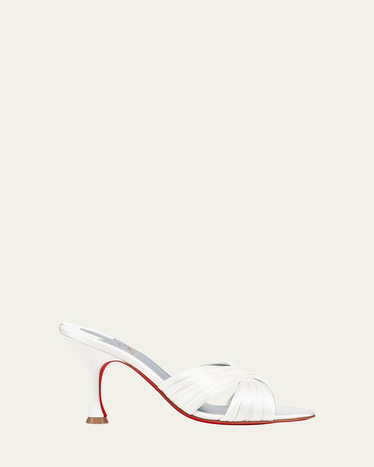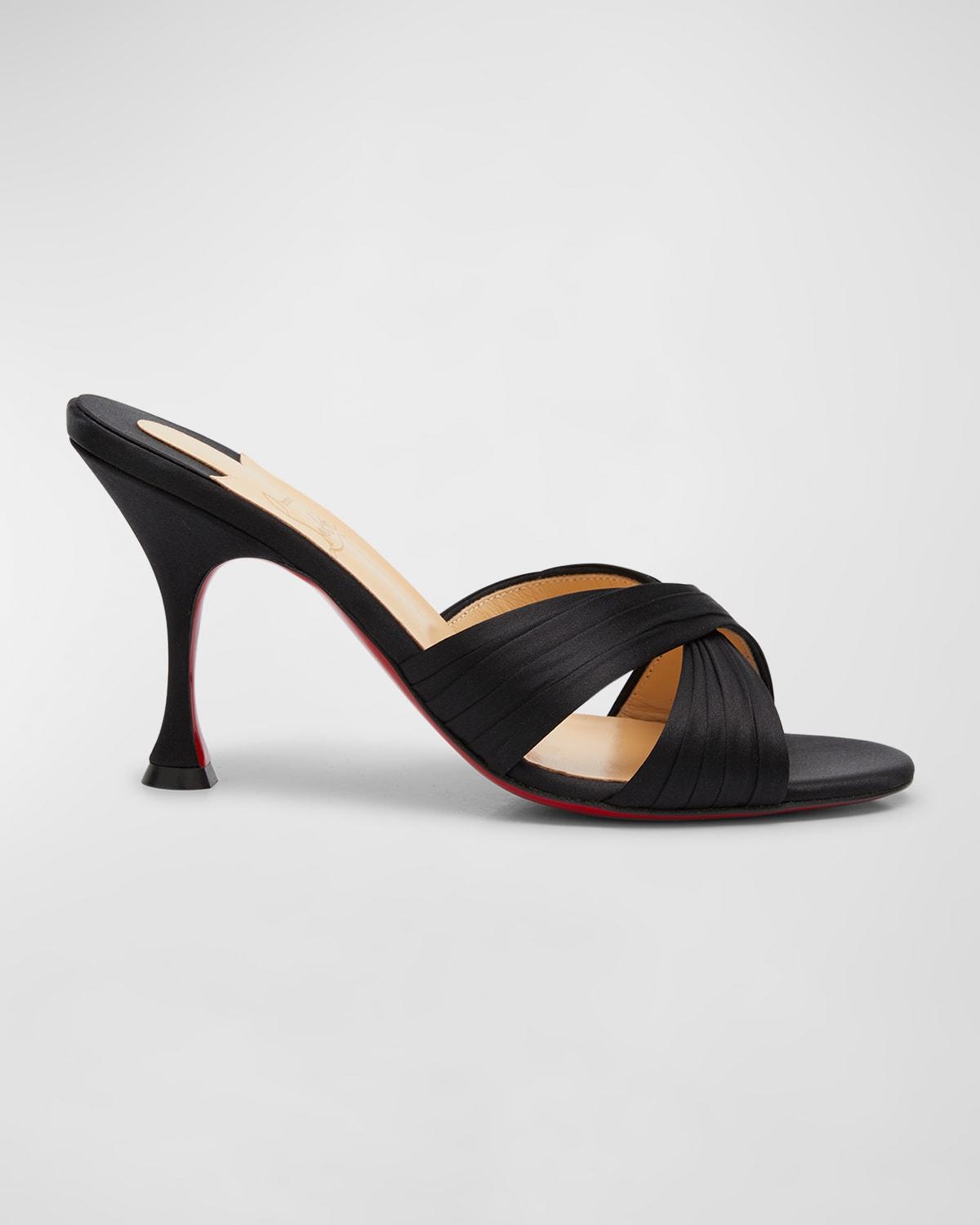 Christian Louboutin Nicol is Back crape satin slide sandal. 3.3 covered pedestal heel. Open toe. Crisscross vamp. Leather lining. Signature red leather outsole. Made in Italy.