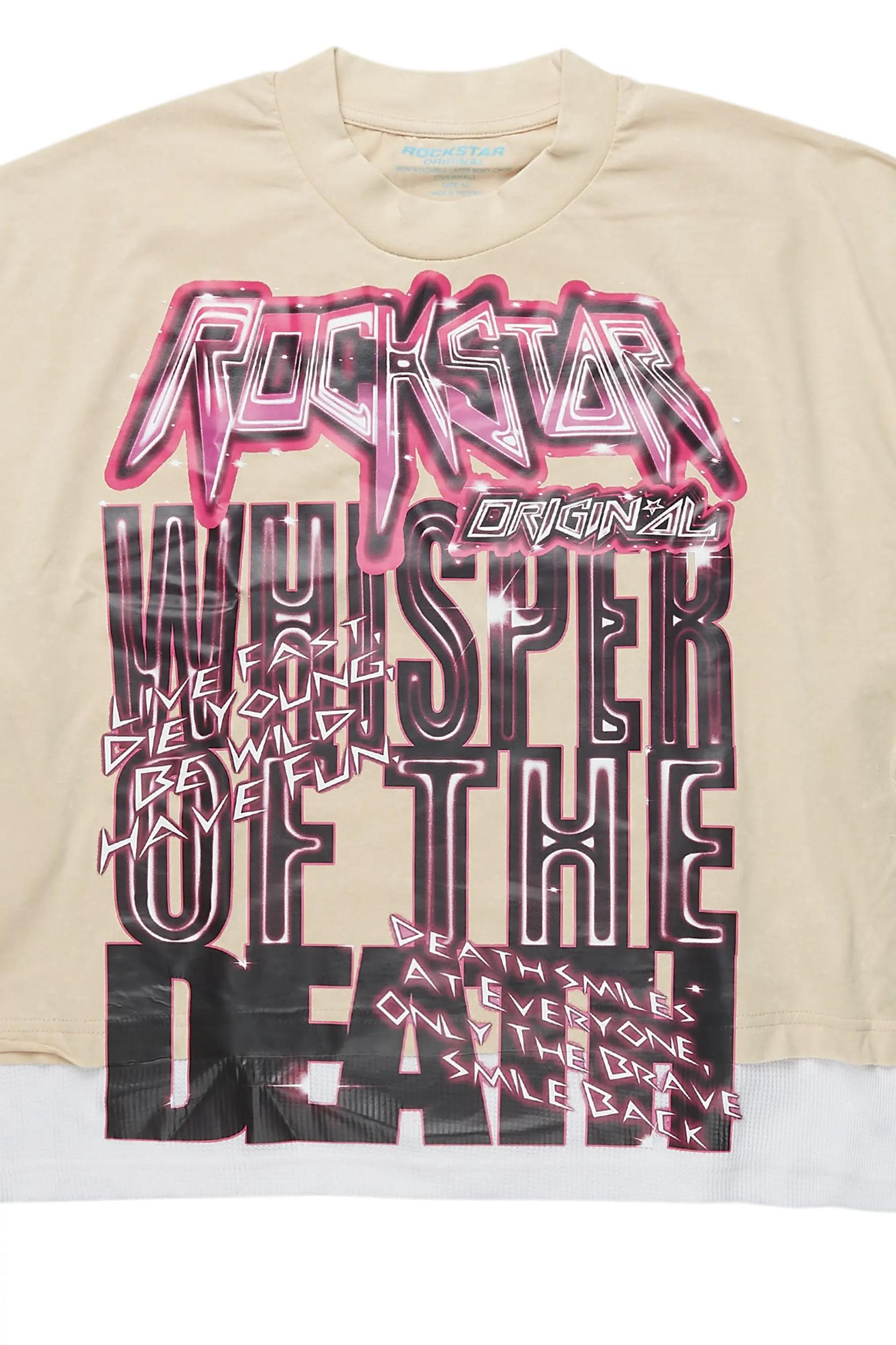 An urban double layer long sleeve thermal and short sleeve tee for women in beige. Designed with organic cotton and a boxy-fit for a dope streetwear style. Crew neckline Long sleeves Ribbed knit trims Short sleeves Boxy-fit Pullover style Soft textured thermal fabric Printed RSO graphics