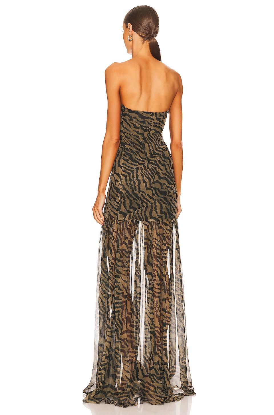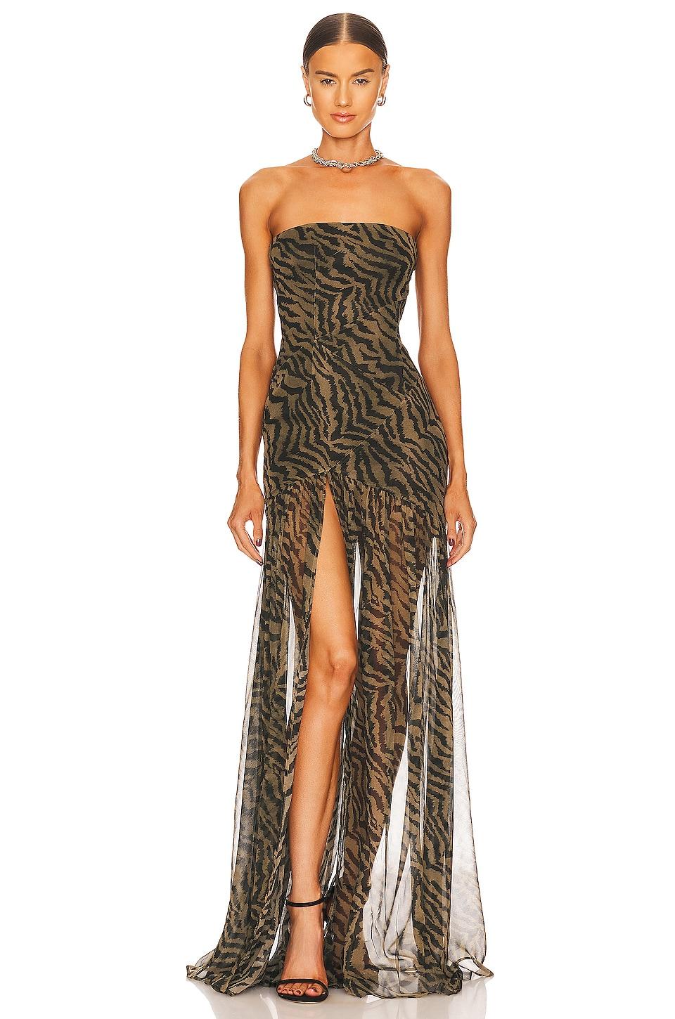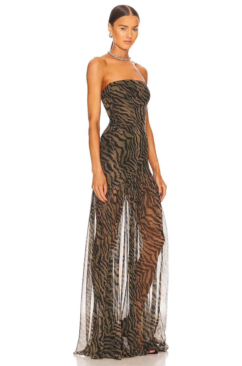 Self: 100% silkLining: 97% polyester, 3% spandex. Made in China. Dry clean only. Partially lined. Hidden side zipper closure. Front slit. Semi-sheer fabric. Neckline to hem measures approx 56" in length. Revolve Style No. ROFR-WD384. Manufacturer Style No. FW22-5555.