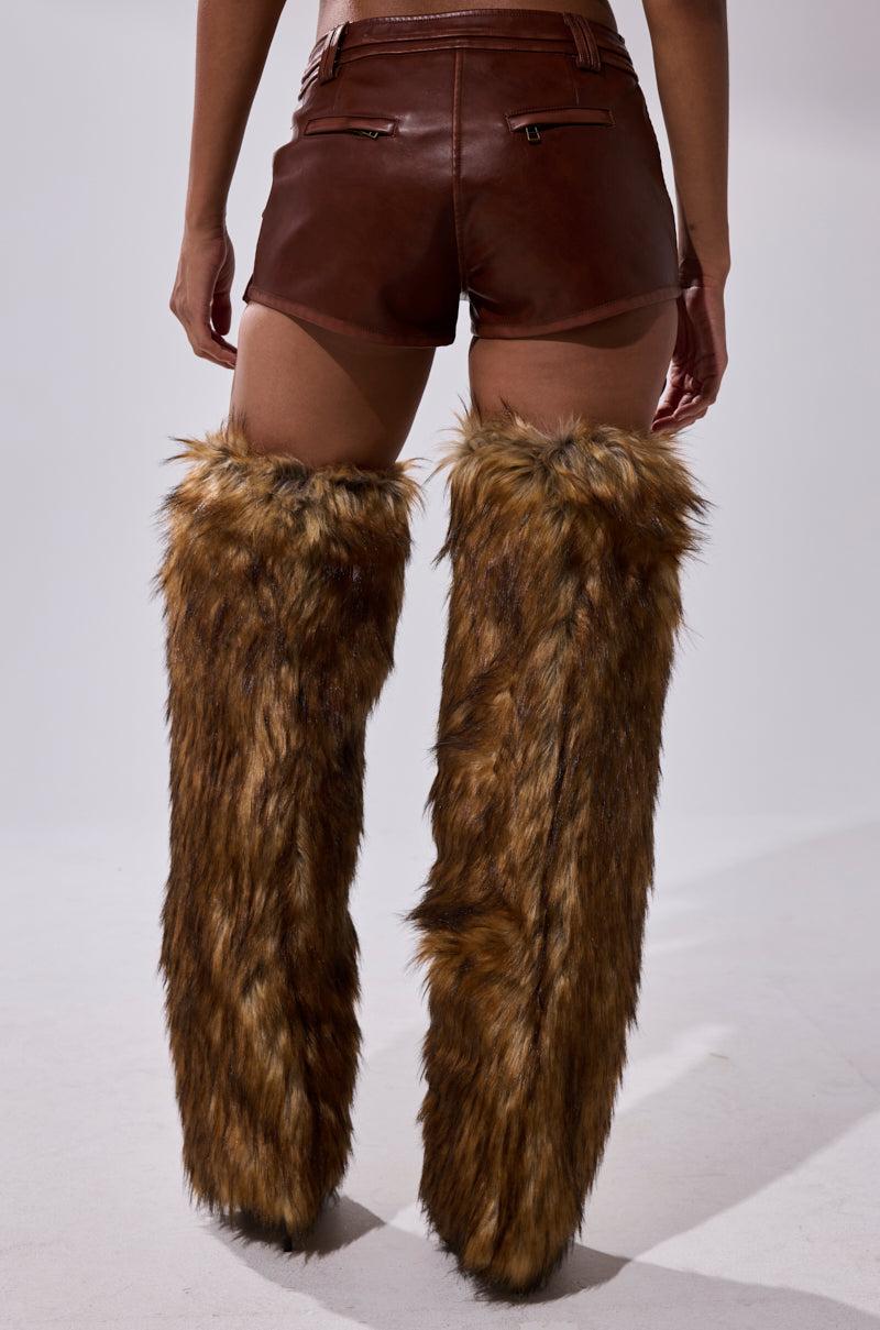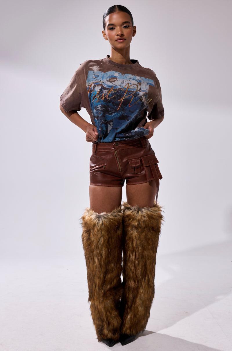 Elevate your edgy essentials with the The AKIRA Label Nicolette Faux Leather Short. Crafted from rich faux leather, this luxe-meets-utilitarian bottom boasts a mid-rise fit, functional belt loops, a variety of cargo-style pockets on the front, zippered rear pockets, and a front button-zip closure. Complete with a body-contouring, mini-length silhouette that offers functionality and ease. Perfect for city strolls, concerts, or off-duty days with attitude. - 55% PU 45% Polyester- Spot Clean Only- No Stretch- Imported (all measurements approximate from size small)- 10” Rise- 1.75” Inseam Product ID: 1061775