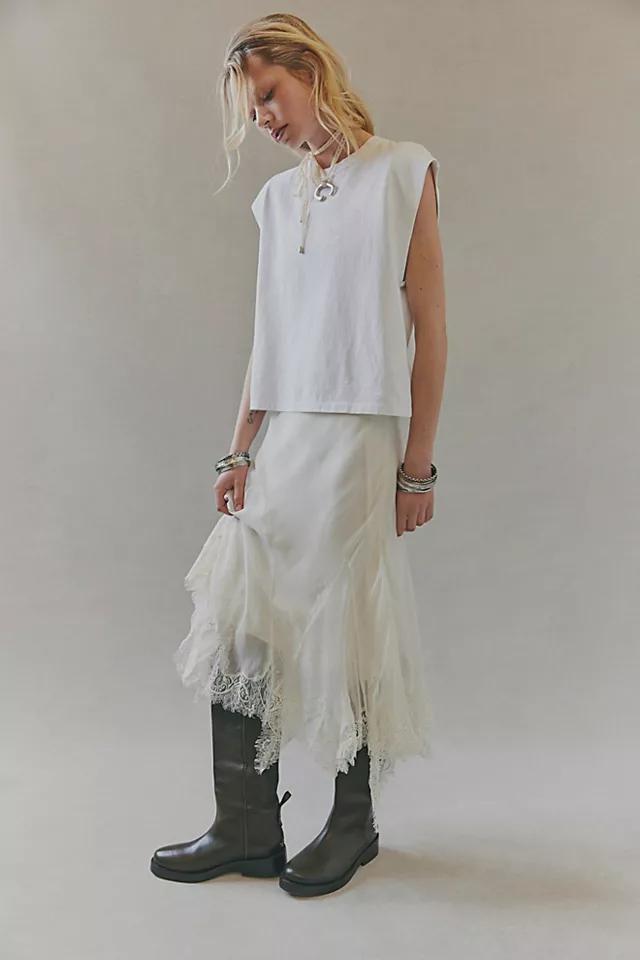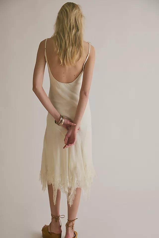 Step out in style in this stunning midi dress from Nigel Preston, featuring a delicate slip silhouette with an asymmetrical hem, lace appliques and trim, and airy chiffon fabrication.