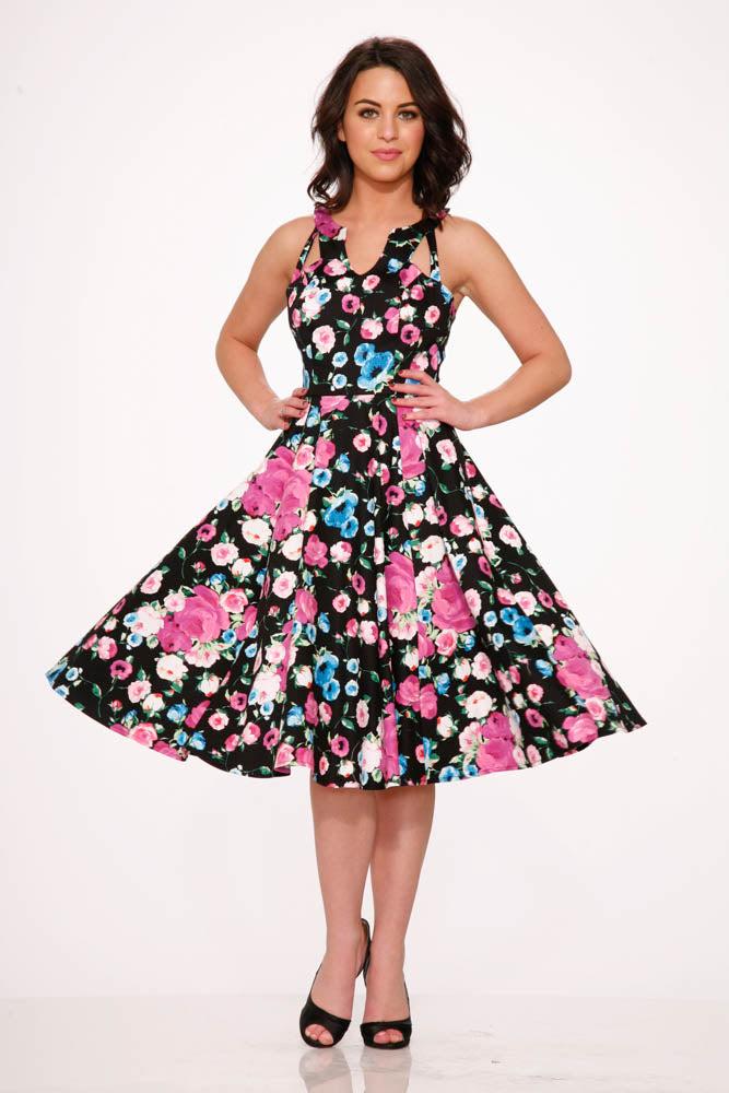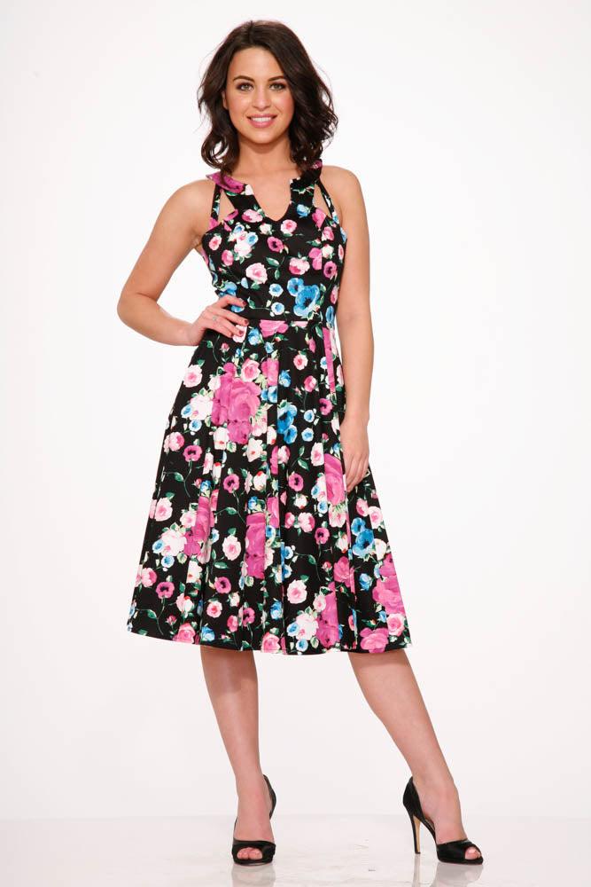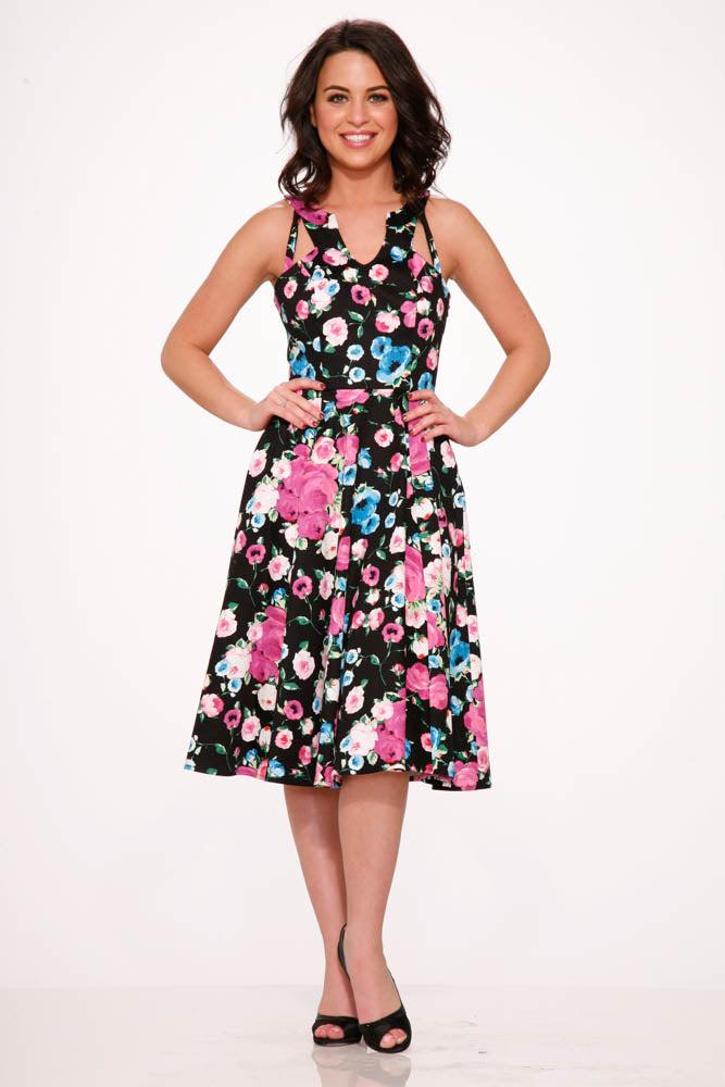 Step into full bloom after dark with the Orchid Bloom Night Beauty Dress. Featuring a vibrant garden of pink, blue, and white florals against a rich black background, this striking swing dress brings drama and romance to every twirl. The unique strappy neckline adds a touch of intrigue, while the flared silhouette and soft cotton-spandex blend promise comfort and elegance in equal measure.Details:By Orchid Bloom97% Cotton, 3% Spandex – fabric provides stretchSide zipper closureLength: 41"ImportedMachine wash cold, tumble dry low or hang to air-dry