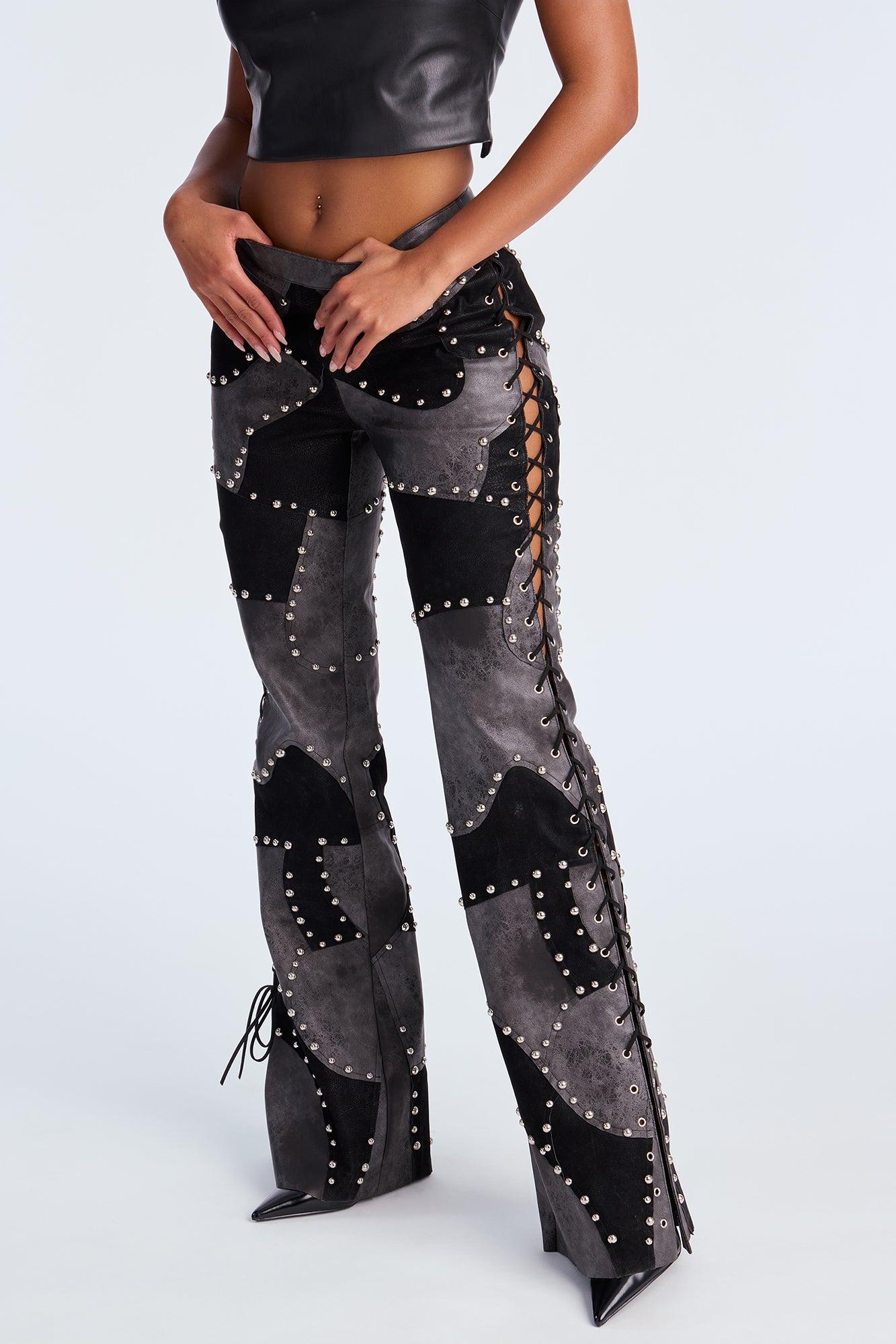 Available In Black/Smoke. Faux Leather Flare Leg Pants Moderate Stretch Low Rise Patchwoork Studded Side Lace Up Detail 31.5" Inseam Self: Rayon 45% Polyurethane Contrast: 40% Polyurethane 40% Rayon 20% Polyester Imported California Proposition 65WARNING: Cancer and Reproductive Harm - www.P65Warnings.ca.gov.