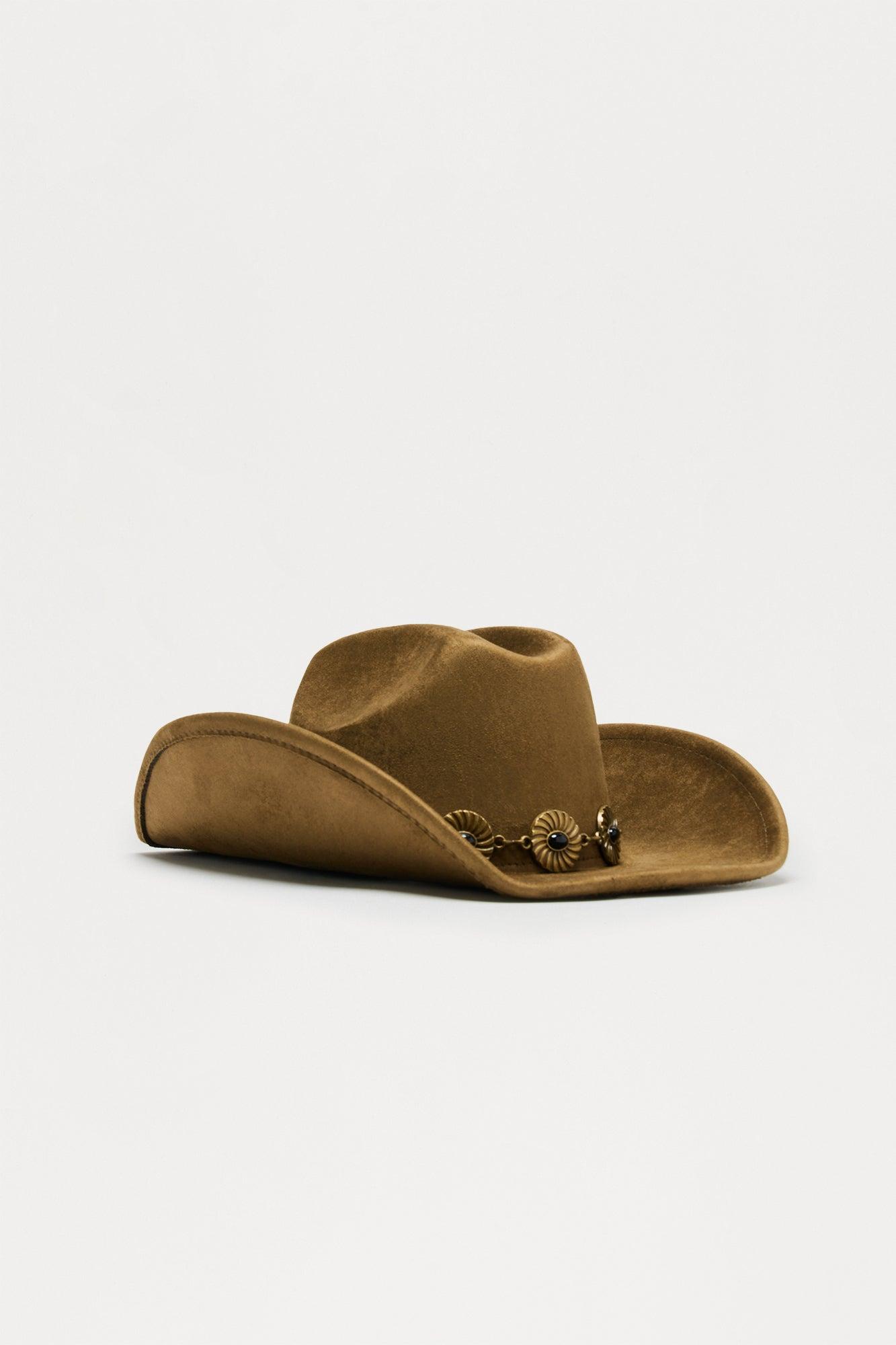 Available In Black, Ivory And Olive. Cowboy Hat Faux Suede Material Metal Trim Detail Stone Detail 100% Polyester Imported California Proposition 65WARNING: Cancer and Reproductive Harm - www.P65Warnings.ca.gov.