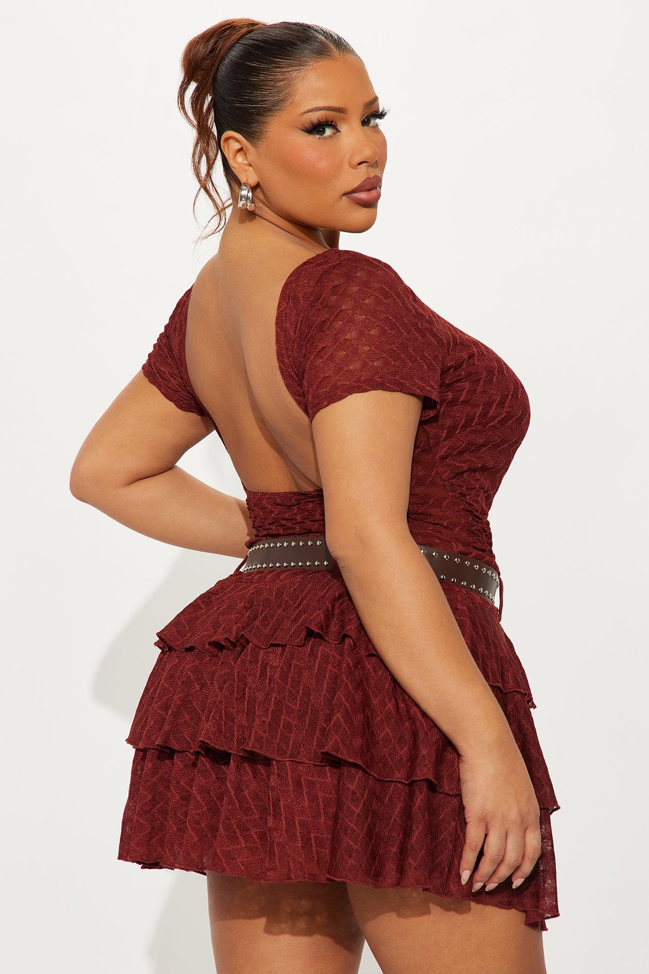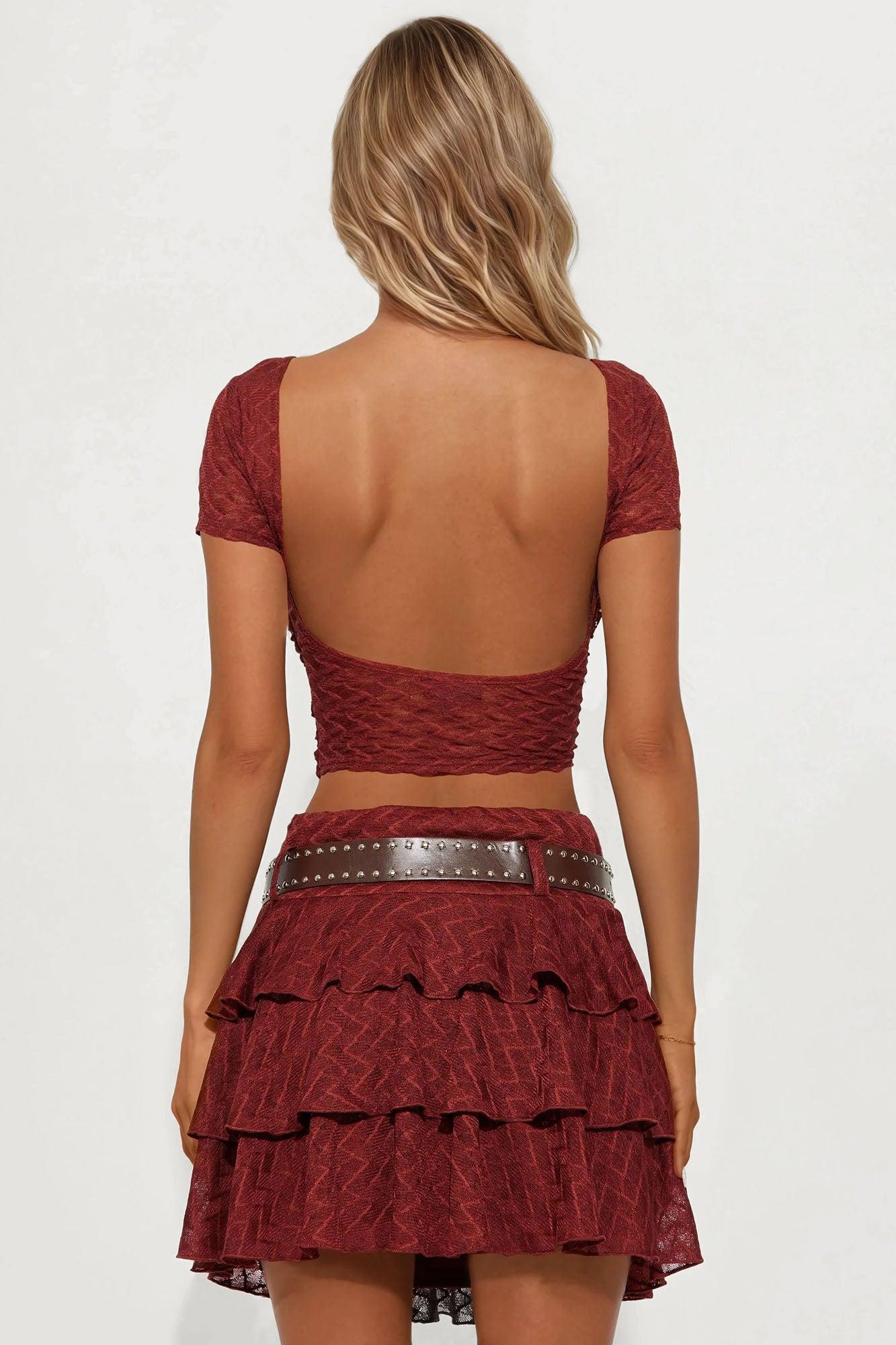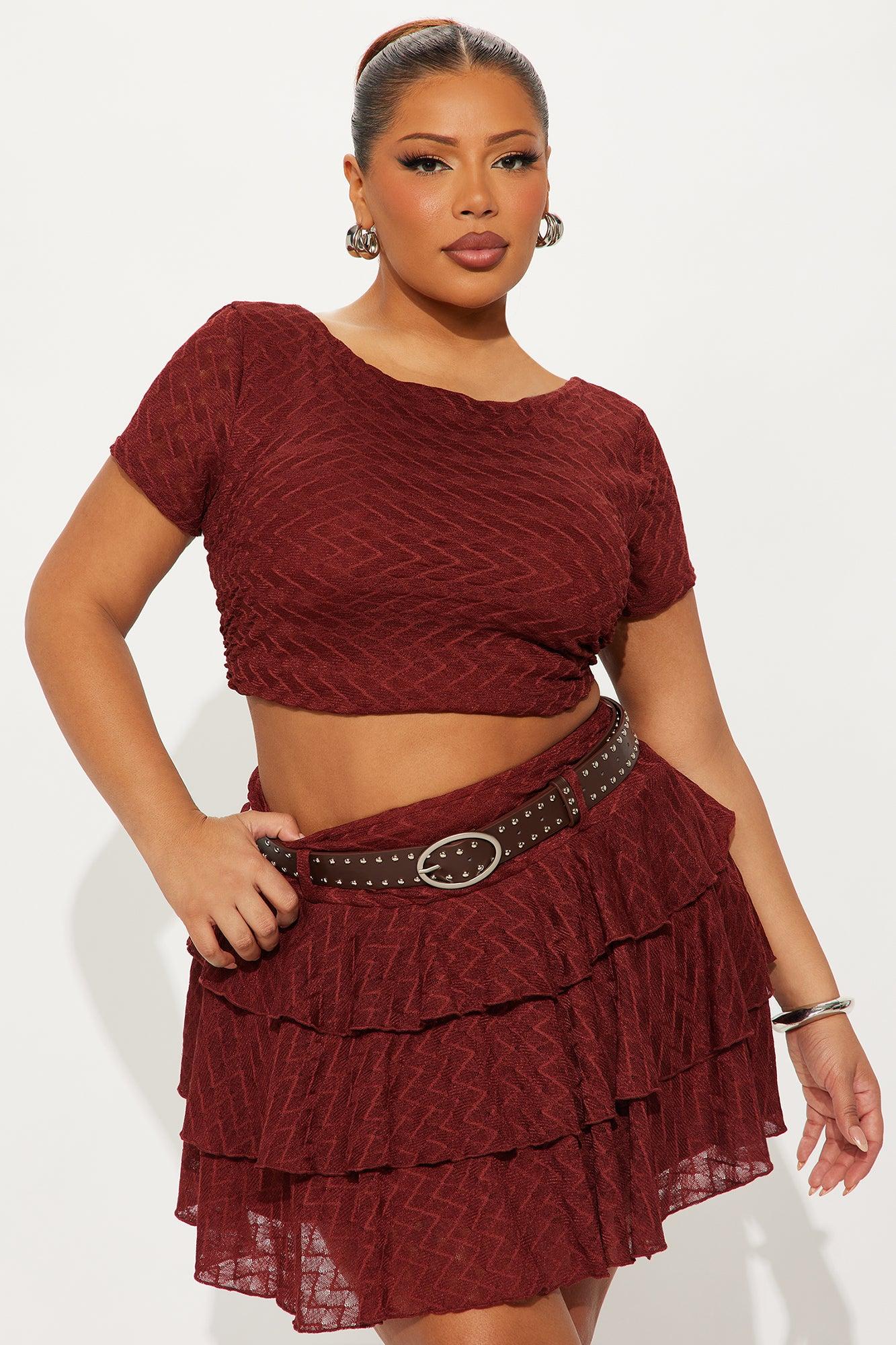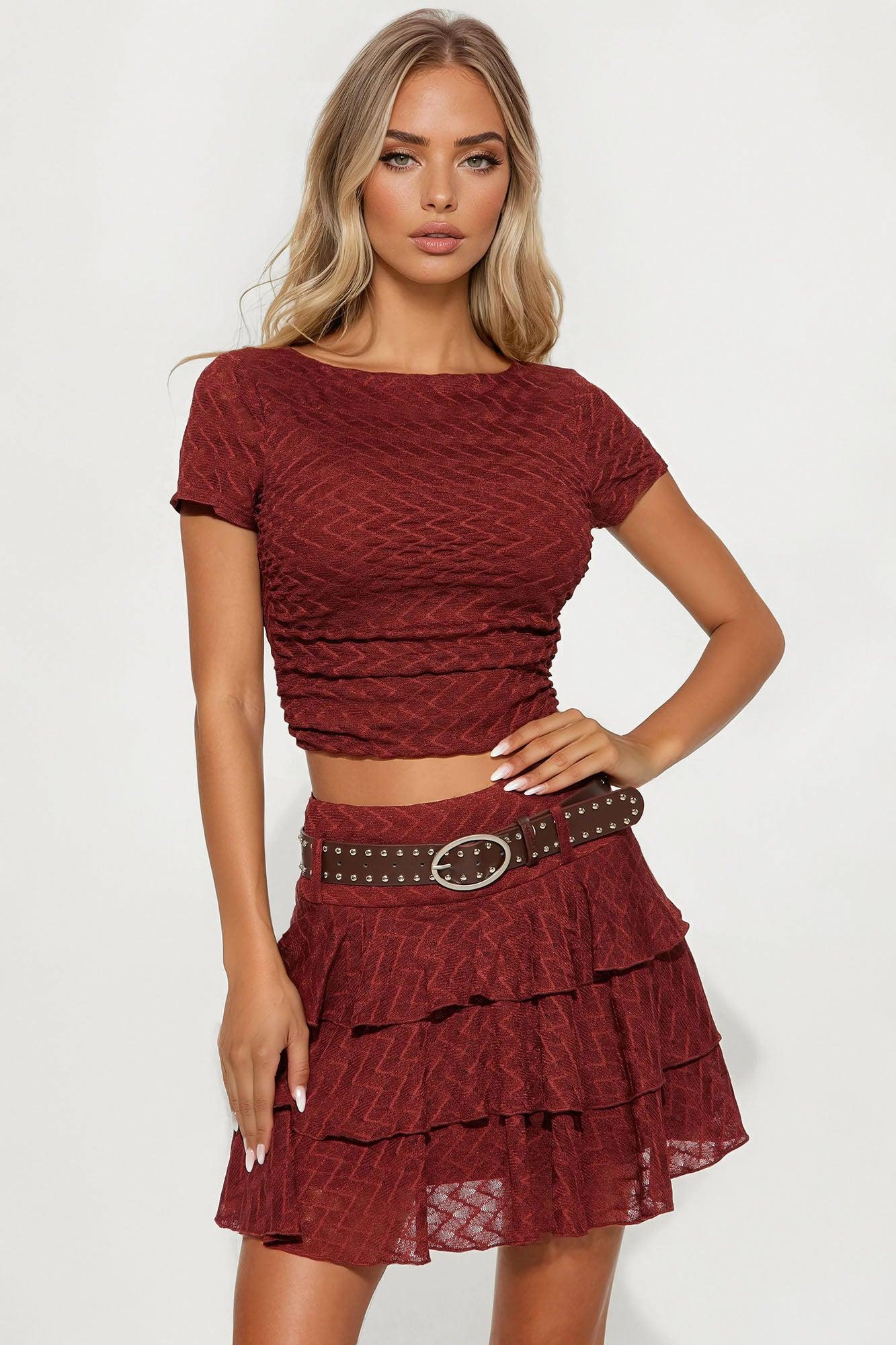 Available In Rust. Cap Sleeve Blouse and Mini Skirt Set Stretch 14.5" Length Invisible Side Zipper Closure Belt Included with Metal Design Ruffles Open Back Lined Side Ruched Self: 95% Polyester 5% Spandex Lining: 100% Polyester Imported California Proposition 65WARNING: Cancer and Reproductive Harm - www.P65Warnings.ca.gov.