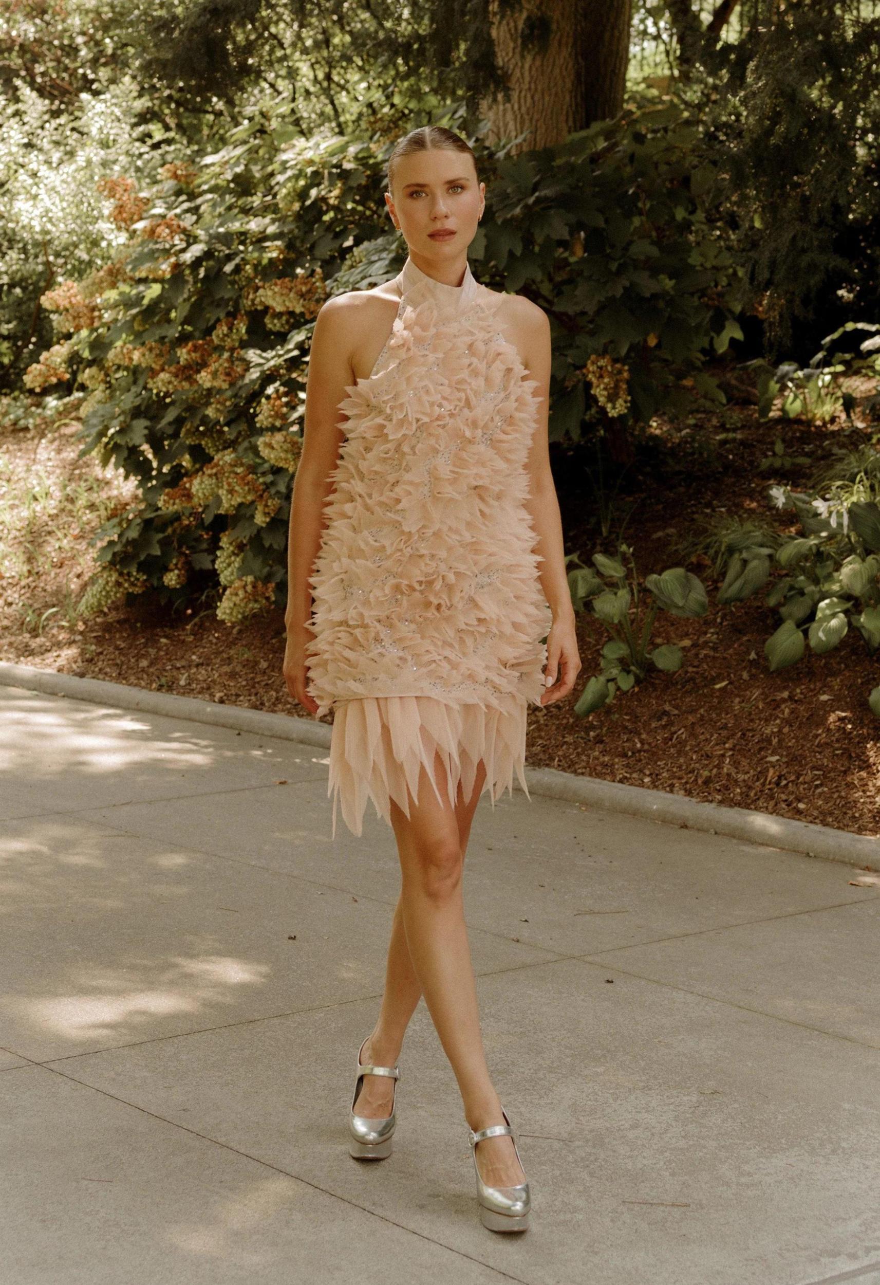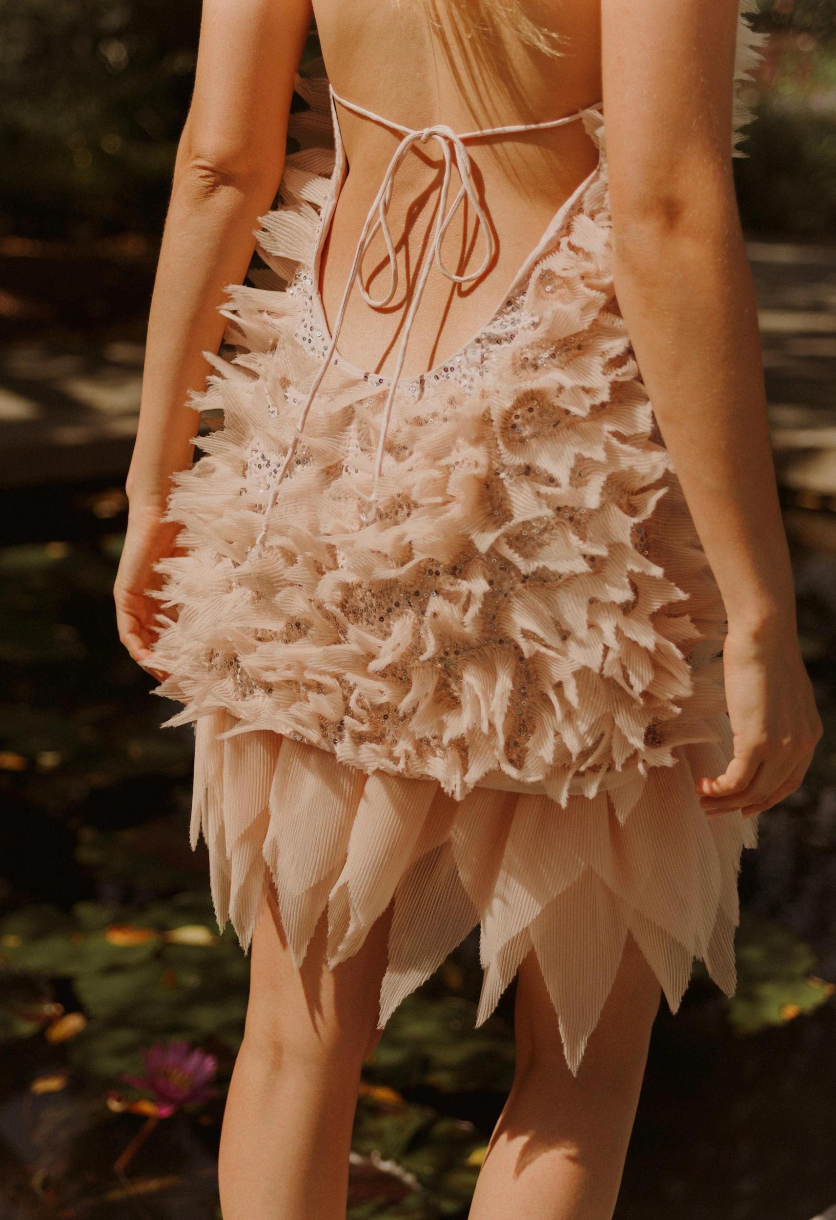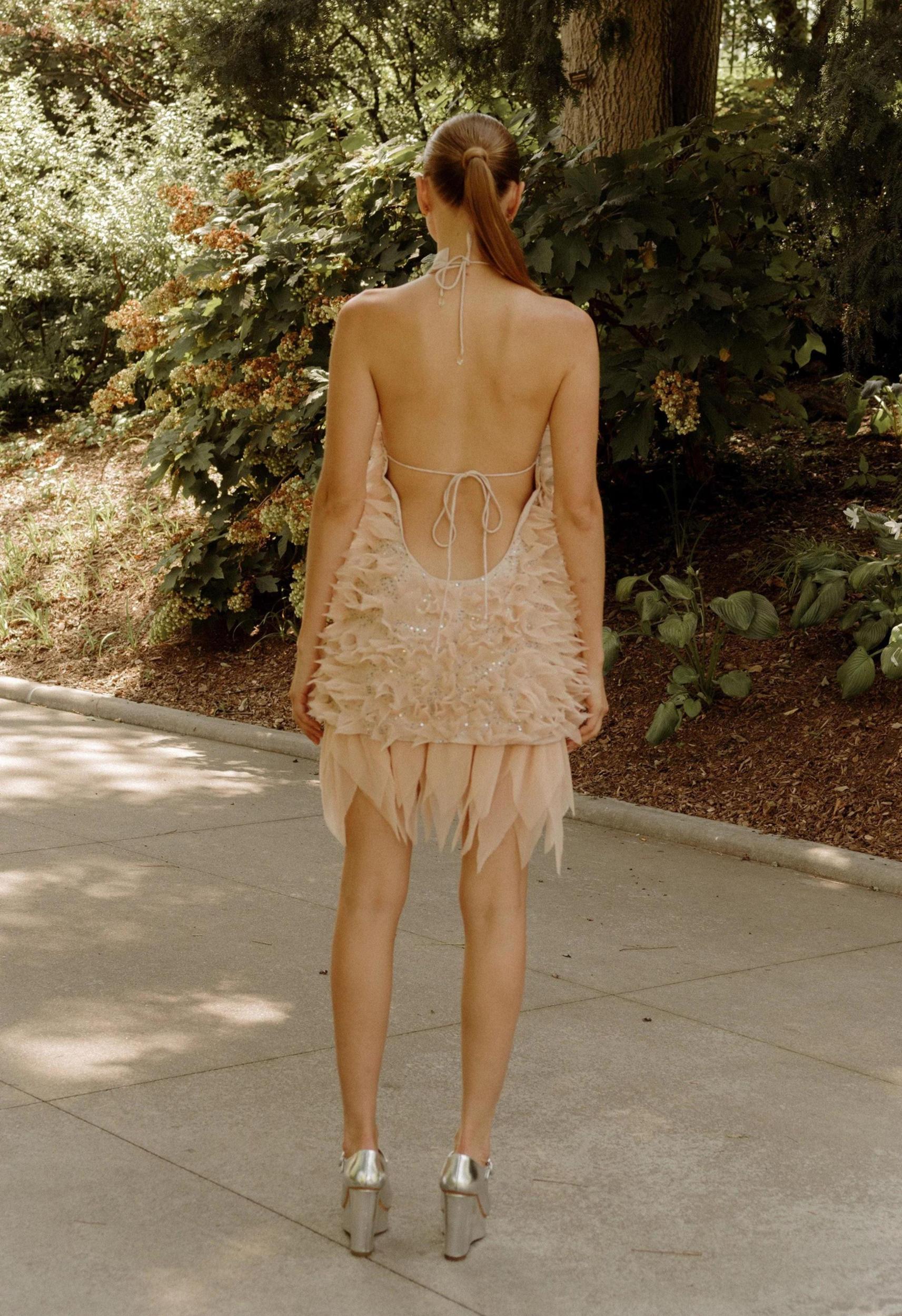 Color: Soft, Light PinkHalter Necktie with crystalsBackless, Deep ScoopInvisible Zipper on sideLighweight, Non-Stretch FabricHand Embroidered in IndiaBeads and Pleat DetailsCrinkle Organza FeatureFully LinedBody and Lining: 100% CottonAccents: 100% PolyesterDry Clean OnlyBy Arianne Elmy