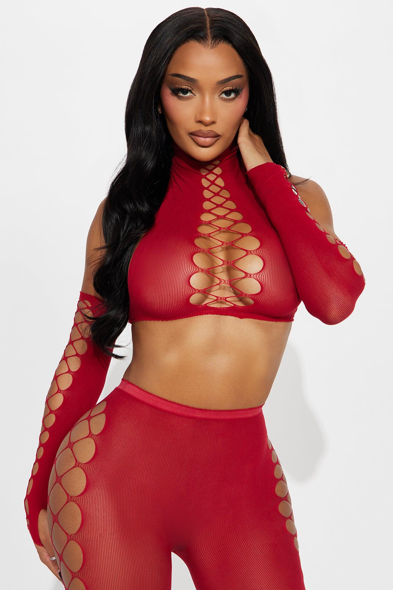 Available In Red. 3 Piece Bodystocking Set Sheer Cami Top Sleeveless Cut Out Detail High Waist Tights Ankle Length Arm Covers With Thumbholes Stretch Final Sale Self: 95% Polyester 5% Elastane Imported California Proposition 65WARNING: Cancer and Reproductive Harm - www.P65Warnings.ca.gov.