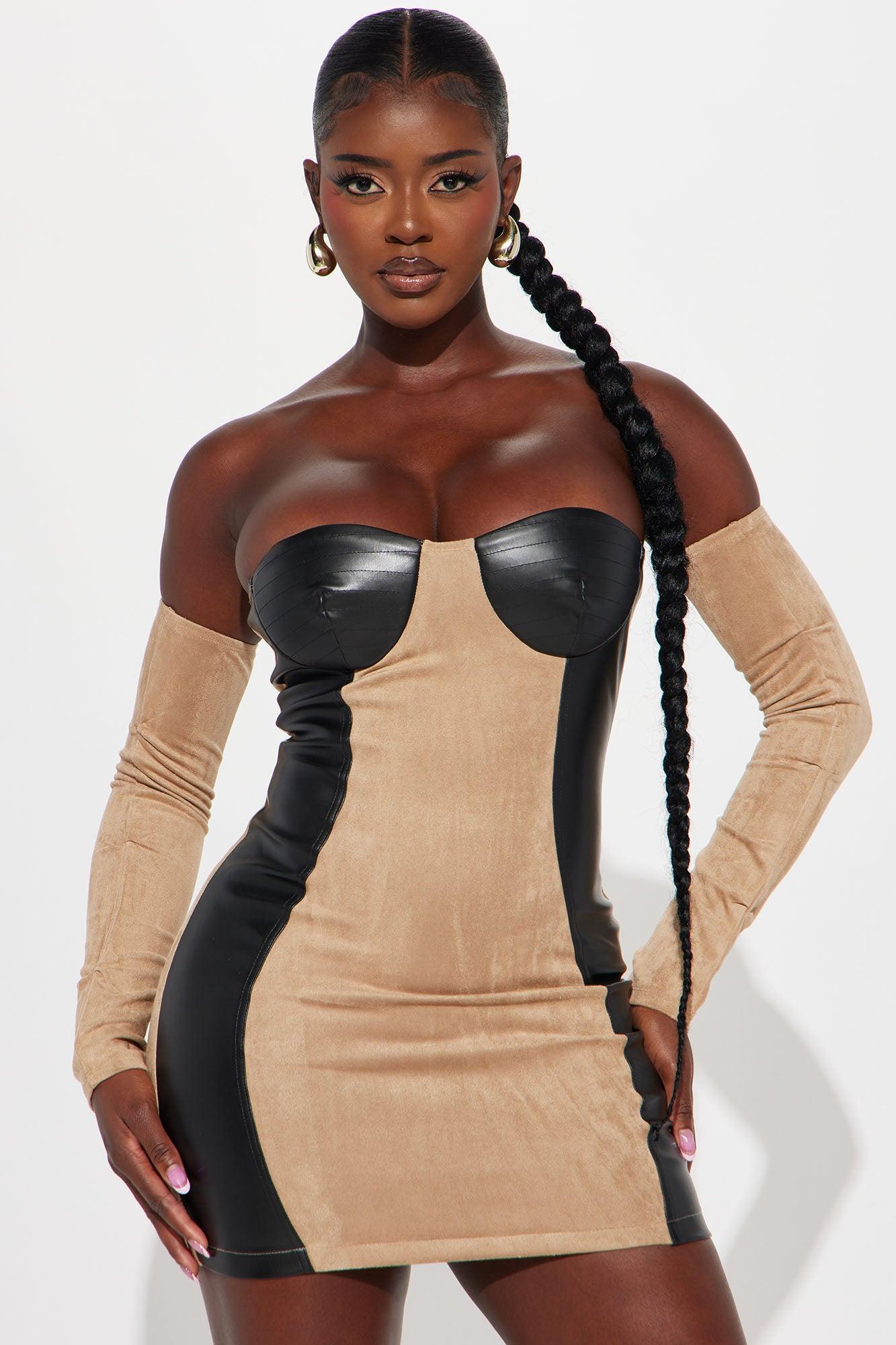 Available In Taupe. Faux Suede Mini Dress Off shoulder Long sleeves Padded bra cups Contrast faux leather trim Back zipper Stretch Self: 92% Polyester 8% Spandex Contrast: 55% Polyester 45% Polyurethane Lining: 100% Polyester Imported California Proposition 65 WARNING: Cancer and Reproductive Harm - www.P65Warnings.ca.gov.
