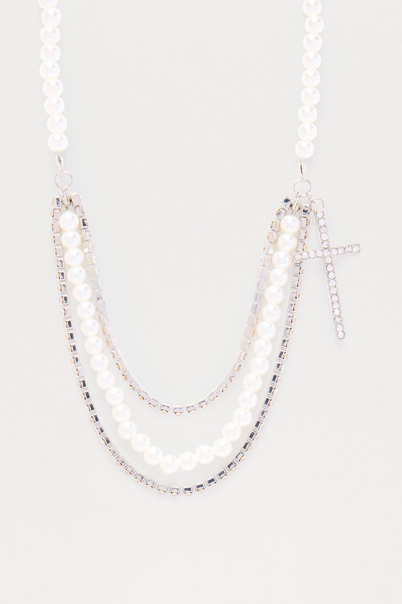 Available In Silver. Layered Necklace Rhinestone Detail Religious Motif Pearl Detail Lobster Clasp Closure Imported California Proposition 65WARNING: Cancer and Reproductive Harm - www.P65Warnings.ca.gov.
