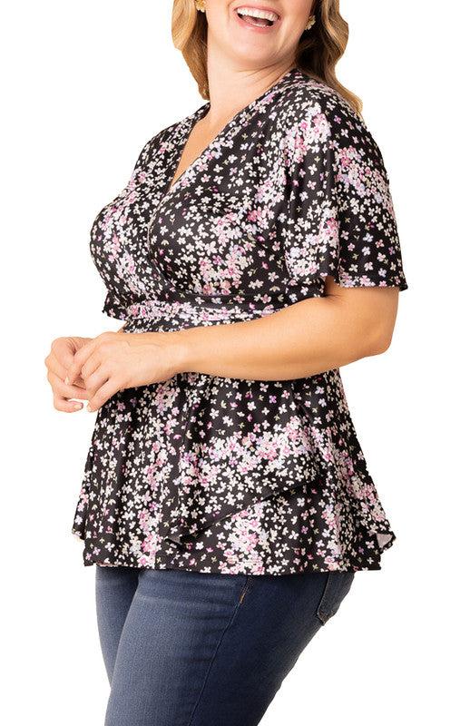 This plus size peplum top boasts design details such as a ruched waistband at the empire waist and a flattering surplice crossover V-neckline for customizable coverage. Elbow-length dolman sleeves allow for an easy and comfortable fit. Available in women's plus sizes.