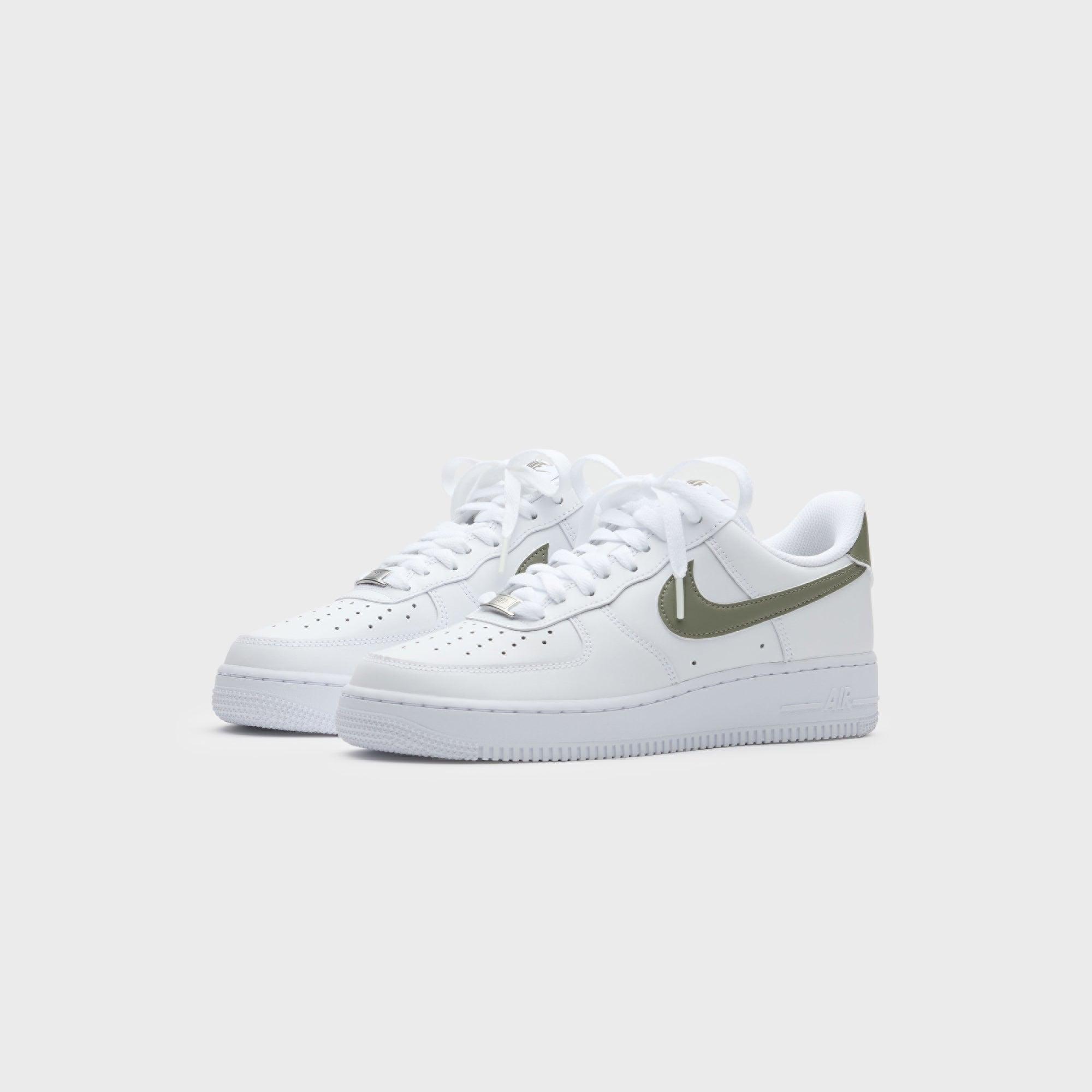 Air Force 1 '07 Ess silhouette Leather upper Padded collar Perforated toe box AF1 lace dubrae Embroidered Nike Air Force 1 woven patch on tongue Swoosh on side panel Embroidered Nike Air branding on rear Flat cotton laces Embossed Air sole unit Foam midsole Rubber outsole Style: nkfj4146-116 Color: White / Light Army Material: Leather