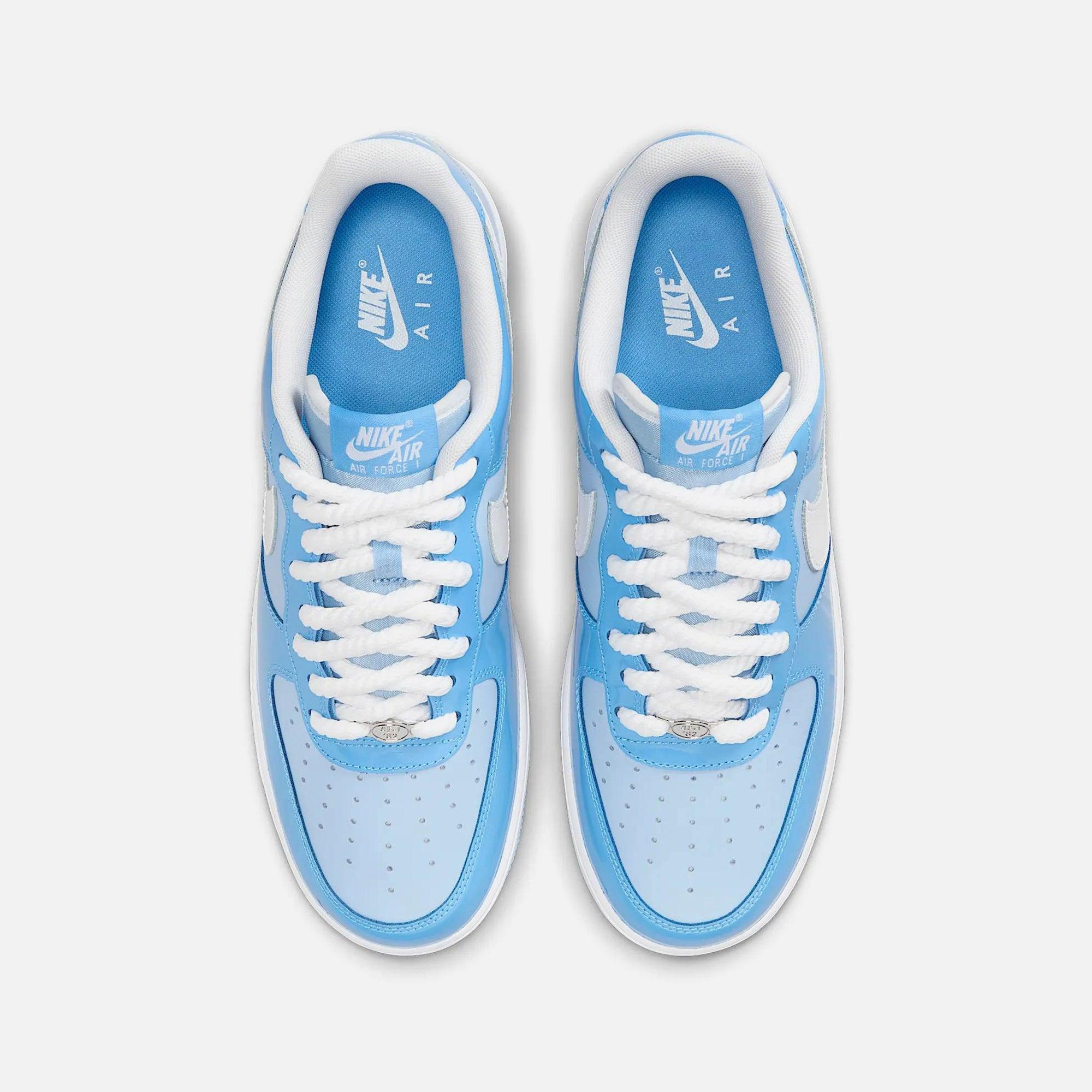 Air Force 1 '07 LV8 silhouette Leather upper Padded collar Perforated toe box Nike Air Force 1 logo patch on tongue Swoosh on side panel Nike Air branding on heel tab Contrast stitching details Flat cotton laces Air sole unit Foam midsole Rubber outsole Style: nkhv9405-400 Color: Psychic Blue / University Blue / White Material: Leather