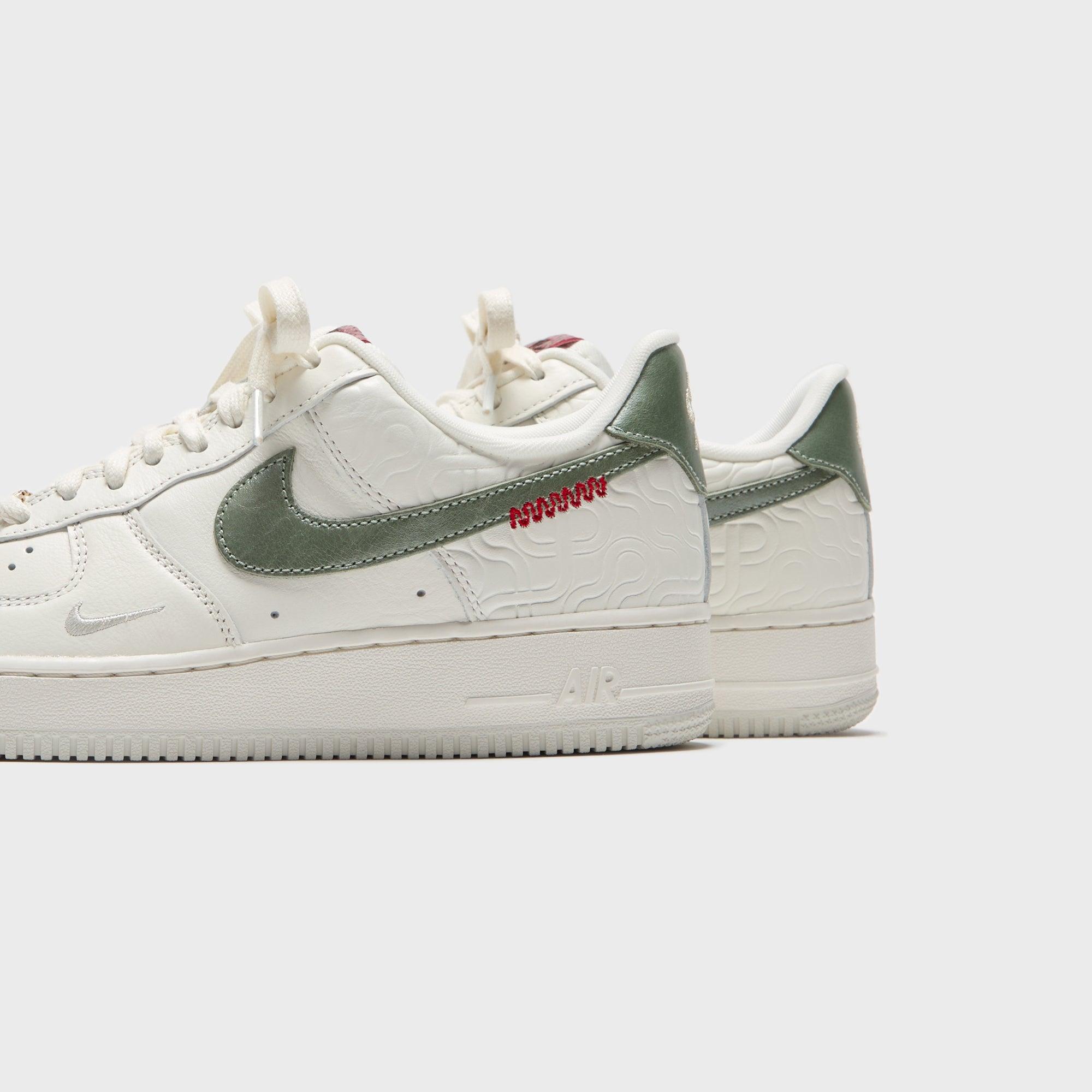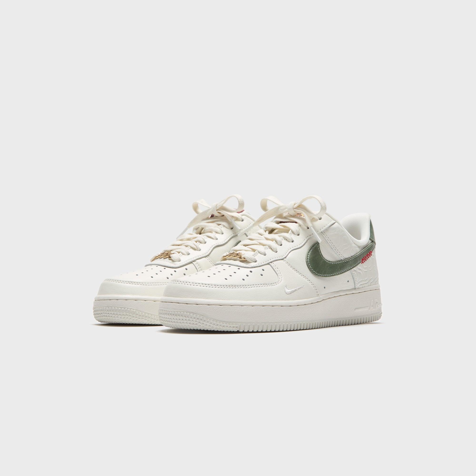 Air Force 1 Low silhouette Leather upper Padded collar Metal tag with AF1 branding on front Nike Air Force 1 logo on mesh tongue Swoosh on side panel Red stitching details near swoosh Debossed Nike AIR logo on rear Flat cotton laces Air-cushioned midsole unit Nike Air sole unit Rubber outsole Style: nkhv5979-130 Color: Sail / Jade Horizon / Light Bone / University Red / Metallic Gold Material: Leather