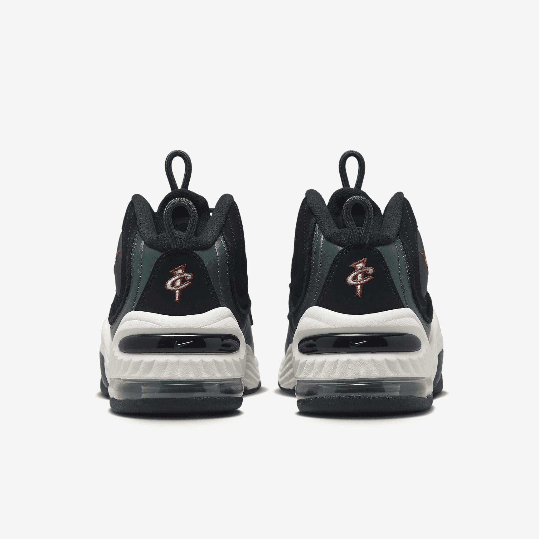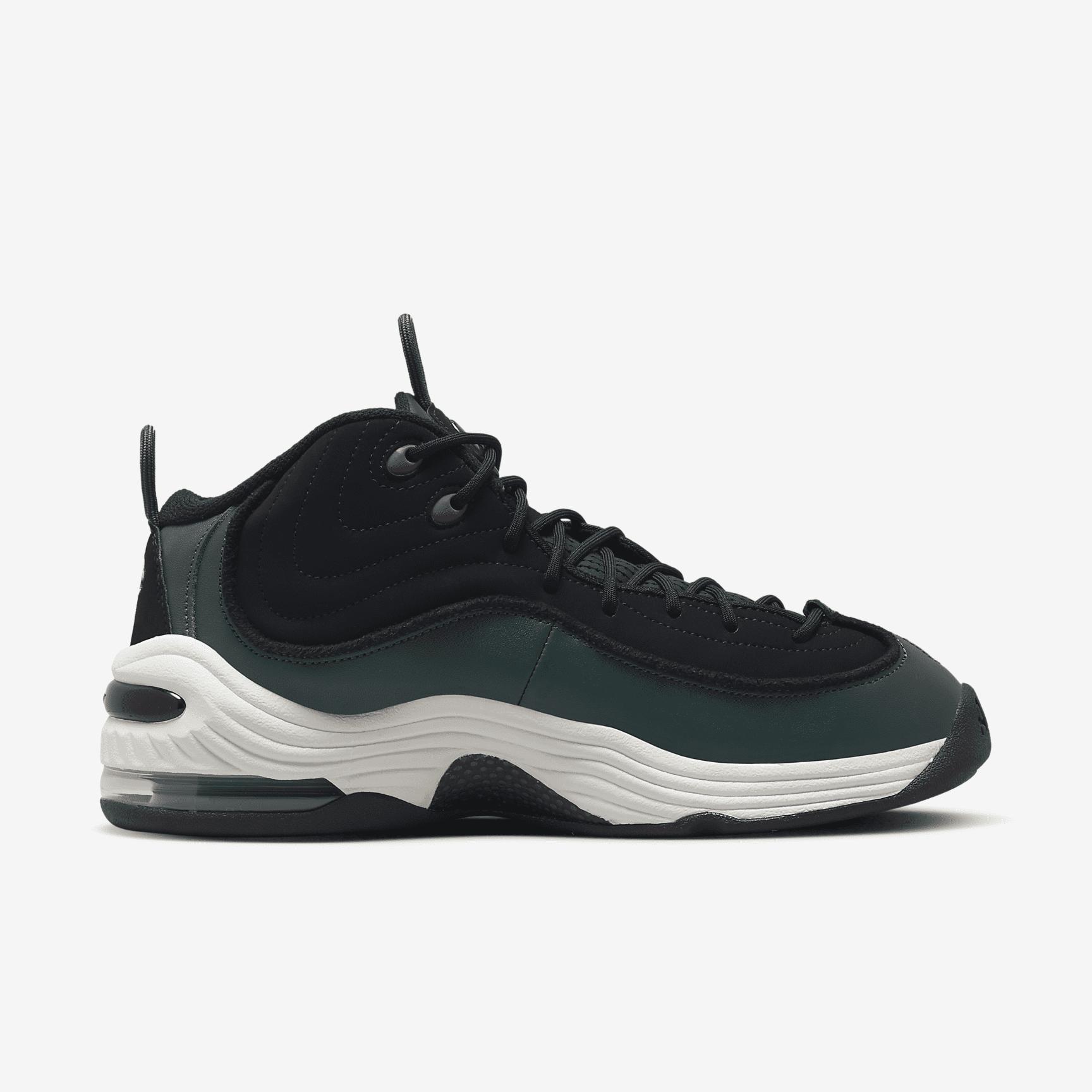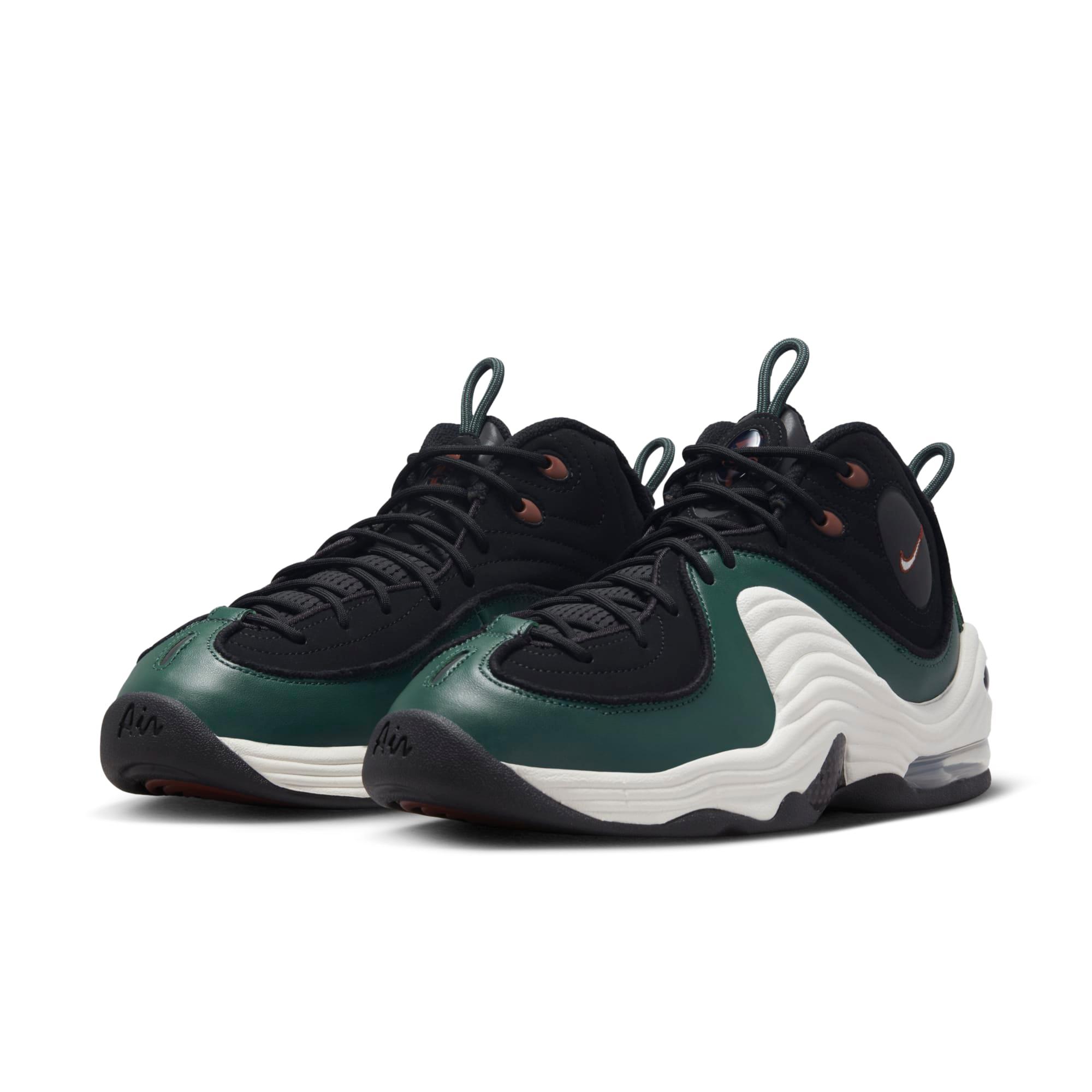 For hardcore Penny devotees and those just looking to refresh their off-court game, the Air Penny 2 is the slick assist your outfit calls for. Echoing the original, this pair ups the magic with premium leather and sculpted foam done in artisan colors. The iconic �1 cent� logo adds our stamp of approval, while visible Nike Air cushioning delivers coveted, all-star comfort. Benefits: Originally designed for performance hoops, Nike Air cushioning in the heel and forefoot bring you world-class comfort. Leather upper adds durability and a premium look. Sculpted foam around the midfoot adds stability and iconic Penny style. Rubber outsole delivers traction and durability. Product Details: Round laces. Pull loops at tongue and heel. Not intended for use as Personal Protective Equipment (PPE). Style: DV3465; Color: Black/Dark Pony/Sail/Faded Spruce; Size: 4.5; Gender: Male; Age Group: Adult | Nike Air Penny 2 Men's Shoes in Black, Size: 4.5 | DV3465-001