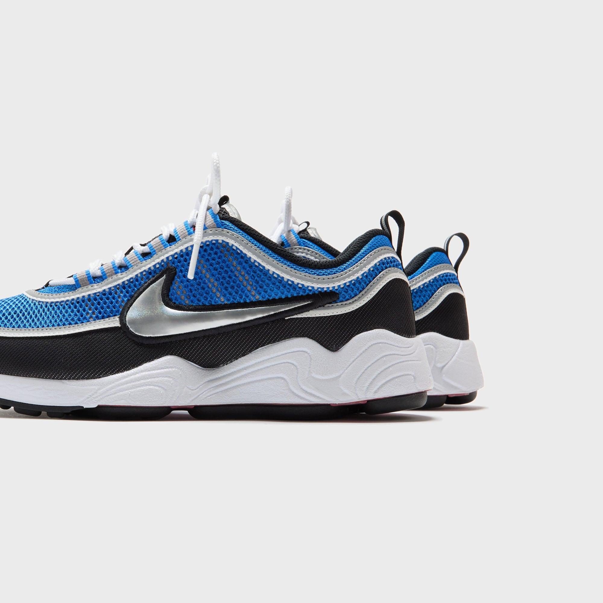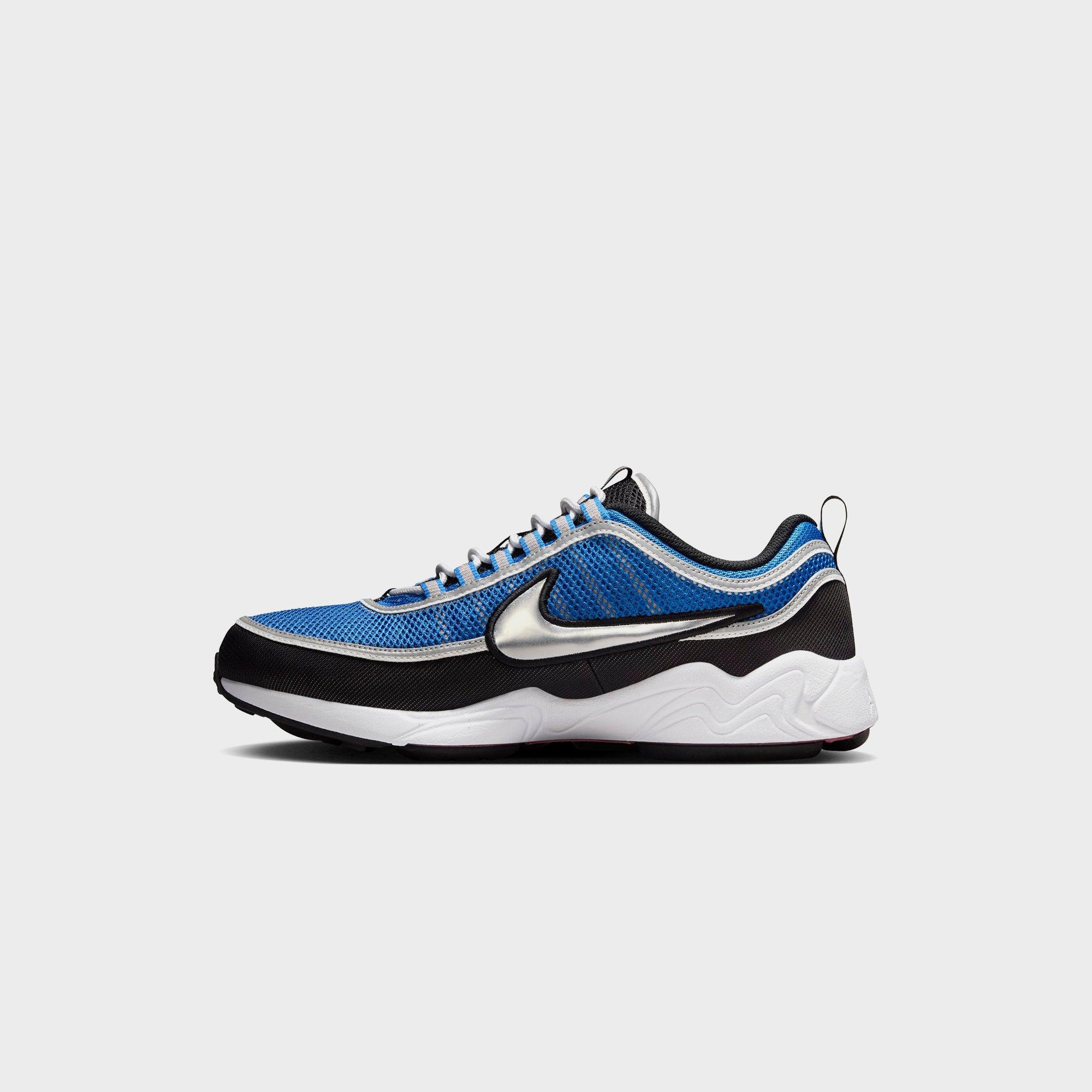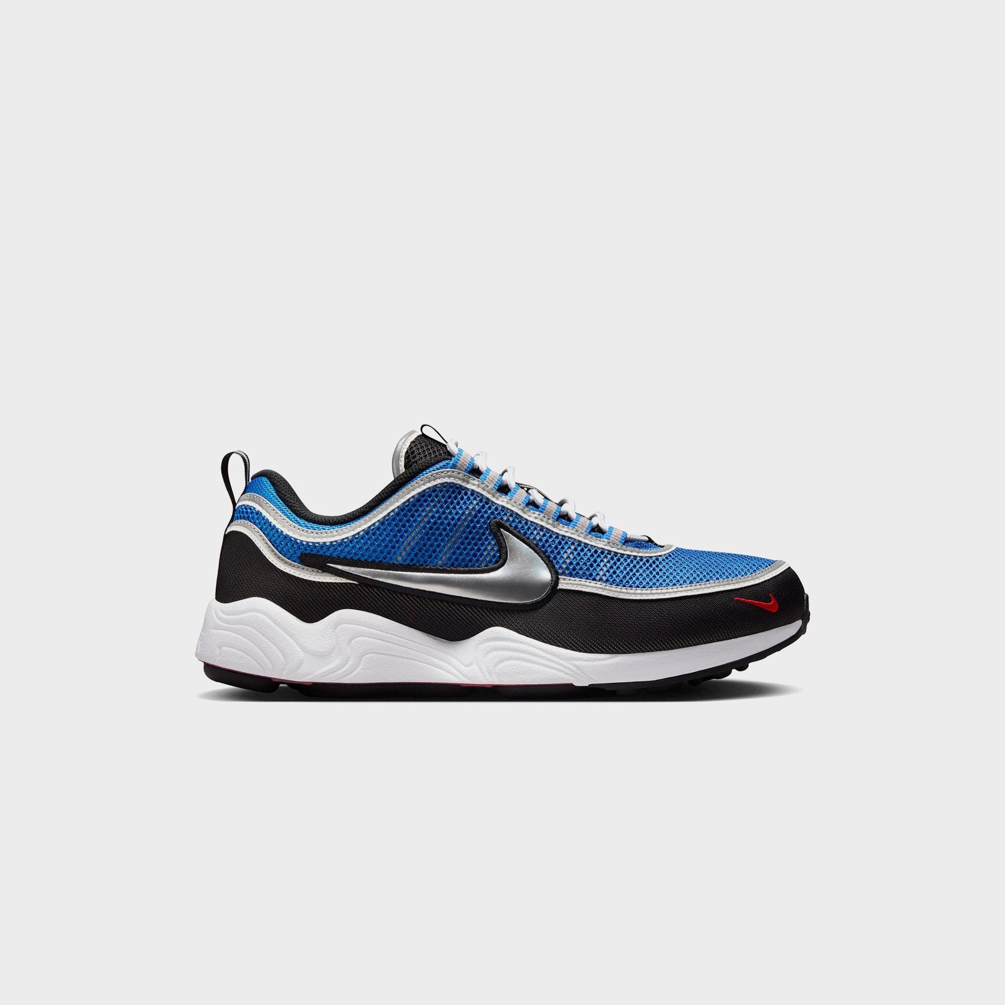 Air Zoom Spiridon silhouette Mesh upper Leather overlays Padded collar Reflective 3M accents Embroidered mini swoosh on ankle and tongue Metallic swoosh on lateral sides Reflective pull tab Webbing rope lace system Zoom air cushioning Air sole unit Rubber outsole Style: nkhf9117-400 Color: Signal Blue / Metallic Luster / Black / White / University Red Material: Mesh / Leather