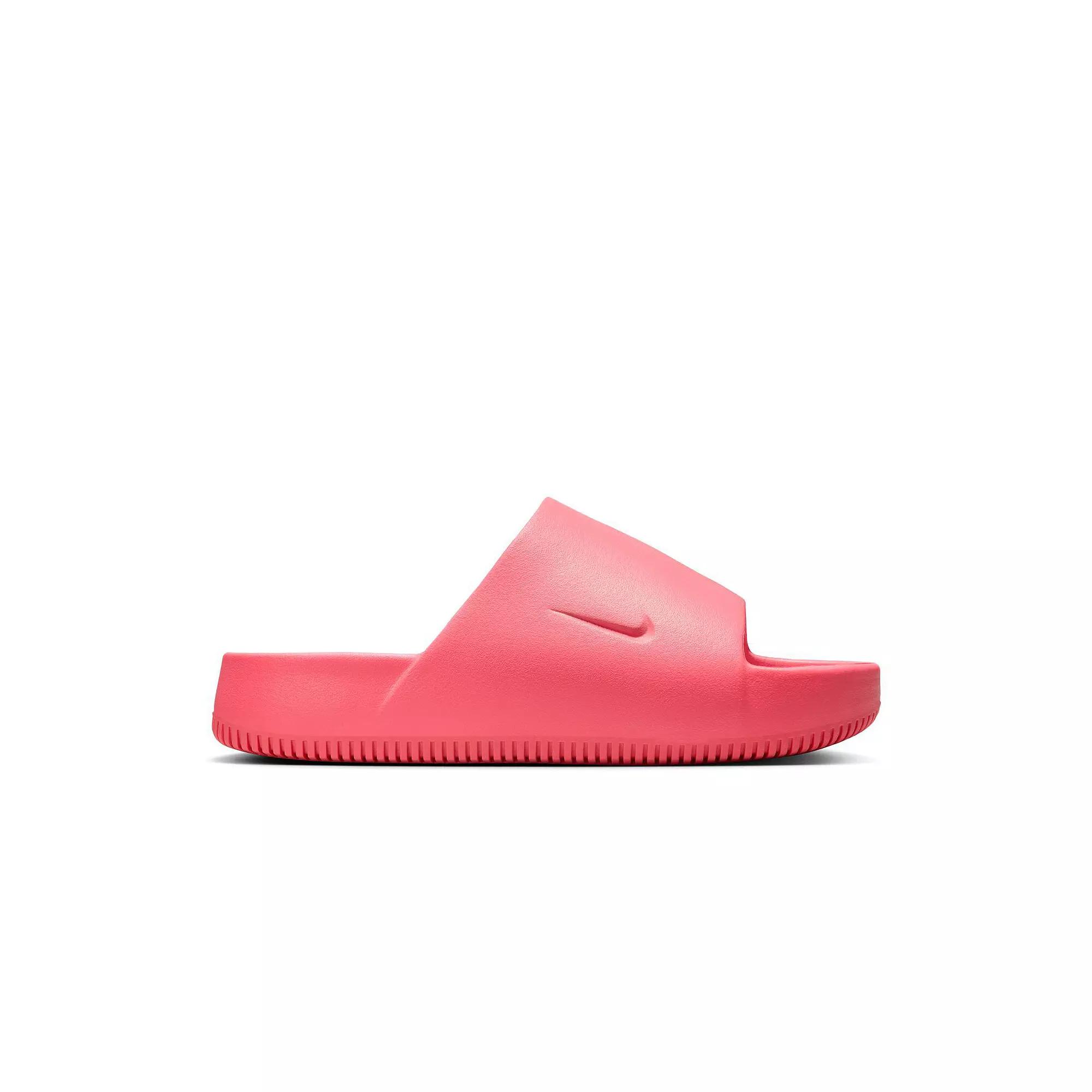 Nike Calm Women's Slide Sandal Dial down your stress in the Calm women's Slide Sandal from Nike. Featuring a water-friendly, single piece upper with a contoured fit for a soothing feel, this Slide works everywhere from the streets to the pool. The foam footbed cradles your foot while the subtly textured outsole adds some traction. Made with at least 20% recycled content by weight. Move to Zero: a journey toward zero carbon & zero wasteSlip-On SeamlessContoured footbed Rubber outsole