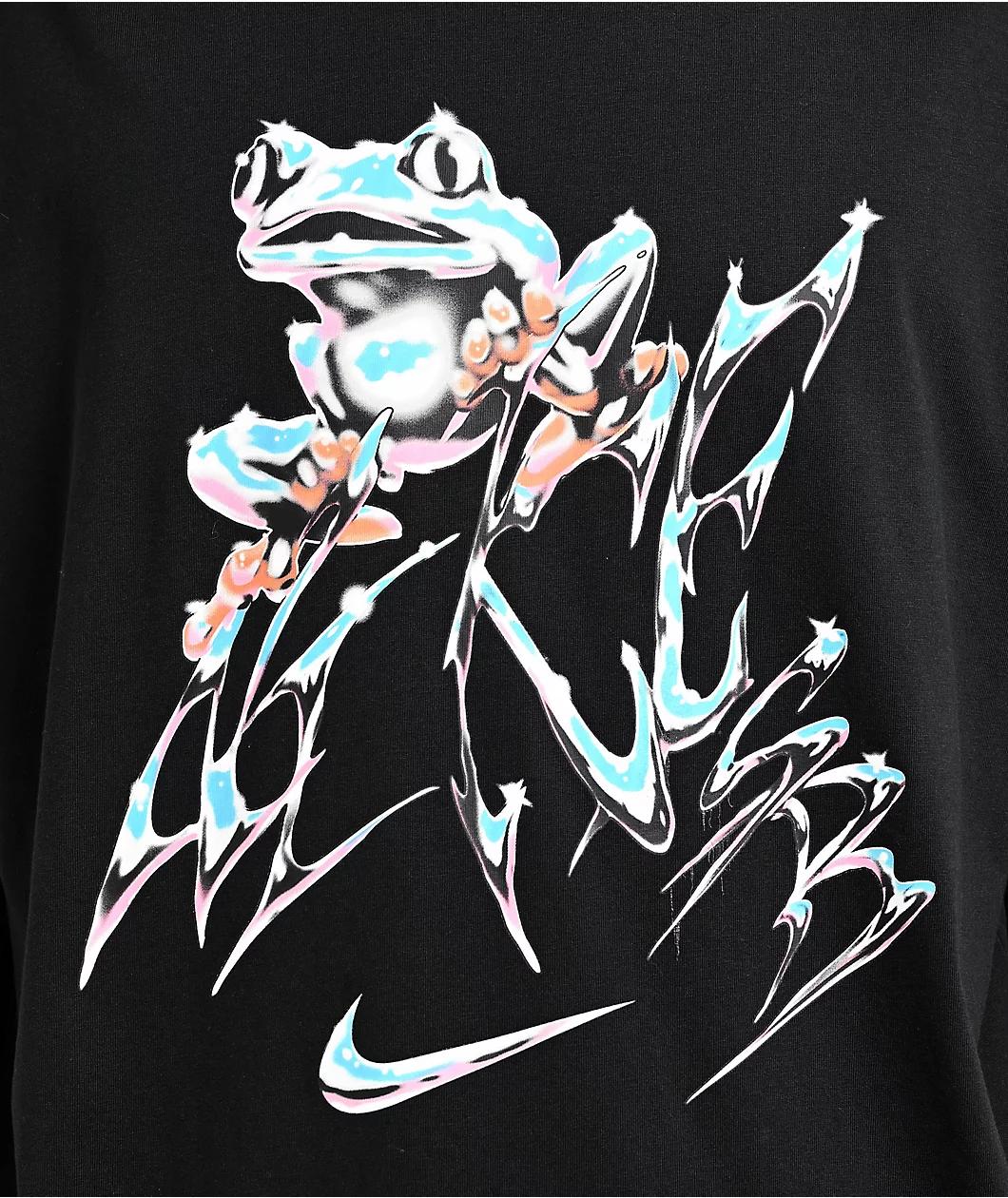 Featuring art from Lazy Gawd, this black Nike t-shirt is one of a kind. Airbrush art of a frog standing on top of the Nike name and logo has a unique multicolor chrome look and stands out in any casual outfit.