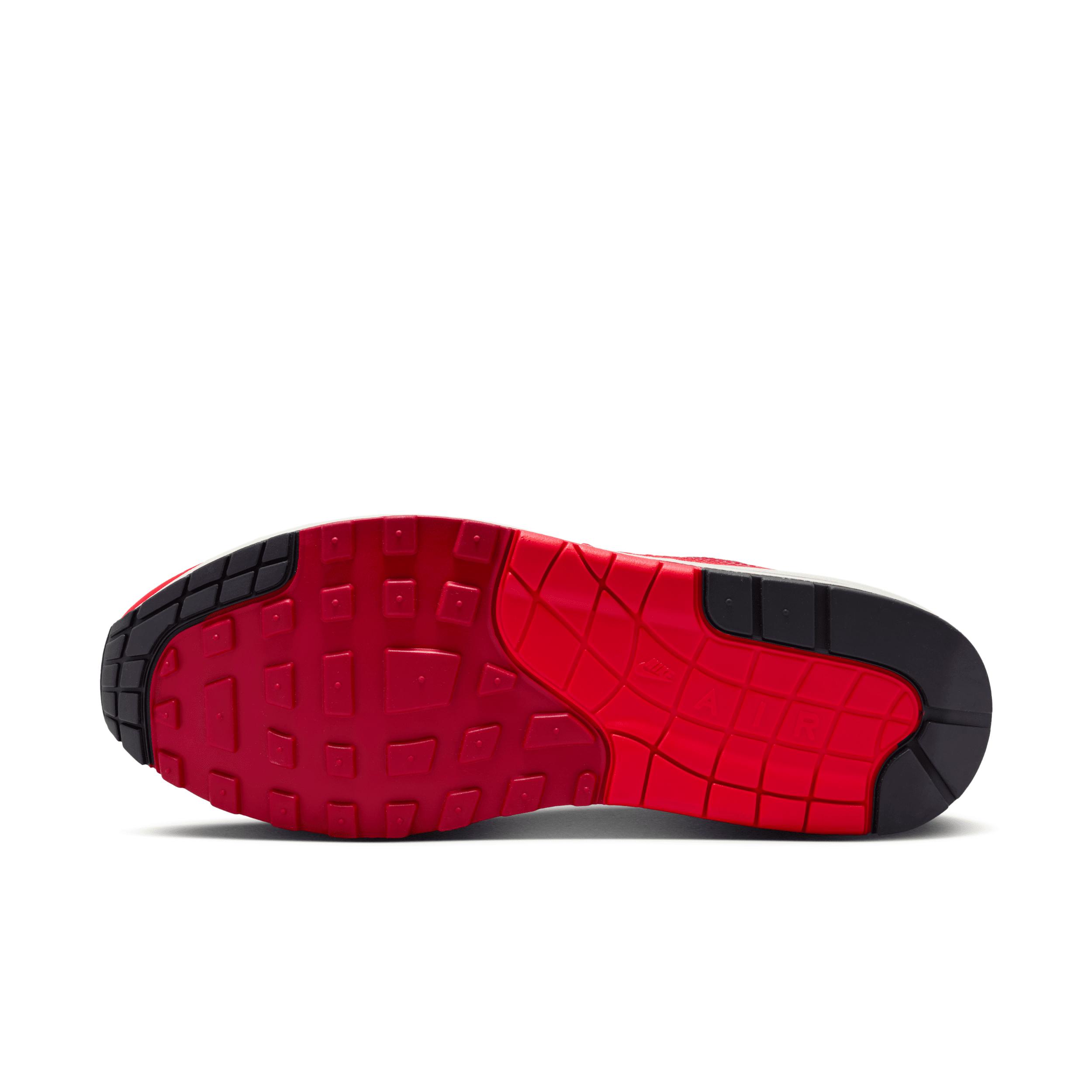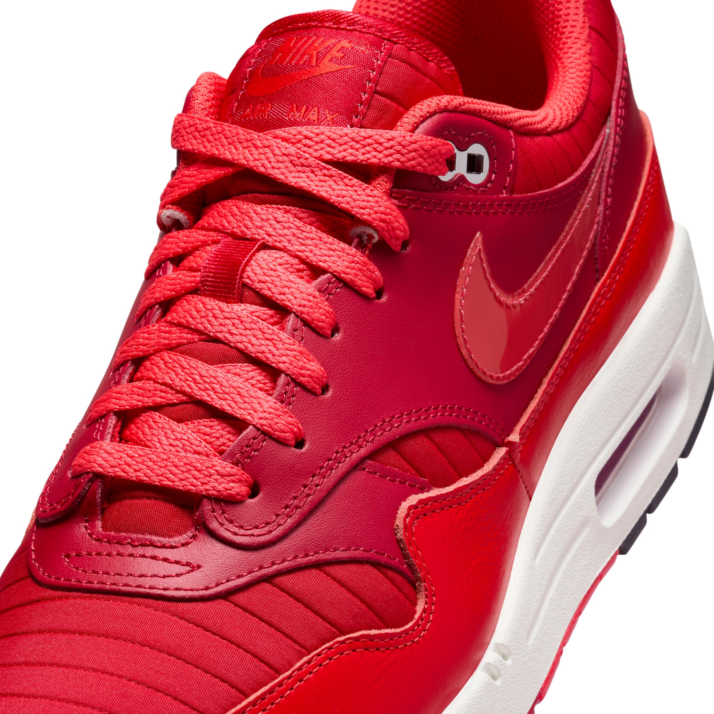 The first shoe to use Max Air technology is still displaying the decades of innovation that make it as classic as it is comfortable. The proof? You're looking through it. This version pairs smooth and shiny leather with quilted accents to take the icon to the next chapter. Benefits:Upper combines textile and premium leather for a layered look built to last. Max Air unit in the heel and Nike Air in the forefoot provide lightweight cushioning. Rubber Waffle outsole adds traction, durability and heritage styling. Product Details:Padded collar. Foam midsole. Style: HQ3607; Color: Gym Red/University Red/Light Crimson/Sail; Size: 13; Gender: Male; Age Group: Adult | Nike Air Max 1 Men's Shoes in Red, Size: 13 | HQ3607-687
