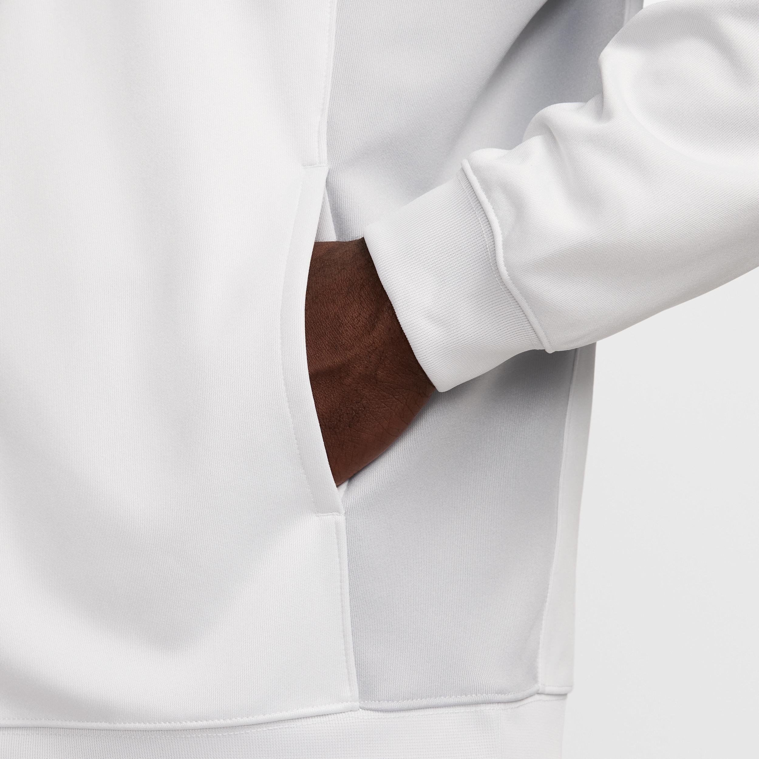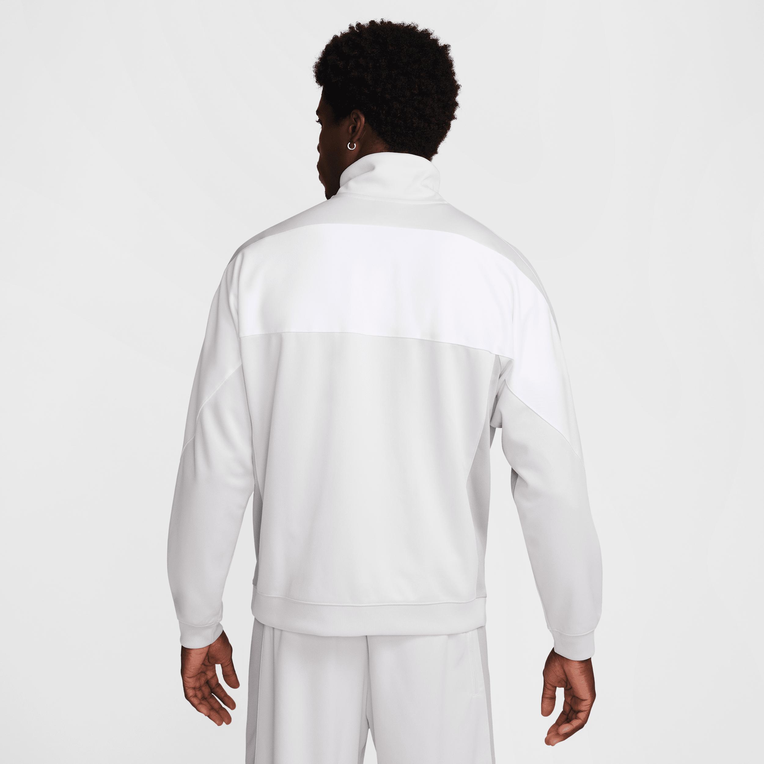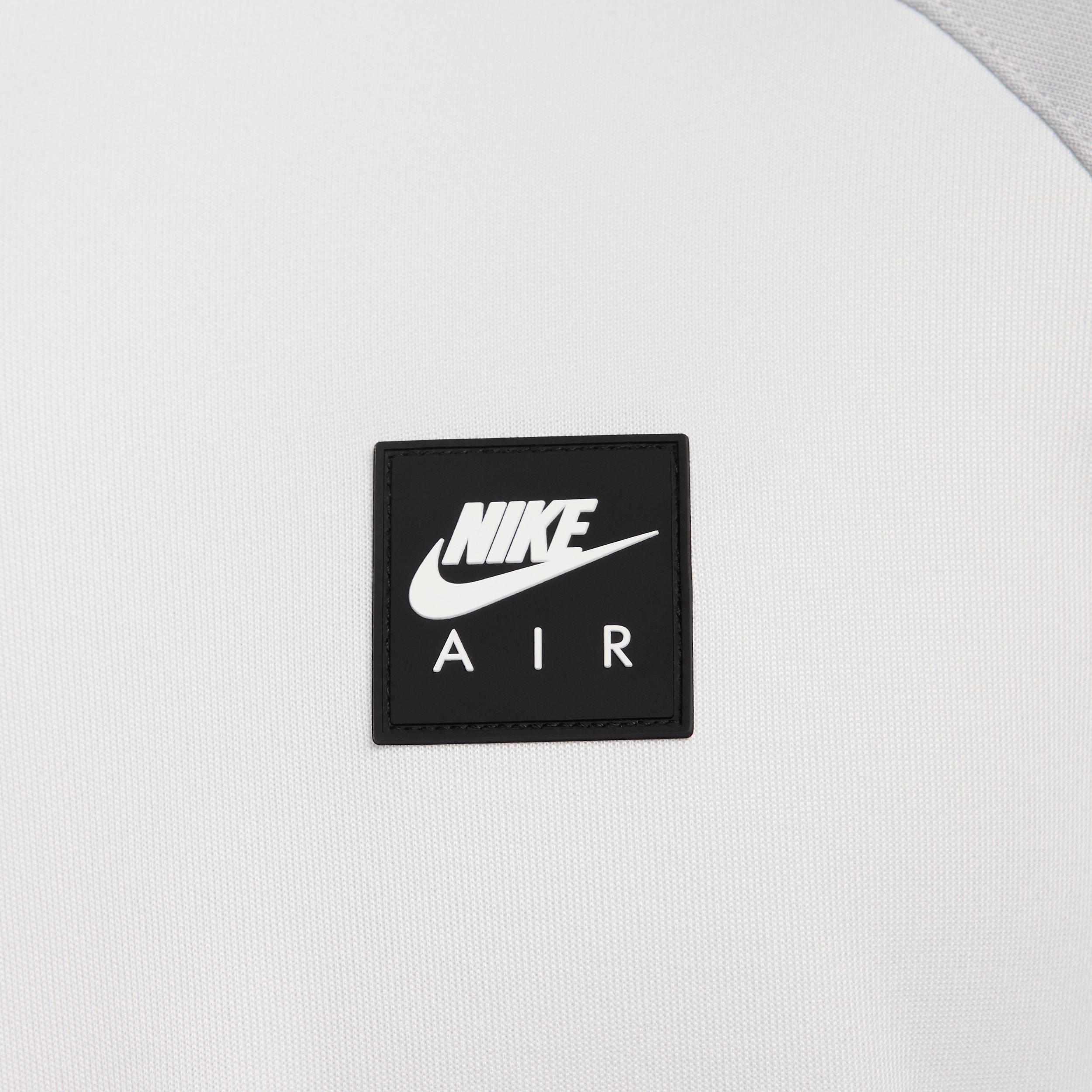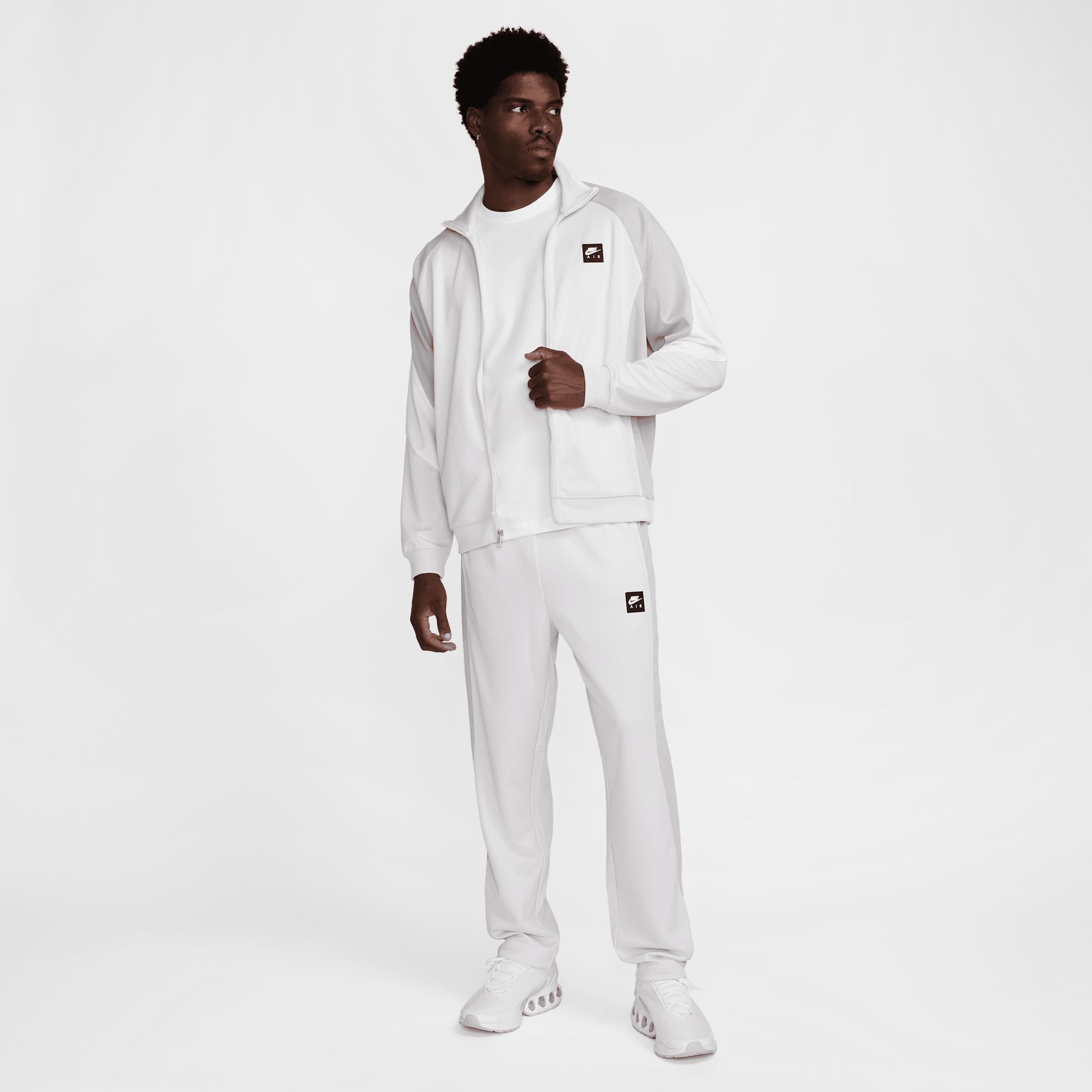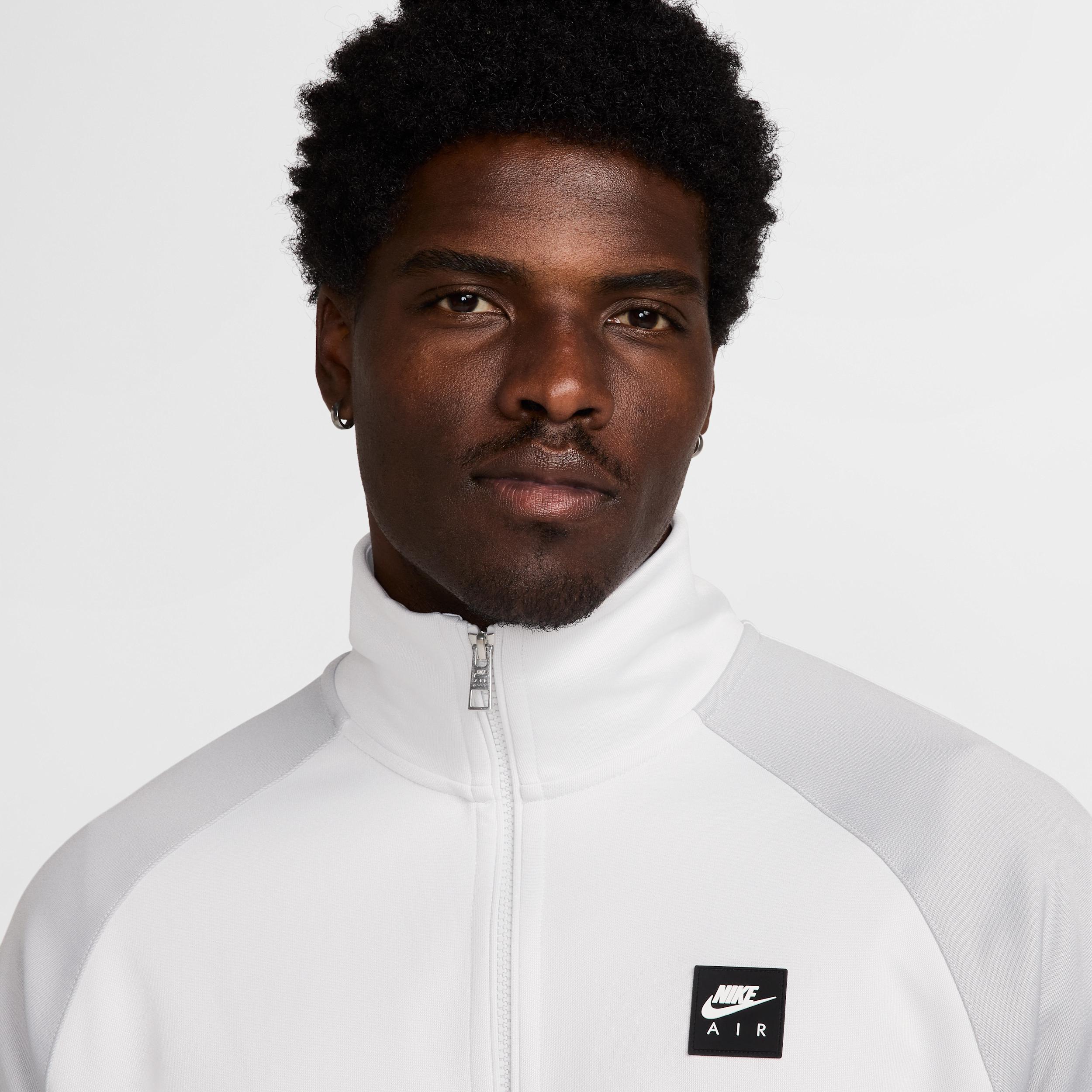 Dial up your casual attire with this soccer-inspired jacket. Its roomy fit is crafted with a thick, knit fabric that's grounded in sport. Product Details:Nike Air silicone patch. Body: 100% polyester; Rib: 98% polyester/2% spandex. Machine wash. Imported. Style: HJ0632; Color: Photon Dust/Light Smoke Grey/White/Black; Size: S; Gender: Male; Age Group: Adult | Nike Air Men's Poly-Knit Full-Zip Jacket in Grey, Size: Small | HJ0632-009