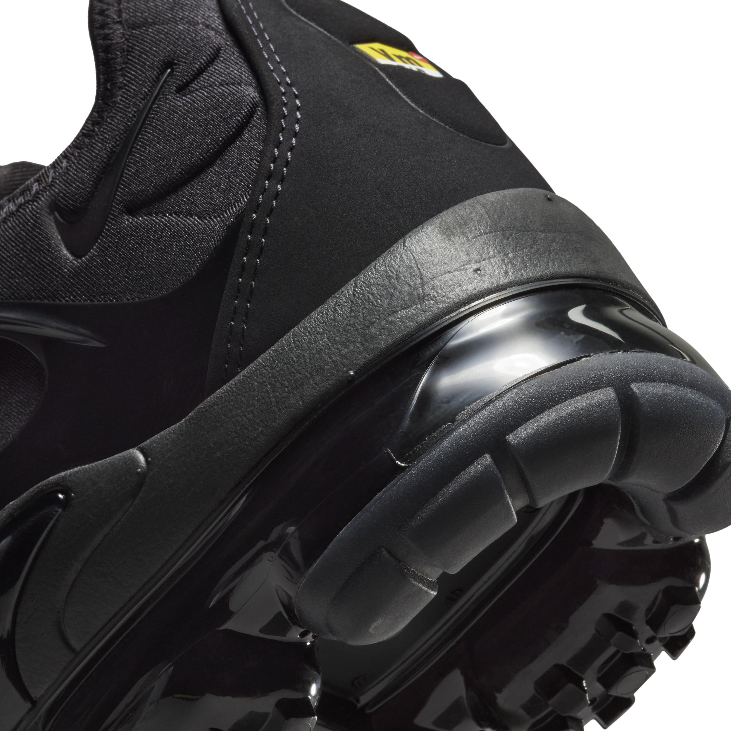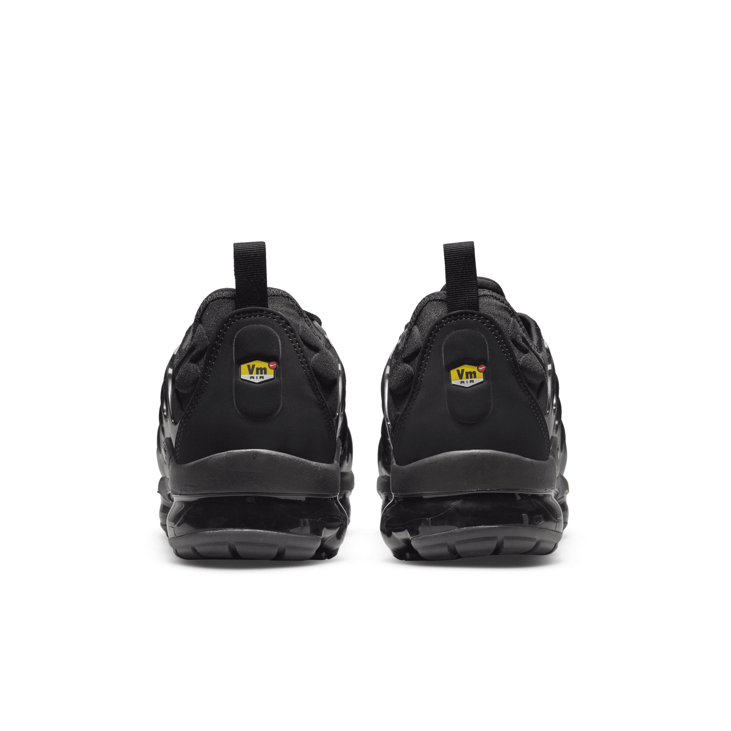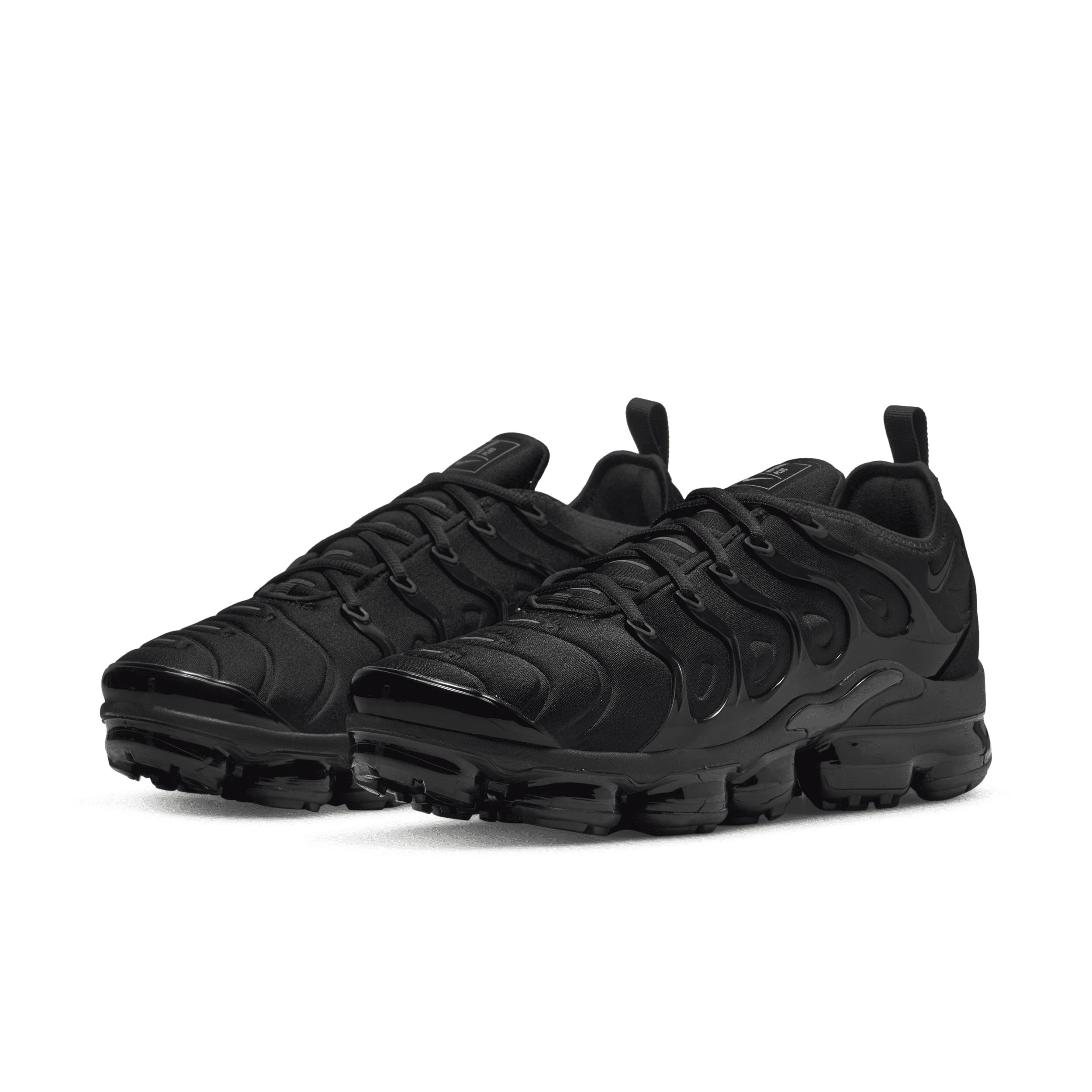 The Nike Air VaporMax Plus looks to the past and propels you into the future. Nodding to the 1998 Air Max Plus with its floating cage, padded upper and heel logo, it adds revolutionary VaporMax Air technology to ramp up the comfort and create a modern look. Benefits: Bringing beach life to the city, the prominent arch draws inspiration from a whale's tail and adds structure while the iconic wavy fingers nod to palm trees and ocean waves. Originally designed for performance running, Nike Air units provide lightweight cushioning that lasts. Bold, gradient colors add heritage style to this powerhouse Air Max. Synthetic upper adds lightweight comfort and durability. Full-length rubber outsole adds traction and durability to your journey. Product Details: Pull tab. Reflective details. Not intended for use as Personal Protective Equipment (PPE). Style: 924453; Color: Black/Black/Dark Grey; Size: 12; Gender: Male; Age Group: Adult | Nike Air VaporMax Plus Men's Shoes in Black, Size: 12 | 924453-004