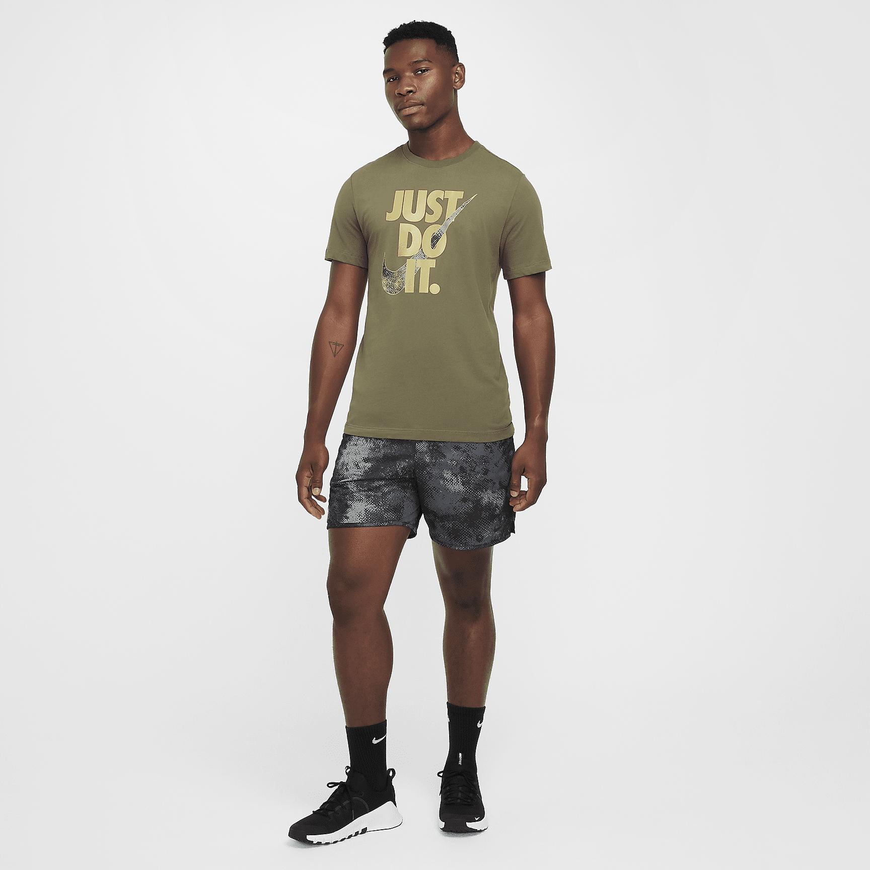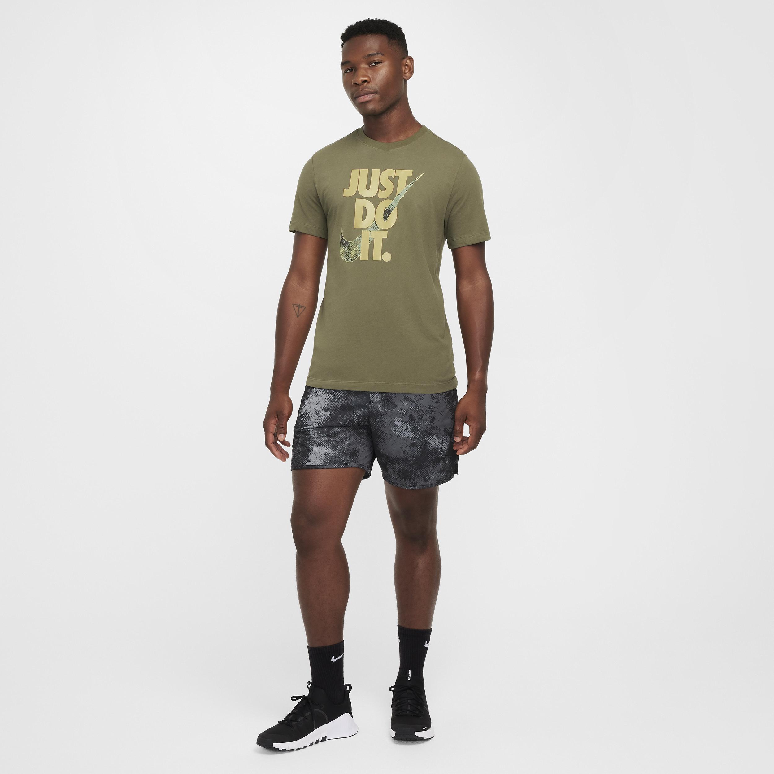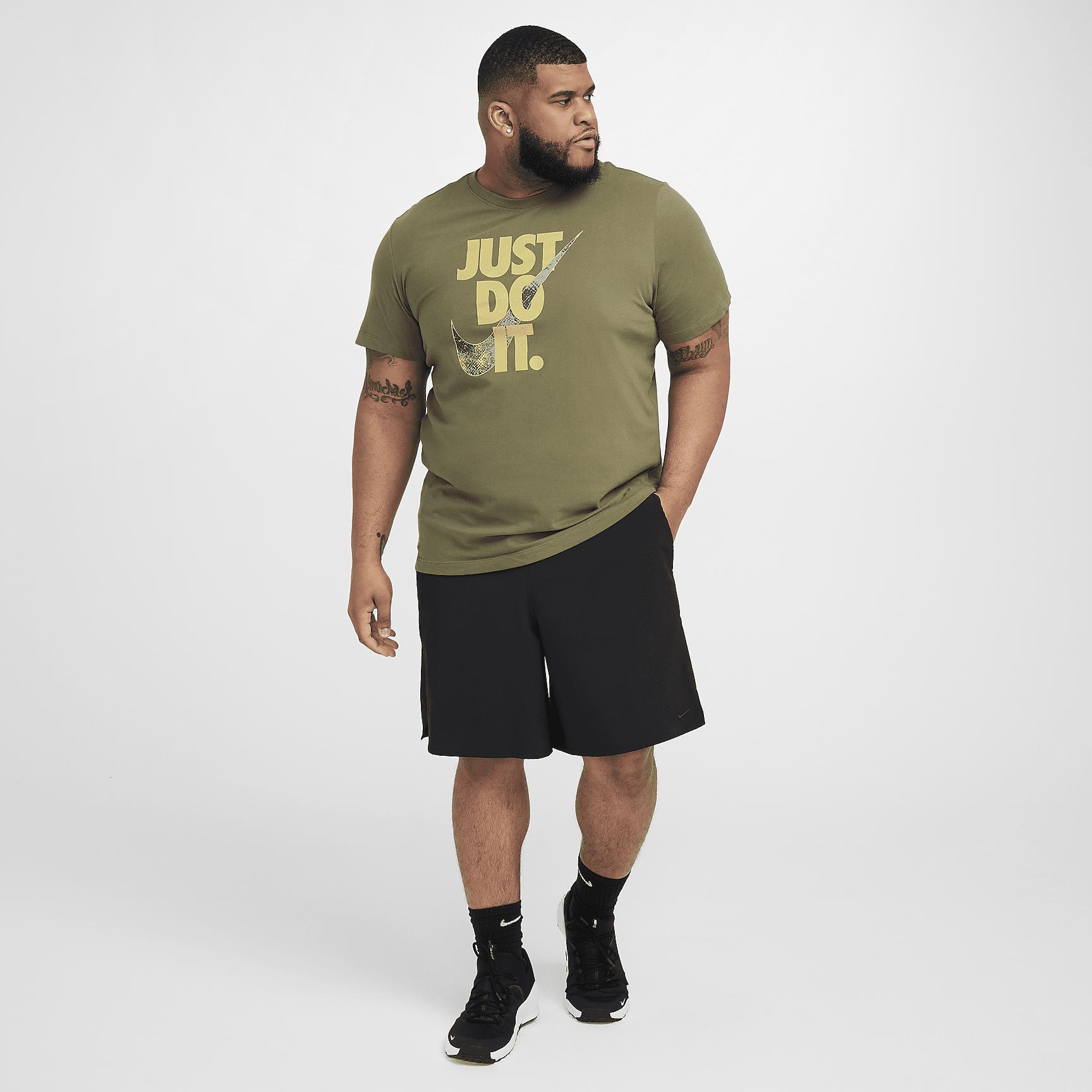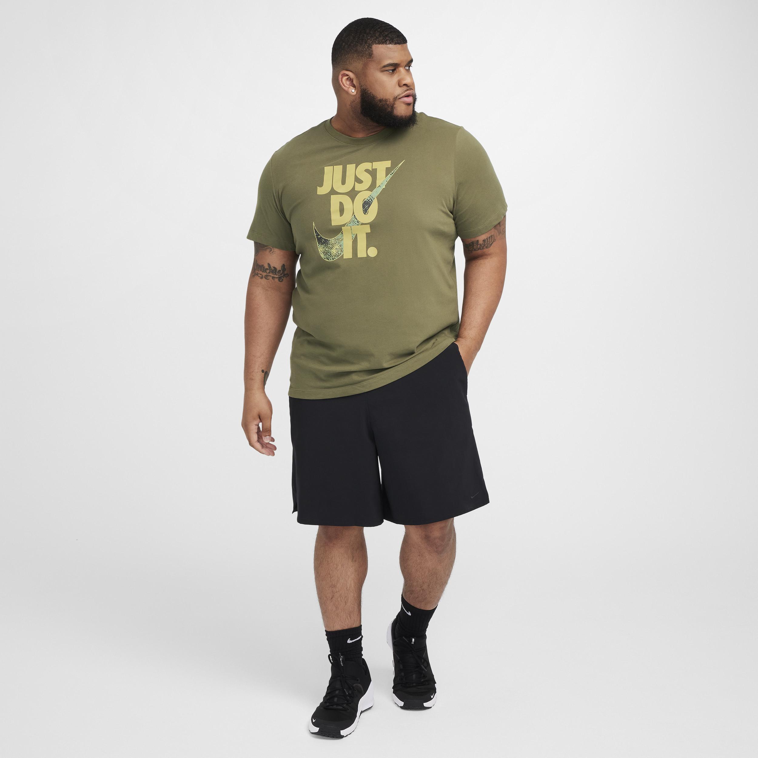 Built for working out, this classic fit tee is made with soft and breathable cotton-poly blend fabric. Nike Dri-FIT technology moves sweat away from your skin for quicker evaporation, helping you stay dry and comfortable. [] Product Details:57% cotton/43% polyester. Machine wash. Imported. Style: HF6139; Color: Medium Olive; Size: L; Gender: Male; Age Group: Adult | Nike Men's Dri-FIT Short-Sleeve Fitness T-Shirt in Green, Size: Large | HF6139-222