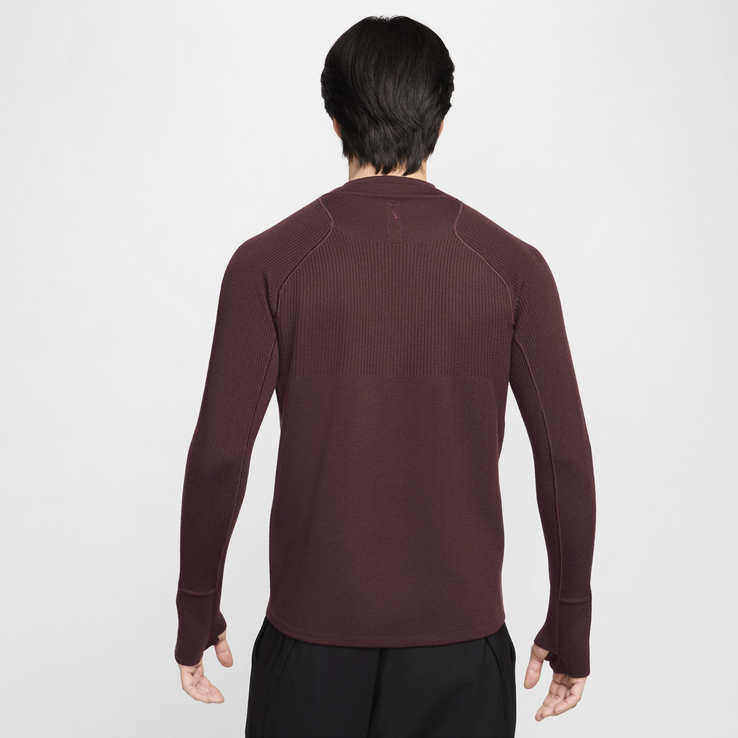 Every Stitch Considered brings intentionality and craft to your wardrobe. This long-sleeve top offers a computational knit construction for targeted mobility and breathability. It features a high neck, thumbholes at the sleeves and dramatic stitching for a sleek, elevated look. Product Details:100% wool. Machine wash. Imported. Style: FD6477; Color: Burgundy Crush; Size: XL; Gender: Male; Age Group: Adult | Nike Every Stitch Considered Men's Long-Sleeve Computational Knit Top in Red, Size: XL | FD6477-610