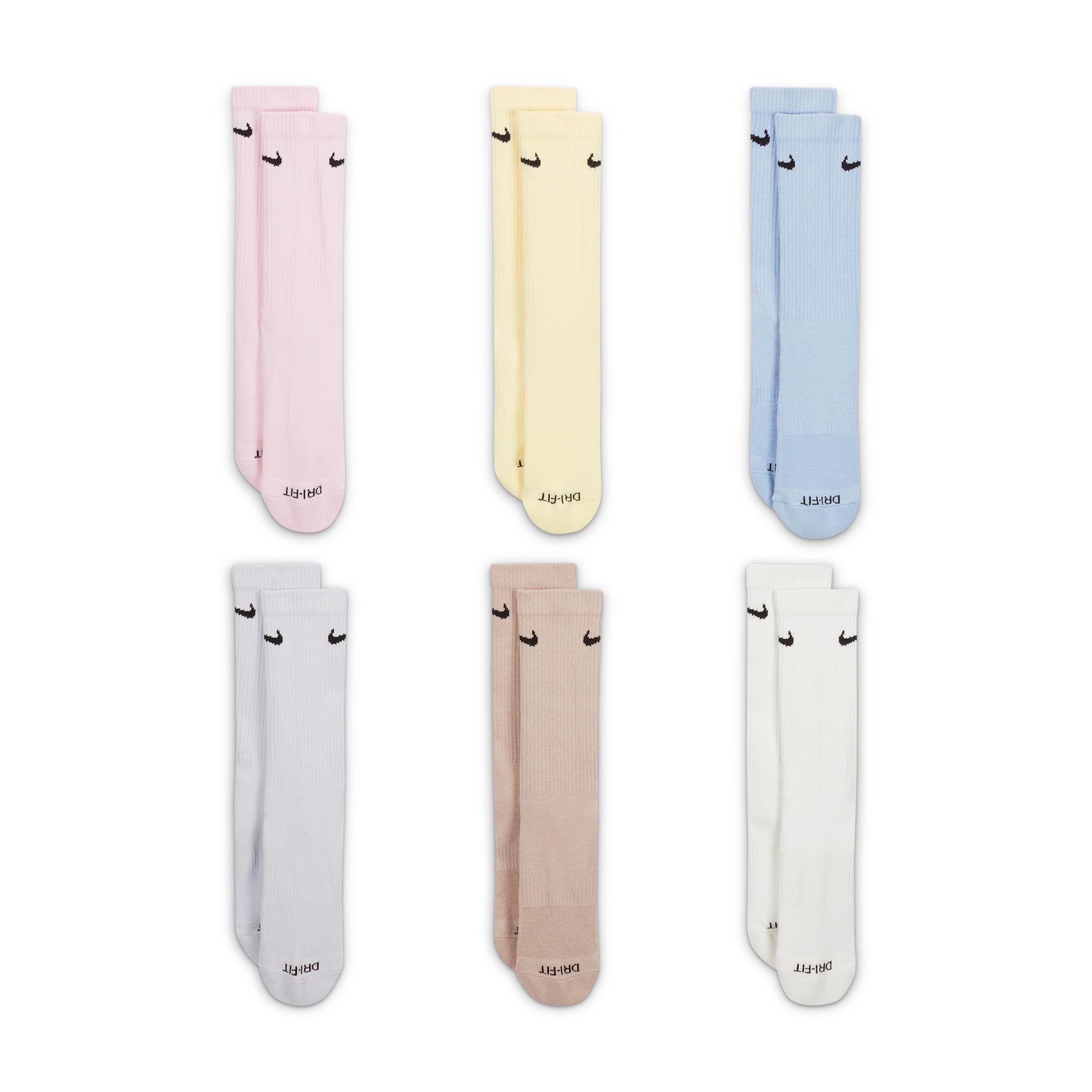 COMFORT PLUS SUPPORT. The Nike Everyday Plus Cushioned Socks bring comfort to your workout with extra cushioning under the heel and forefoot and a snug, supportive arch band. Sweat-wicking power and breathability up top help keep your feet dry and cool to help push you through that extra set. Benefits: Cushioning under the forefoot and heel helps soften the impact of your workout. Dri-FIT technology helps your feet stay dry and comfortable. Band around the arch feels snug and supportive. Breathable knit pattern on top adds ventilation. Reinforced heel and toe are made to last. Product Details: Fabric: 61-67% cotton/30-36% polyester/2% spandex/1% nylon. Machine wash. Imported. Note: Material percentages may vary slightly depending on color. Check label for actual content. Style: SX6897; Color: Multi-Color; Size: M; Gender: Male; Age Group: Adult | Nike Everyday Plus Cushioned Training Crew Socks (6 Pairs) in Multi-Color, Size: Medium | SX6897-906