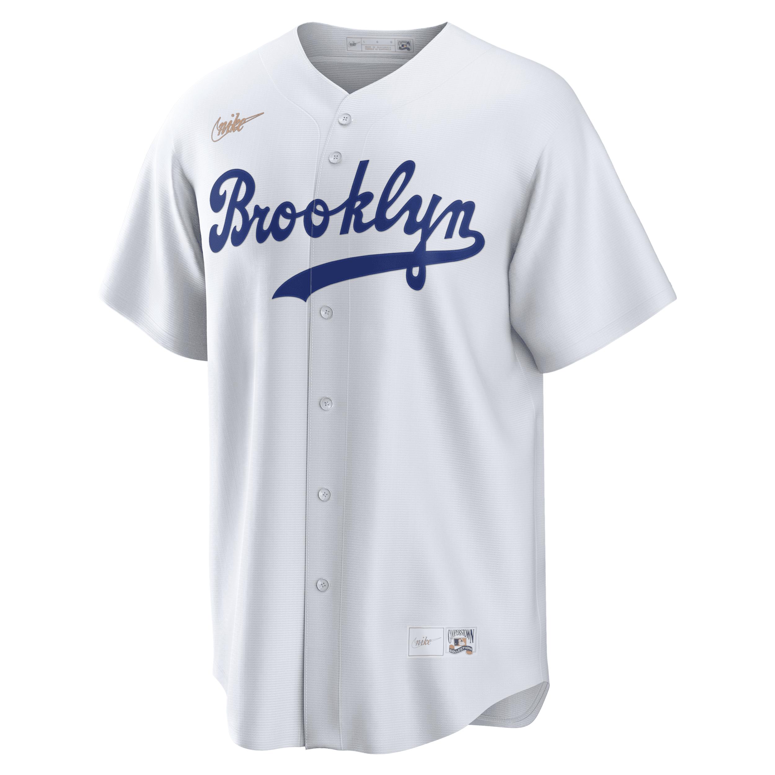 A CLASSIC JERSEY. The MLB Los Angeles Dodgers (Jackie Robinson) Jersey reps your team with a throwback design. Its breathable polyester mesh helps you stay focused on the game. Product Details:100% poly offset mesh. Machine wash. Imported. Style: C267KBWWQBK; Color: White; Size: S; Gender: Male; Age Group: Adult | Nike MLB Los Angeles Dodgers (Jackie Robinson) Mens Cooperstown Baseball Jersey in White, Size: Small | C267KBWWQBK-UCP