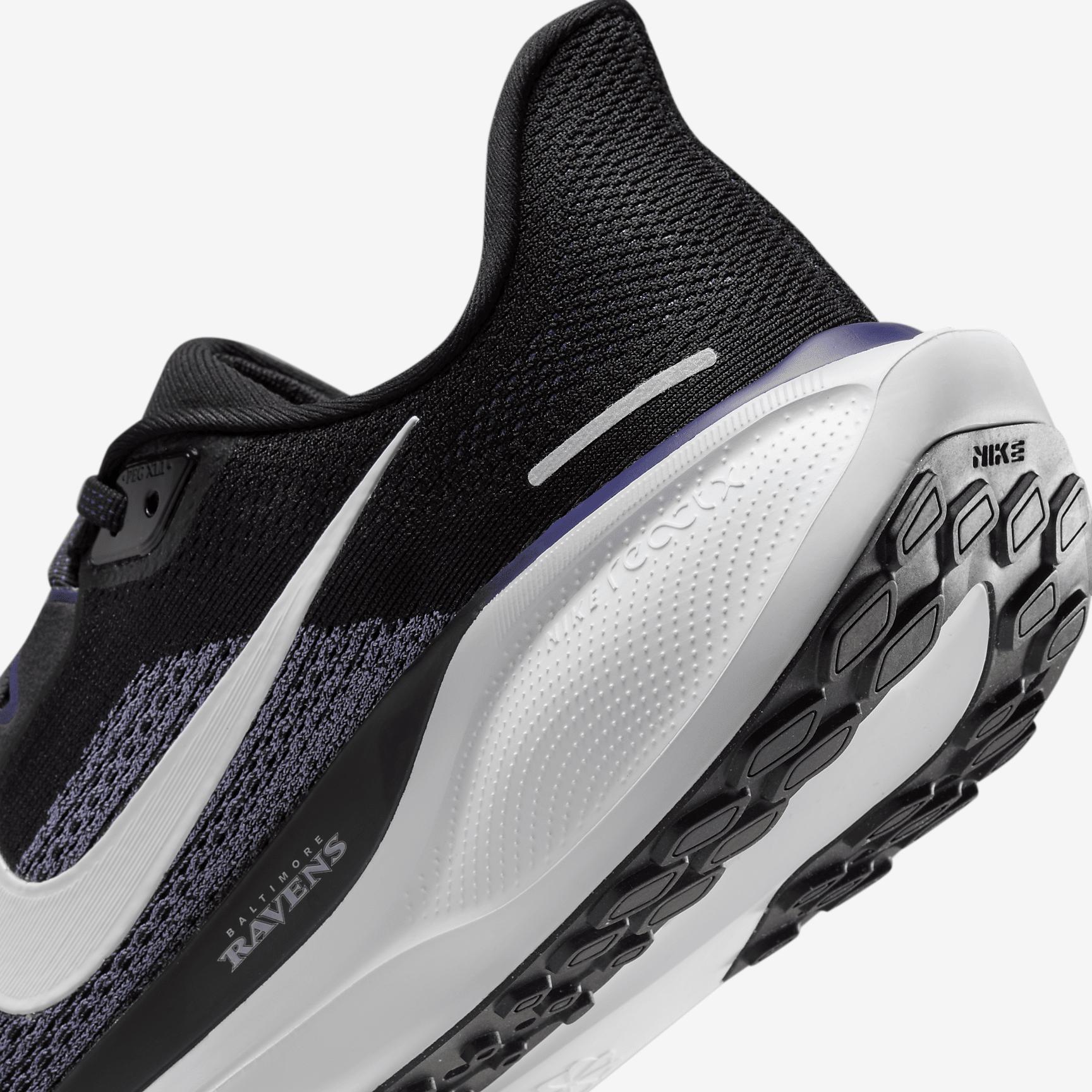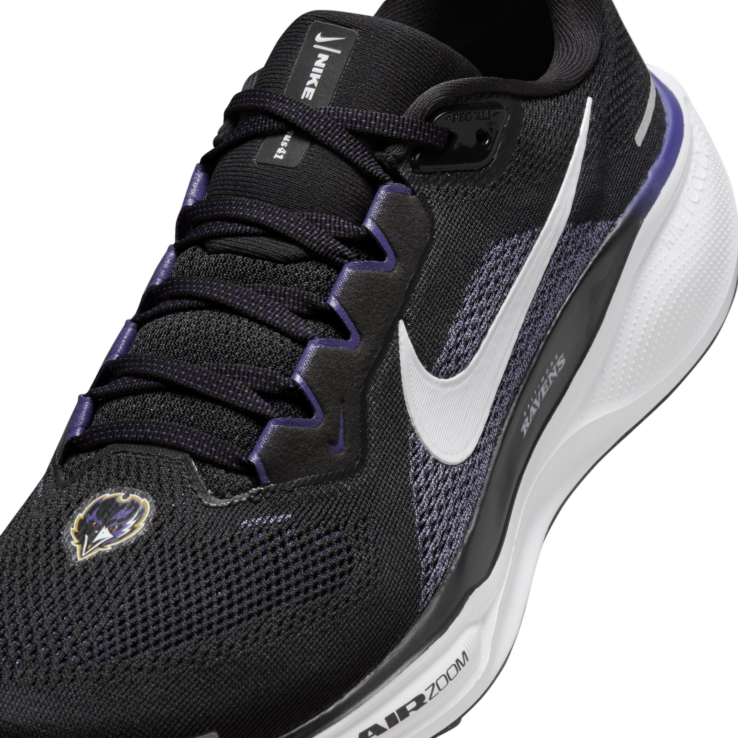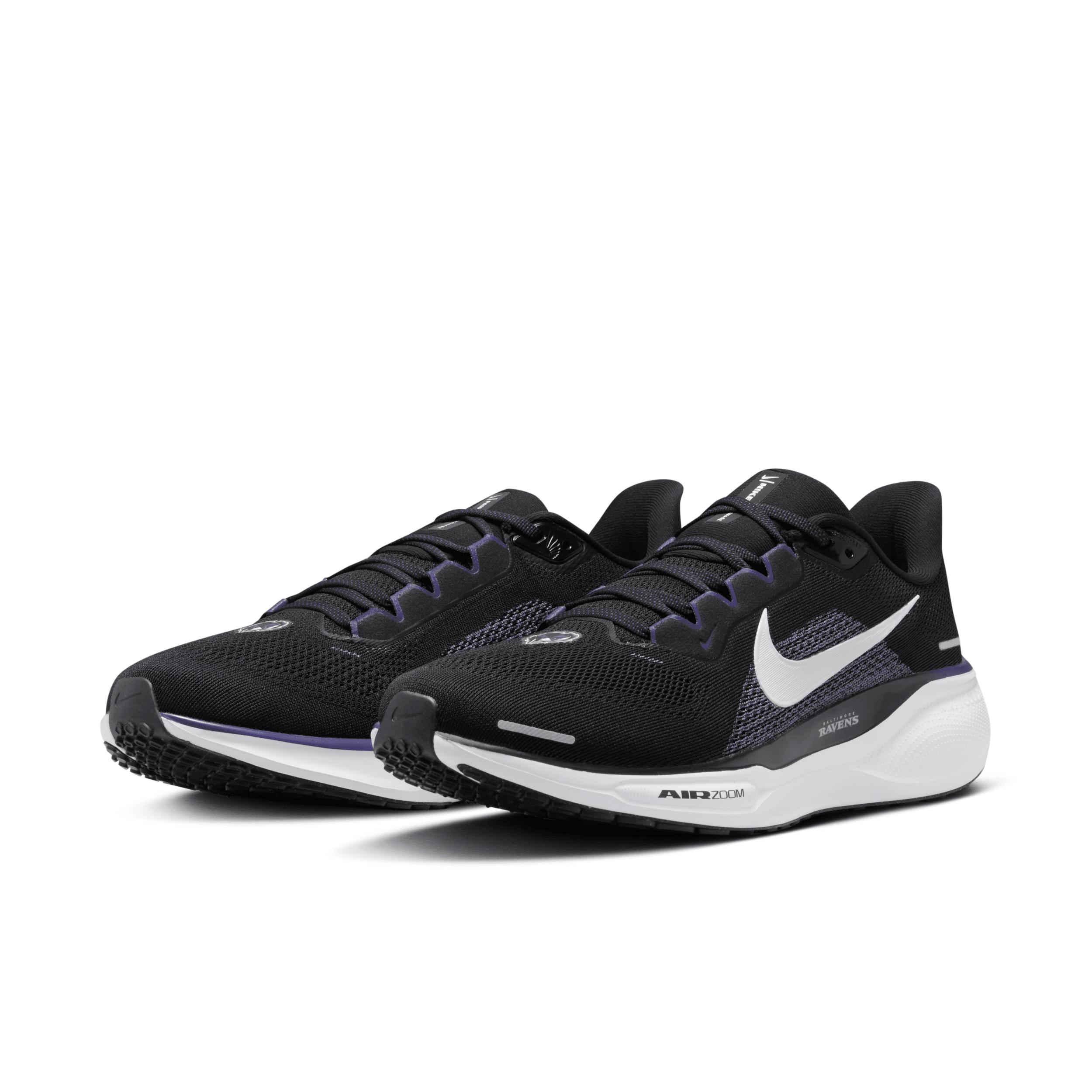 Responsive cushioning in the Pegasus provides an energized ride for everyday road running. Experience lighter-weight energy return with dual Air Zoom units and a ReactX foam midsole. Plus, improved engineered mesh on the upper decreases weight and increases breathability. Key Features:Upgraded breathable engineered mesh upper ReactX foam midsole surrounds forefoot and heel Air Zoom units for an energized ride. Signature waffle-inspired rubber outsole for traction and flexibility Plush collar tongue and sockliner for a secure and comfortable fit What's new? All-new ReactX foam midsole is 13% more responsive than previous React technology. Crafted for performance and planet, ReactX foam is engineered to reduce its carbon footprint by at least 43% in a pair of midsoles due to reduced manufacturing process energy compared to prior React foam. The carbon footprint of ReactX is based on cradle-to-gate assessment reviewed by PRé Sustainability B.V and Intertek China. Other midsole components such as airbags, plates or other foam formulations were not considered. Product Details:Weight: Approx. 297 g/10.4 oz (Men's US 10). Heel-to-toe drop: 10 mm. MR-10 Last - Our best, most consistent fit (same as Pegasus 40). Not intended for use as Personal Protective Equipment (PPE). Style: FZ5094; Color: Black/White/New Orchid/White; Size: 14; Gender: Male; Age Group: Adult | Nike Pegasus 41 NFL Baltimore Ravens Men's Road Running Shoes in Black, Size: 14 | FZ5094-001