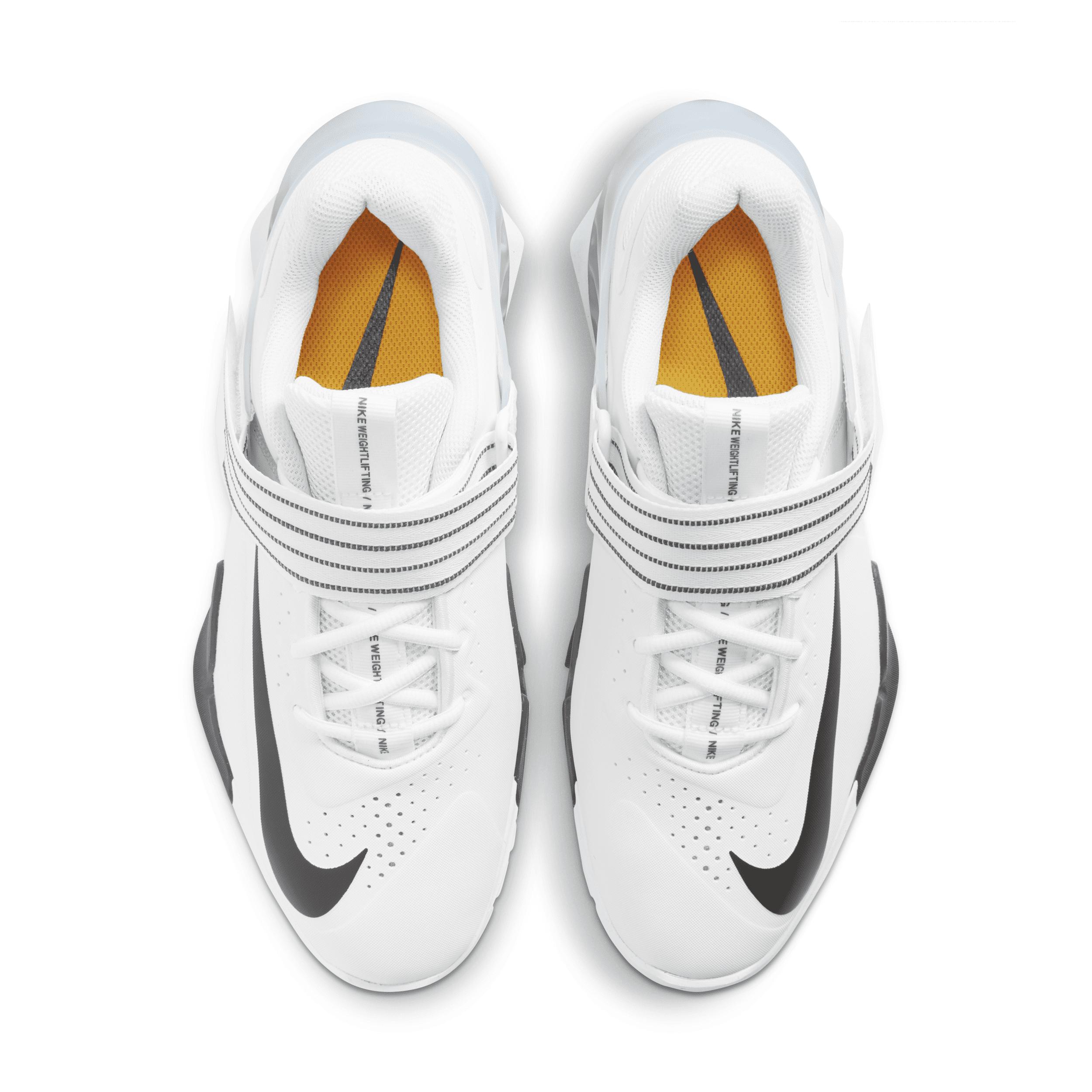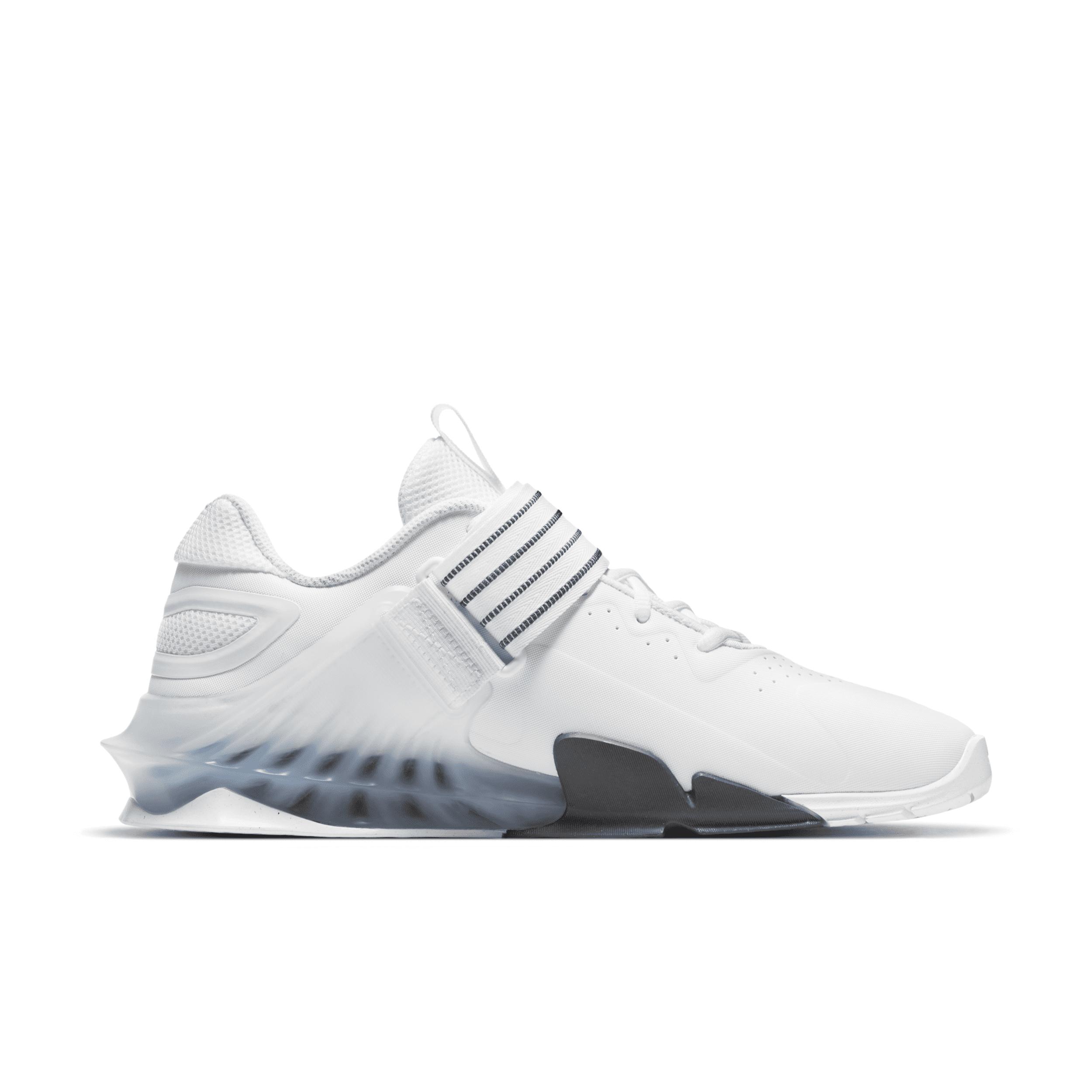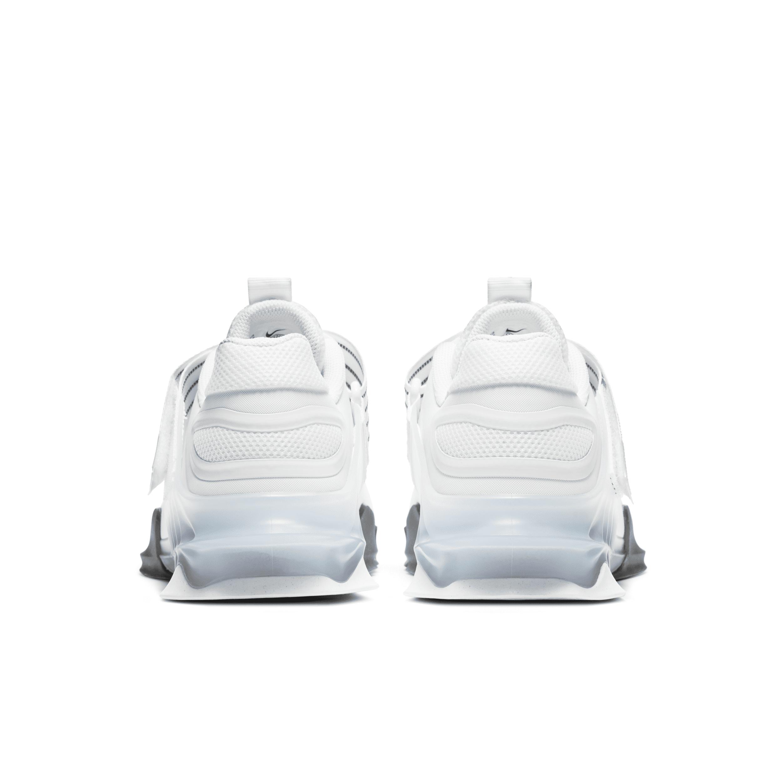 STURDY, STABLE POWER BUILDER. The Nike Savaleos straps your foot down to a flat, wide base to keep you feeling stable and secure when you're up against serious weight. The rigid midsole has a lift at the heel for peak power transfer from the ground to help support your most explosive sets. Stability:The flat, wide sole makes a stable base under pressure. Rigid construction provides excellent power transfer from the ground to help support explosive moves. Support:The hook-and-loop strap locks down your foot to hold you in securely during your heaviest lifts. Balance:The elevated heel positions your foot for stability while you lift and adds versatility in the gym when you're exercising without weight. More Benefits: Padded mesh inset at the heel absorbs impact while letting your foot breathe. Product Details:Padded tongue and collar. Pull tab on tongue. Style: CV5708; Color: White/Iron Grey/Laser Orange/Black; Size: 13; Gender: Male; Age Group: Adult | Nike Savaleos Weightlifting Shoes in White, Size: 13 | CV5708-100