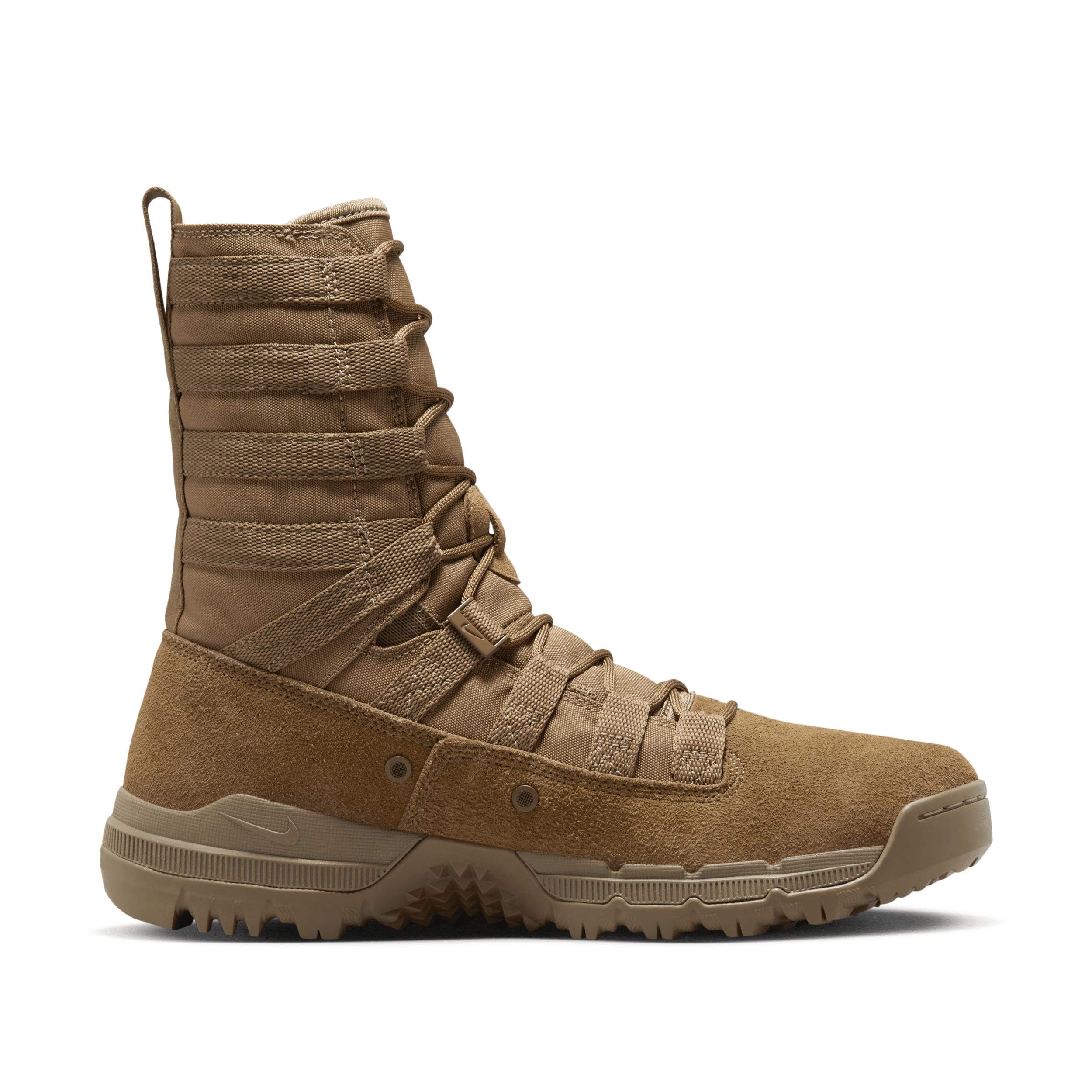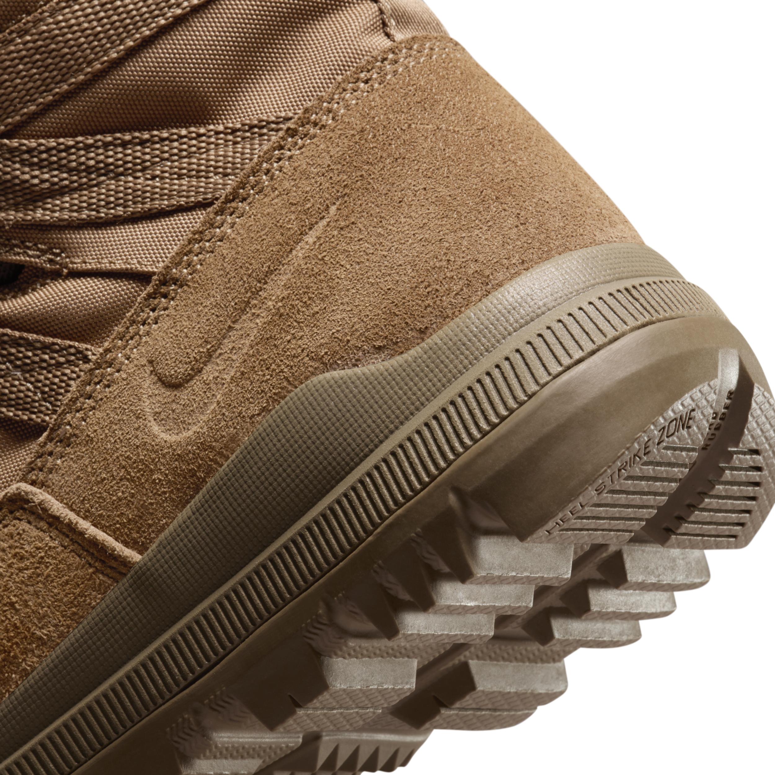 Take a walk on the wild side in the Nike SFB Gen 2 8. Crafted with full-grain leather and nylon canvas, these tactical boots are designed to provide you speed and flexibility over rough terrain. Inspired by Nike Free technology, the aggressive tread pattern of these silhouettes offers you superior traction over multiple surfaces, while the internal rock shield prevents punctures, so you can explore the wilderness without any fear. The shallow flex grooves of these shoes prevent debris from sticking to the surface, while the sawtooth design at the arch provides an enhanced grip for fast roping. Lightweight, waterproof, and breathable, the Nike SFB Gen 2 8 preps you to take on any challenge that comes your way. Nike SFB Gen 2 8 features: Dual-zone lacing integrates with a dual webbing system to provide enhanced stability and a locked-in fit. Foam midsole offers lightweight cushioning and responsiveness. Metal screen vents on the medial side deliver ample ventilation. Reinforced stitch and rubber at the toe offer durability. Internal shank in the heel provides stability and control. Rubber outsole with reinforced heel strike zone delivers multi-surface traction.