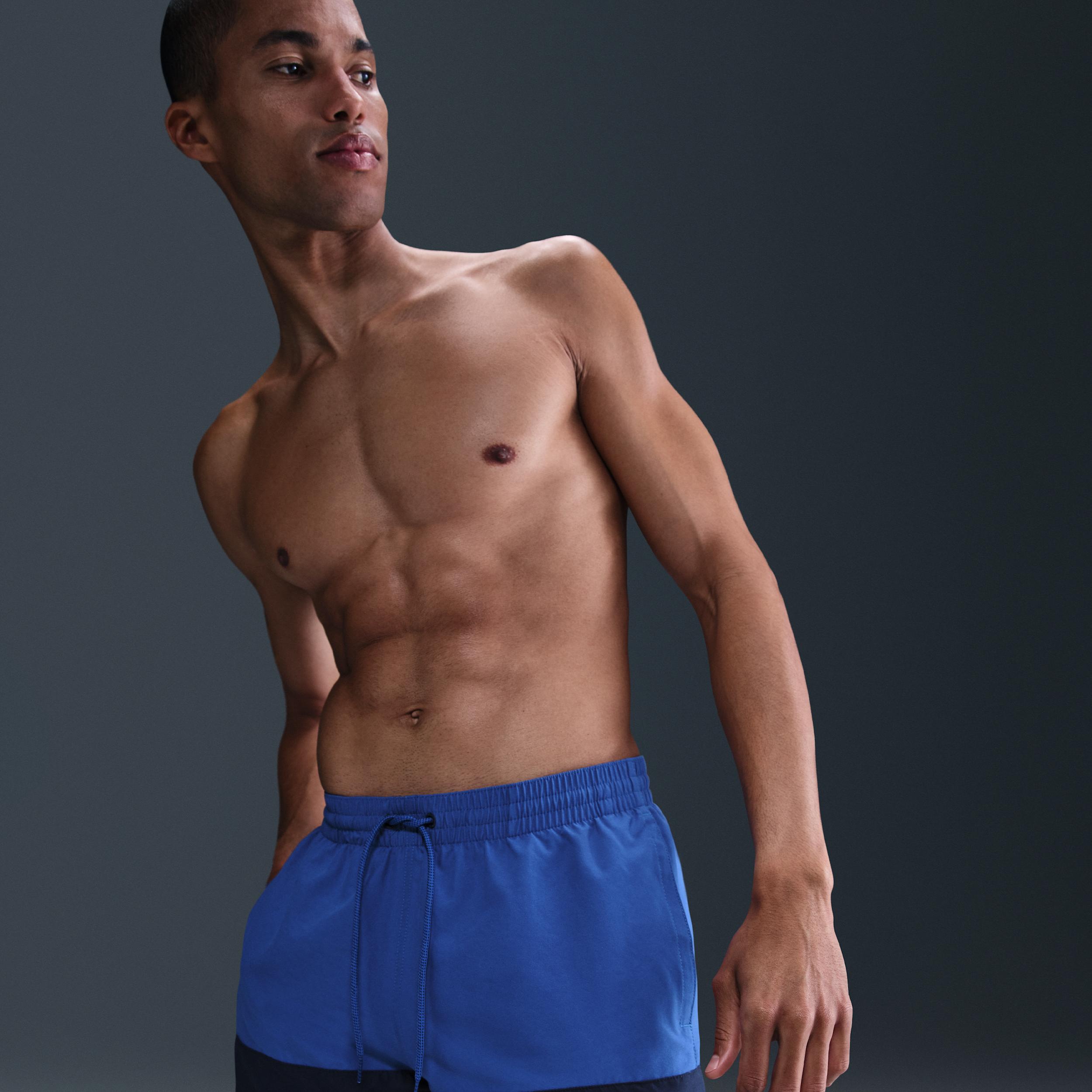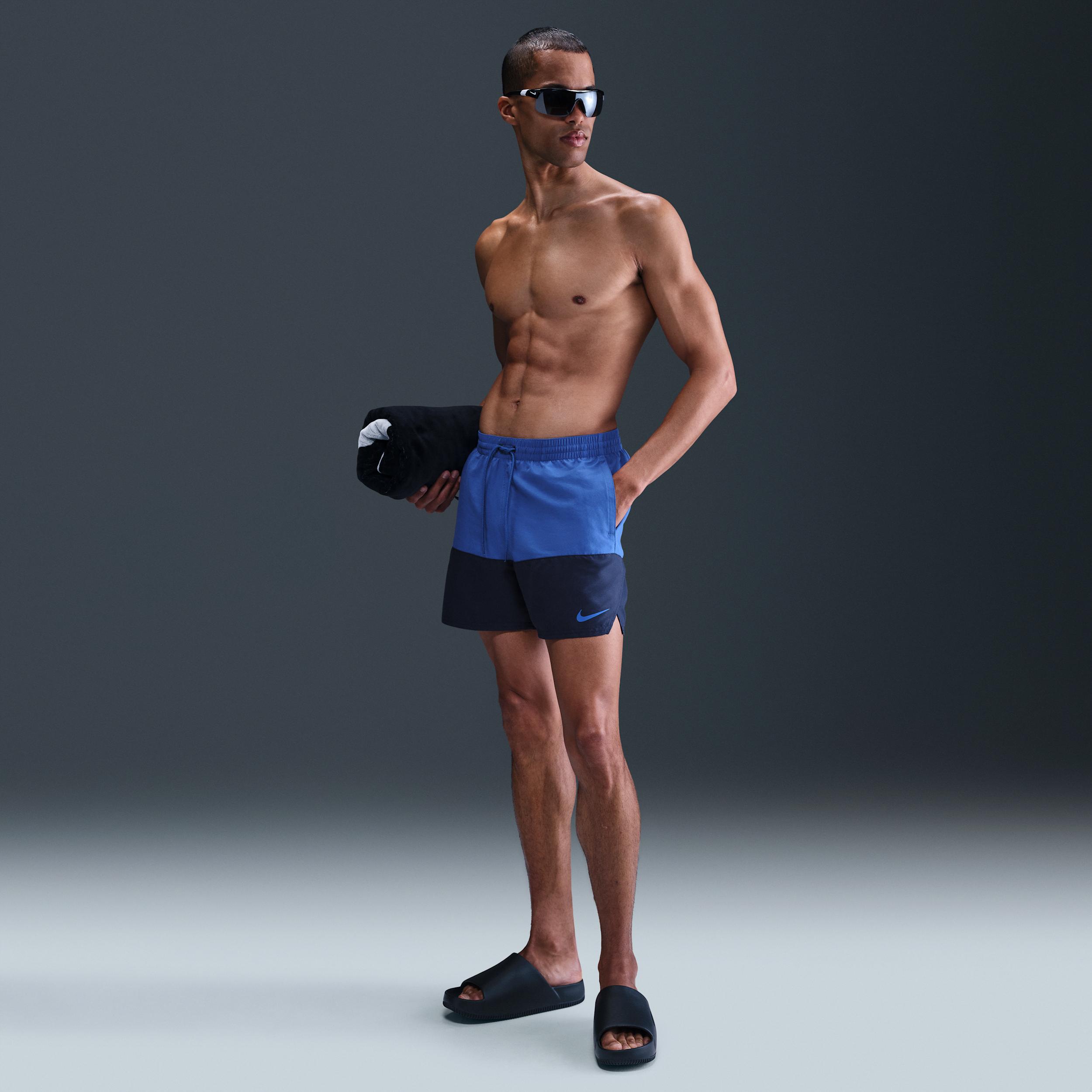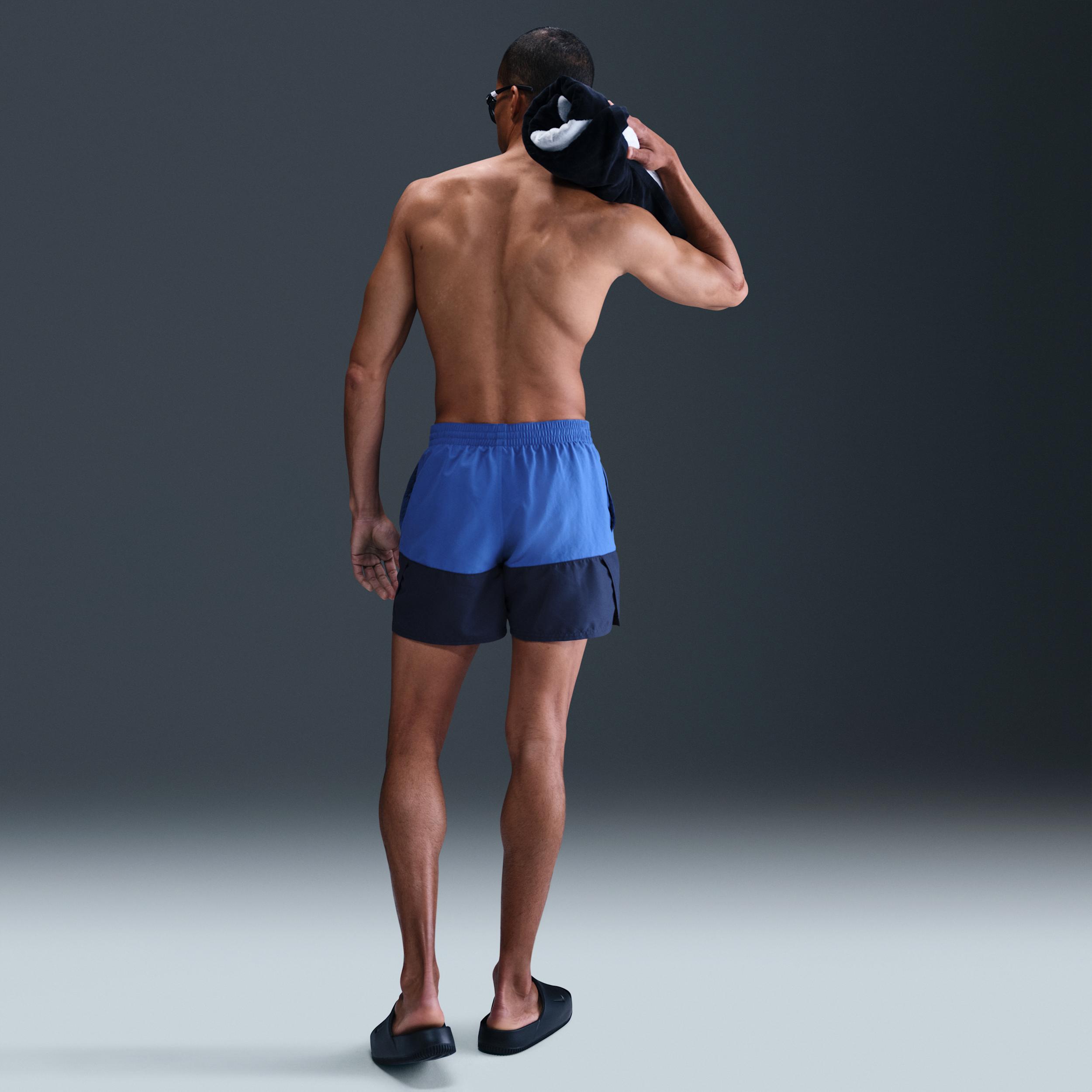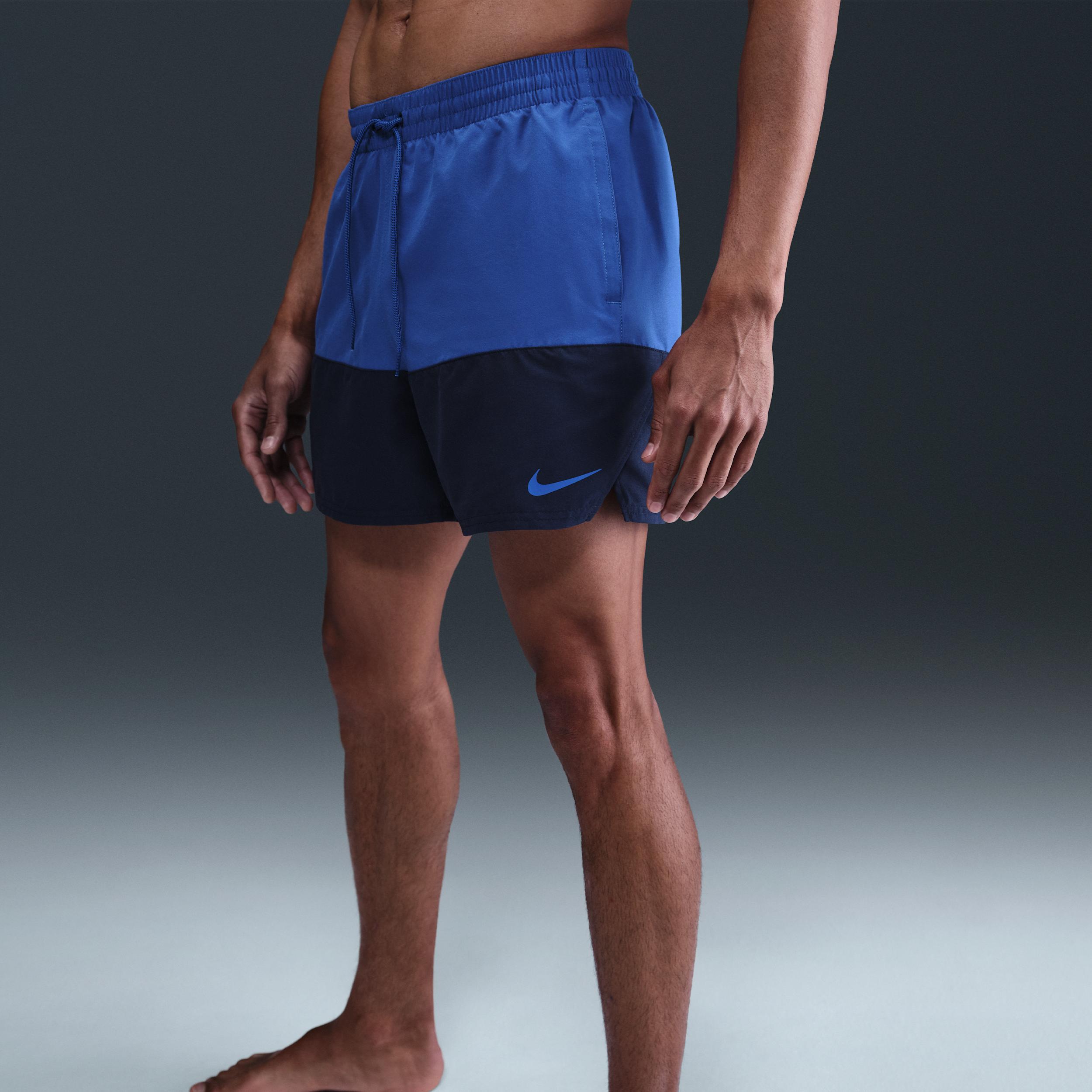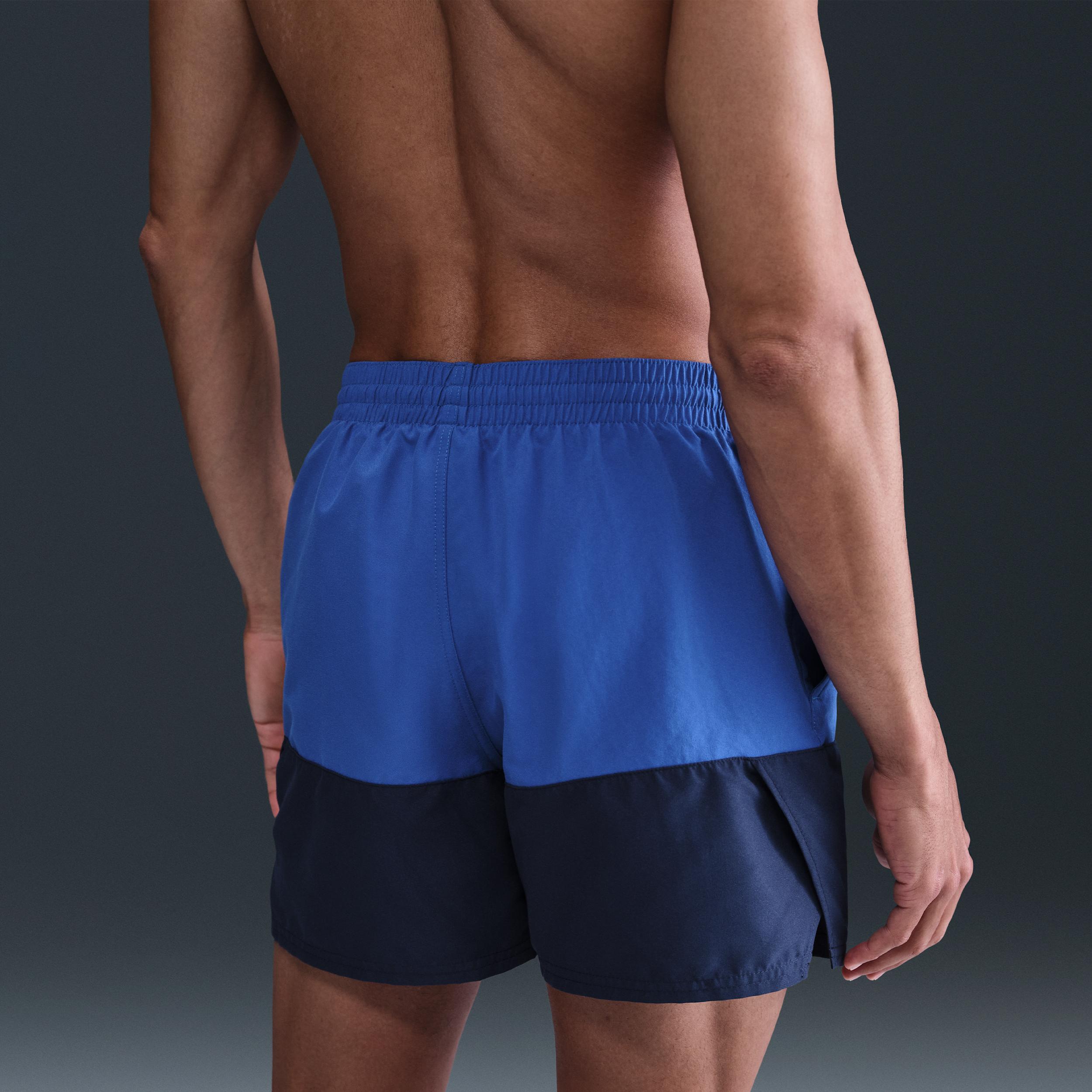 A 2-TONE CLASSIC. The Nike Split Swim Trunks elevate this summertime classic with a 2-tone, in-and-out-of-the-water look. A built-in mesh brief and stretchy waistband create a secure and supportive fit. Benefits:On-seam pockets with mesh pocket bags allow air and water to escape, so you can avoid awkward air bubbles. An internal mesh pocket gives you a place to put small items, like a key. Product Details:5 inseam. 16 outseam. Body: 100% polyester. Lining: 50% recycled polyester/50% polyester. Machine wash. Imported. Style: NESSB451; Color: Game Royal; Size: S; Gender: Male; Age Group: Adult | Nike Split Mens 5 Swim Trunks in Blue, Size: Small | NESSB451-494