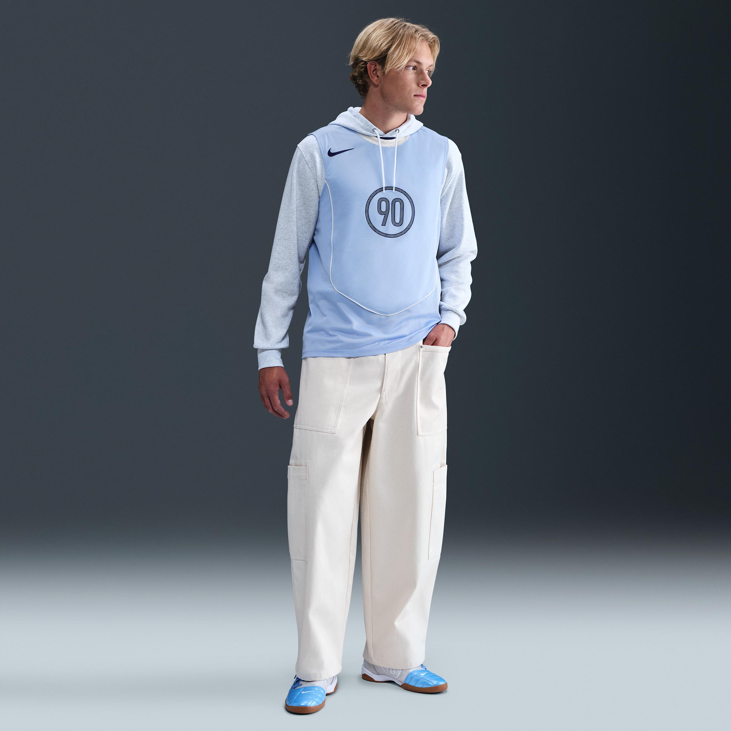 Channeling the energy and edge of the early-2000s, this Total 90 sleeveless top is a throwback to one of the era's most iconic jerseys. Curving panels of sweat-wicking mesh and piping create a look that's game ready in the stands and the streets. Behind the Design:Total 90:Designed to perform through all 90 minutes of a match, the Total 90 collection became one of the iconic kits of the 2000s thanks to its curving lines and mixed materials. This rerelease brings that same energy for a new generation of players and fans. Stay-Dry Comfort:Nike Dri-FIT technology moves sweat away from your skin for quicker evaporation, helping you stay dry and comfortable. Breathable Construction:Lightweight knit fabric has a mesh face and flat back for a cool, smooth sensation. Mesh paneling on the collar, side and back panels provide extra breathability. [] Product Details:100% polyester. Machine wash. Imported. Style: HV1180; Color: Aluminum/Sail/Sail/Blue Void; Size: M; Gender: Male; Age Group: Adult | Nike Total 90 Men's Dri-FIT Sleeveless Soccer Top in Blue, Size: Medium | HV1180-468