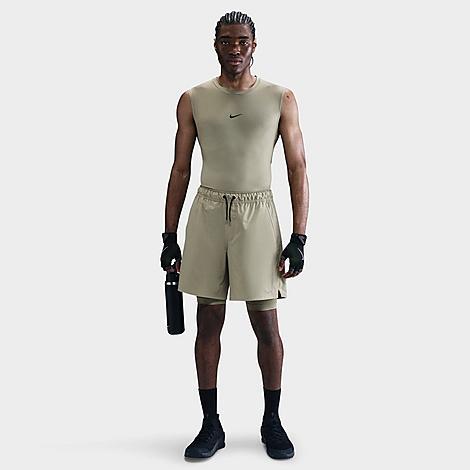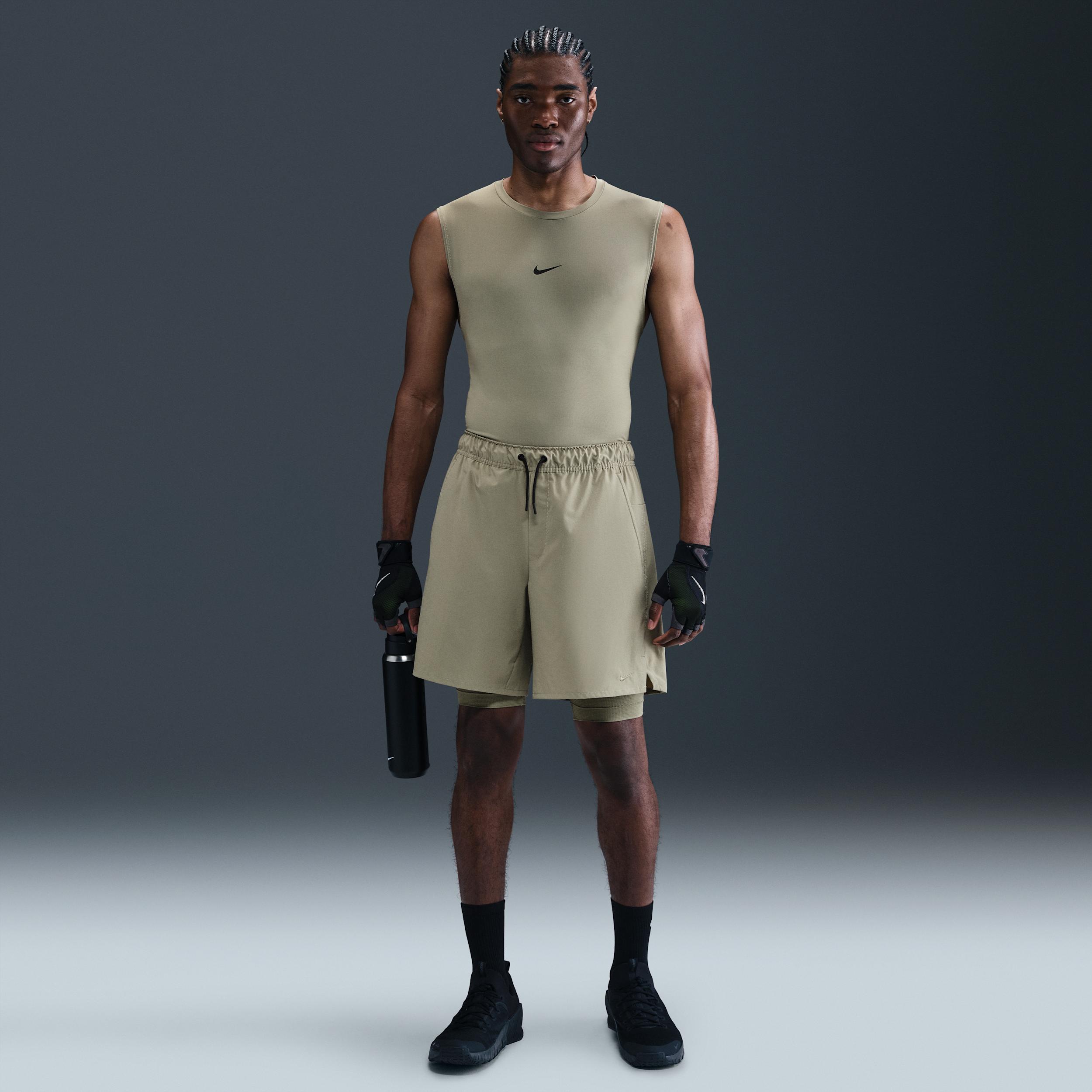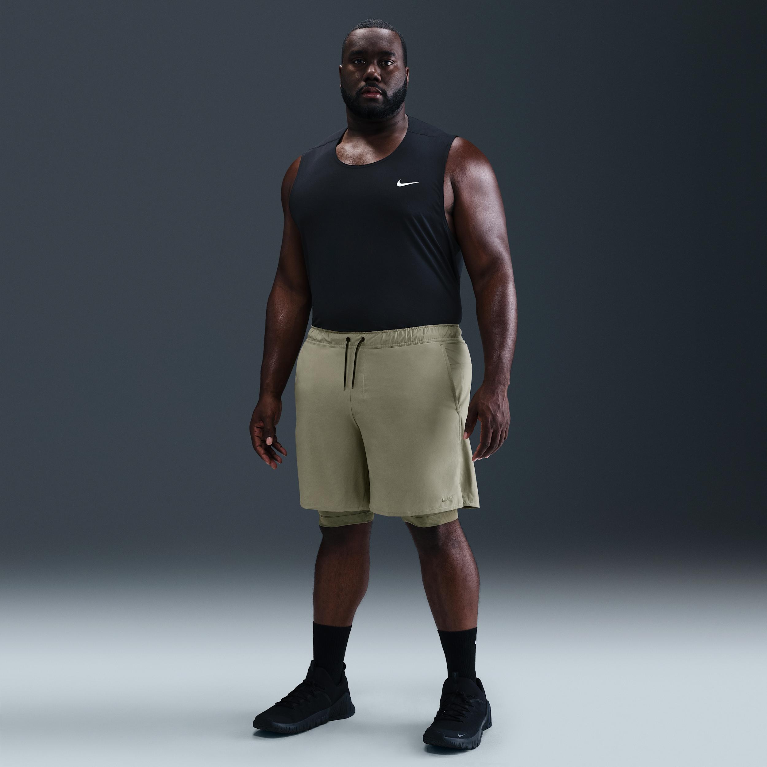 Designed for running, training and yoga, our sweat-wicking Unlimited Shorts were made to do it all. Theyre here for whatever your workout requires, with a smooth, stretchy outer layer that helps you stay free to move. A tight inner layer adds extra support during your routine. Plus, a hidden pocket lets you keep your phone close as you bring the heat to the gym or a run. Less Sweat, More Cool:Nike Dri-FIT technology moves sweat away from your skin for quicker evaporation, helping you stay dry and comfortable. Comfort on the Go:Stretch-woven fabric combined with side hem vents help you get the most out of your movement. A tight-fitting base layer provides support, plus the waistband is designed to stay in place without digging into your skin. Safe Storage:A large, zippered pocket at the back is big enough to hold most phones. More Benefits:Designed for Running, Yoga and Training Length: 7 Liner: 2-in-1 Fabric: 4-way stretch woven Storage: Side pockets, hidden back pocket and drop-in phone pocket Waistband: Stay-in-place waistband with convertible interior/exterior drawcord Product Details:Interior key loop. Faux fly. Embroidered Swoosh. Body: 86% polyester/14% spandex. Panels: 89% polyester/11% spandex. Pocket Bags: 100% polyester. Machine wash. Imported. Style: DV9334; Color: Light Army/Light Army/Black/Light Army; Size: M; Gender: Male; Age Group: Adult | Nike Unlimited Mens Dri-FIT 7 2-in-1 Versatile Shorts in Green, Size: Medium | DV9334-320