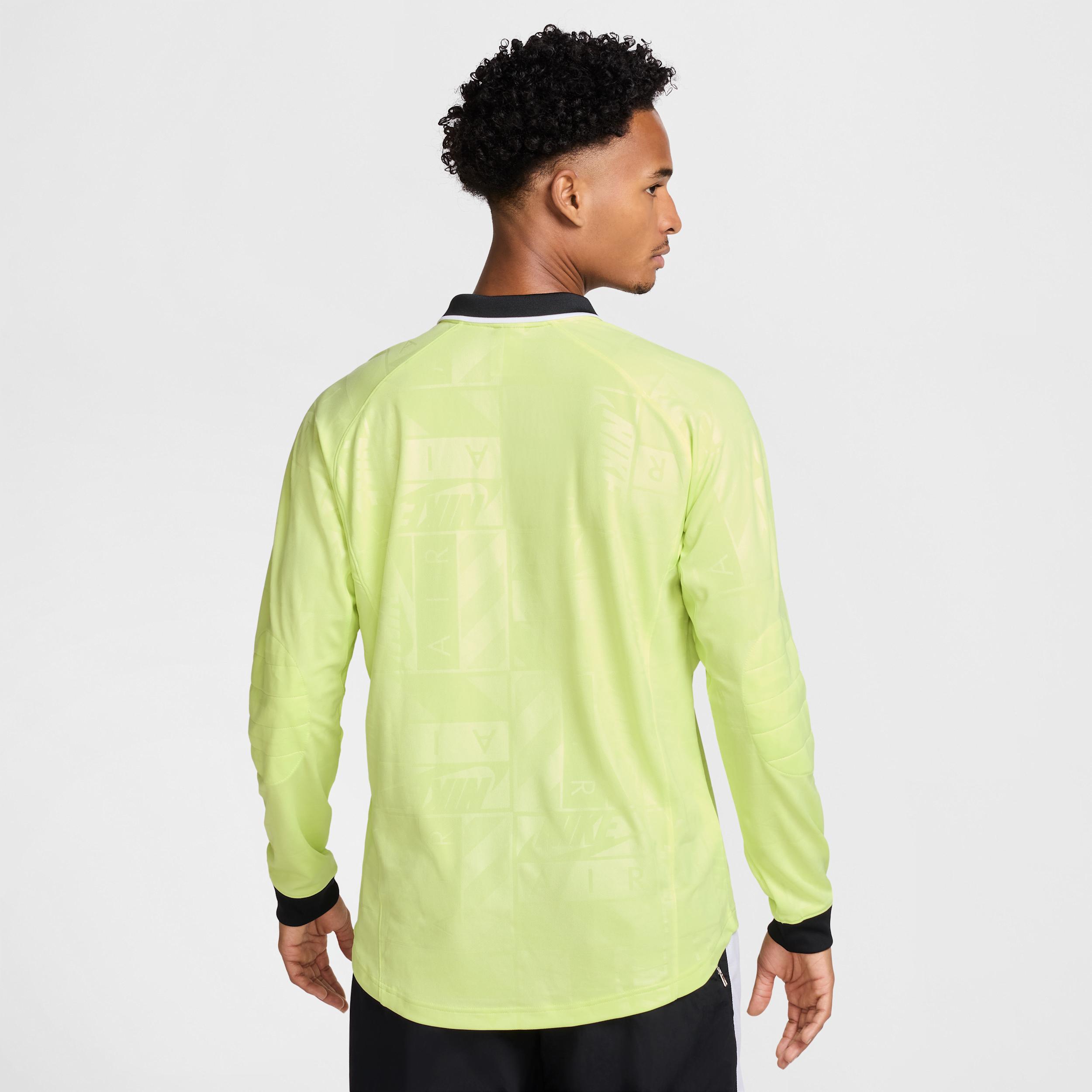 Make plays on the field or off with this jersey constructed from lightweight, sweat-wicking fabric. The soccer-inspired collar and stitched elbow pads channel the look of retro soccer jerseys. Benefits:Lightweight fabric moves sweat away from your skin for quick evaporation, helping you stay dry and comfortable. Ribbed collar and cuffs offer an elevated feel. Designed to feel roomy through the body for easy movement and layering. Product Details:Nike Air jock tag and silicone patch. Body/Rib: 100% polyester. Machine wash. Imported. Style: HM8987; Color: Light Lemon Twist/Black/Black; Size: XL; Gender: Male; Age Group: Adult | Nike Air Men's Long-Sleeved Jersey in Yellow, Size: XL | HM8987-736
