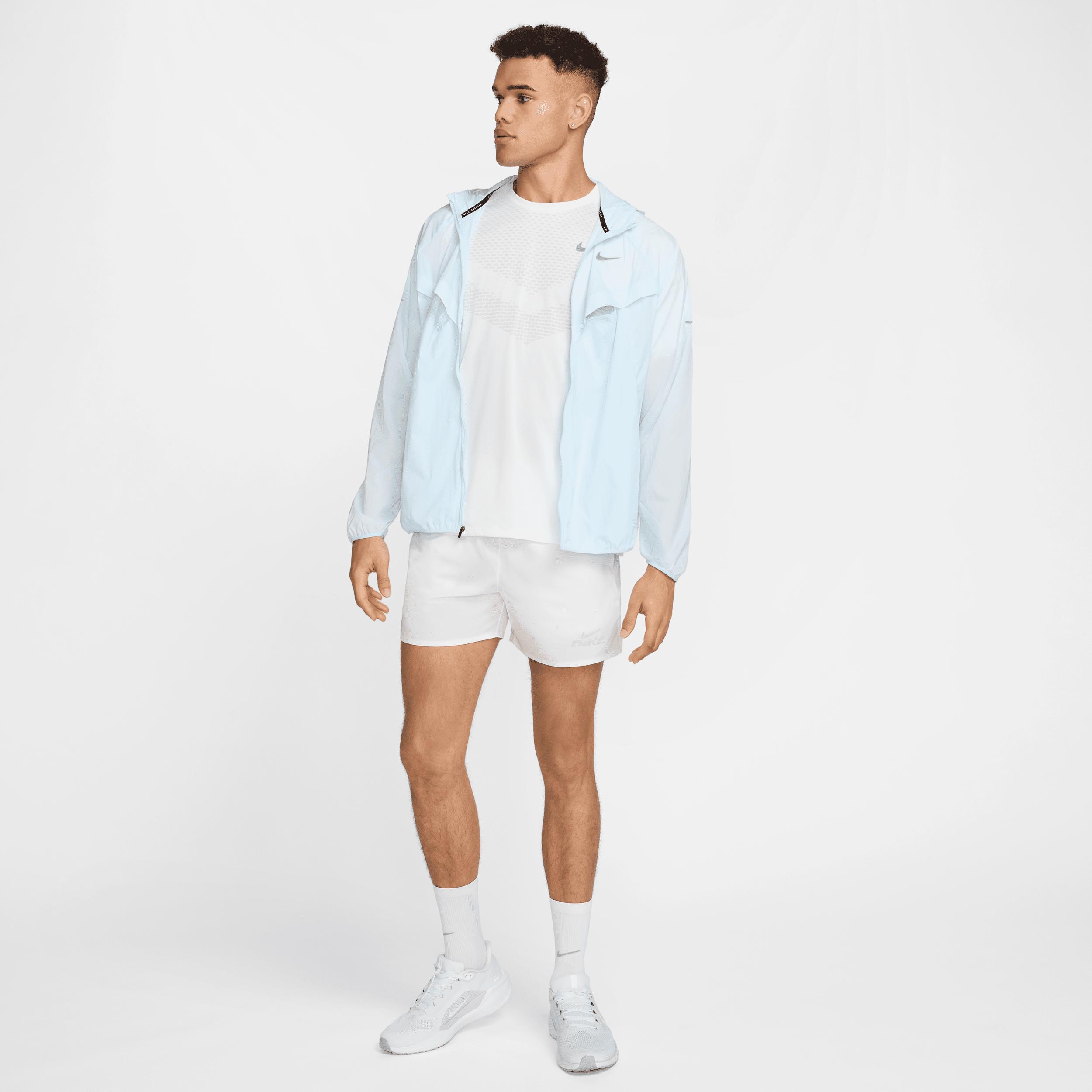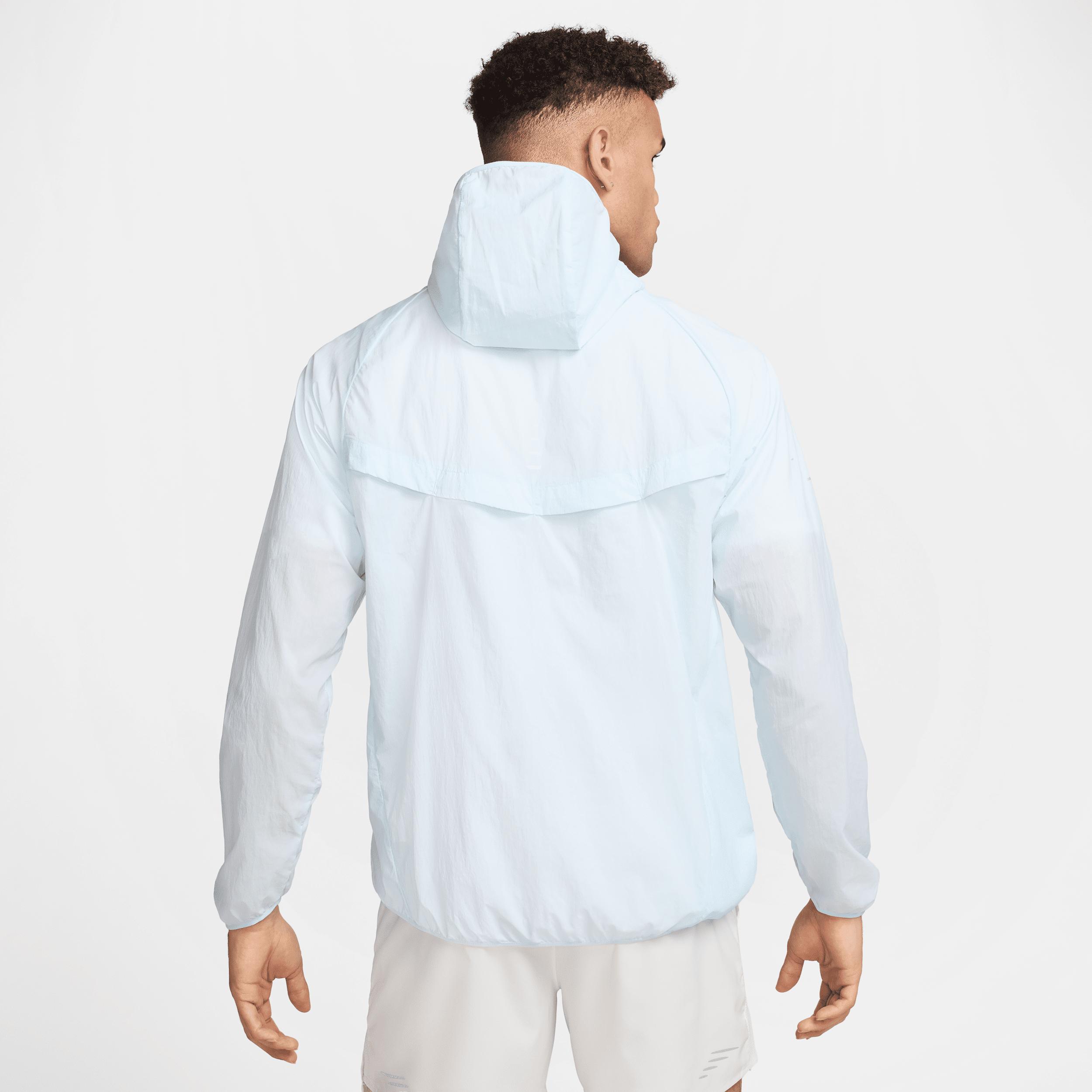 Using insights from runners like you, we prioritized functionality to refresh our Stride essentials. Lightweight and water-repellent, this UV-blocking jacket packs into its own pocket, helping you stay ready for any weather. Ready Rain or Shine:The smooth nylon shell is super lightweight, with a water-repellent finish to help you stay dry in wet weather. It also blocks UV rays, giving you coverage for sunny conditions. Pack It Away:The jacket packs down into its side pocket for convenient storage on the go. Steady Ventilation:Vents on the front and back of the jacket provide extra breathability in key areas. Mesh-lined pockets help keep your essentials dry. Streamlined Comfort:Raglan sleeves are designed to help reduce underarm chafing and allow for a wider range of motion. An updated adjustable hood design gives a secure, personalized feel. Product Details:Reflective pills on the back. Reflective Swoosh logo. Not intended for use as Personal Protective Equipment (PPE). This product provides UVA and UVB protection from the sun in the areas covered by the garment. To protect exposed areas, the use of good quality sunscreen is recommended. Body: 100% nylon. Mesh: 100% polyester. Machine wash. Imported. Style: HV4548; Color: Glacier Blue/Glacier Blue; Size: M; Gender: Male; Age Group: Adult | Nike Stride Men's Repel UV Running Jacket in Blue, Size: Medium | HV4548-474