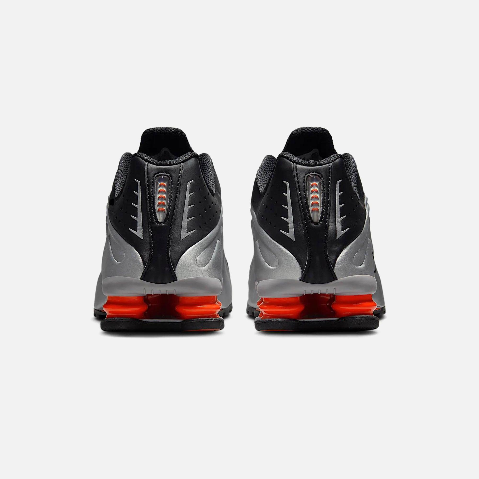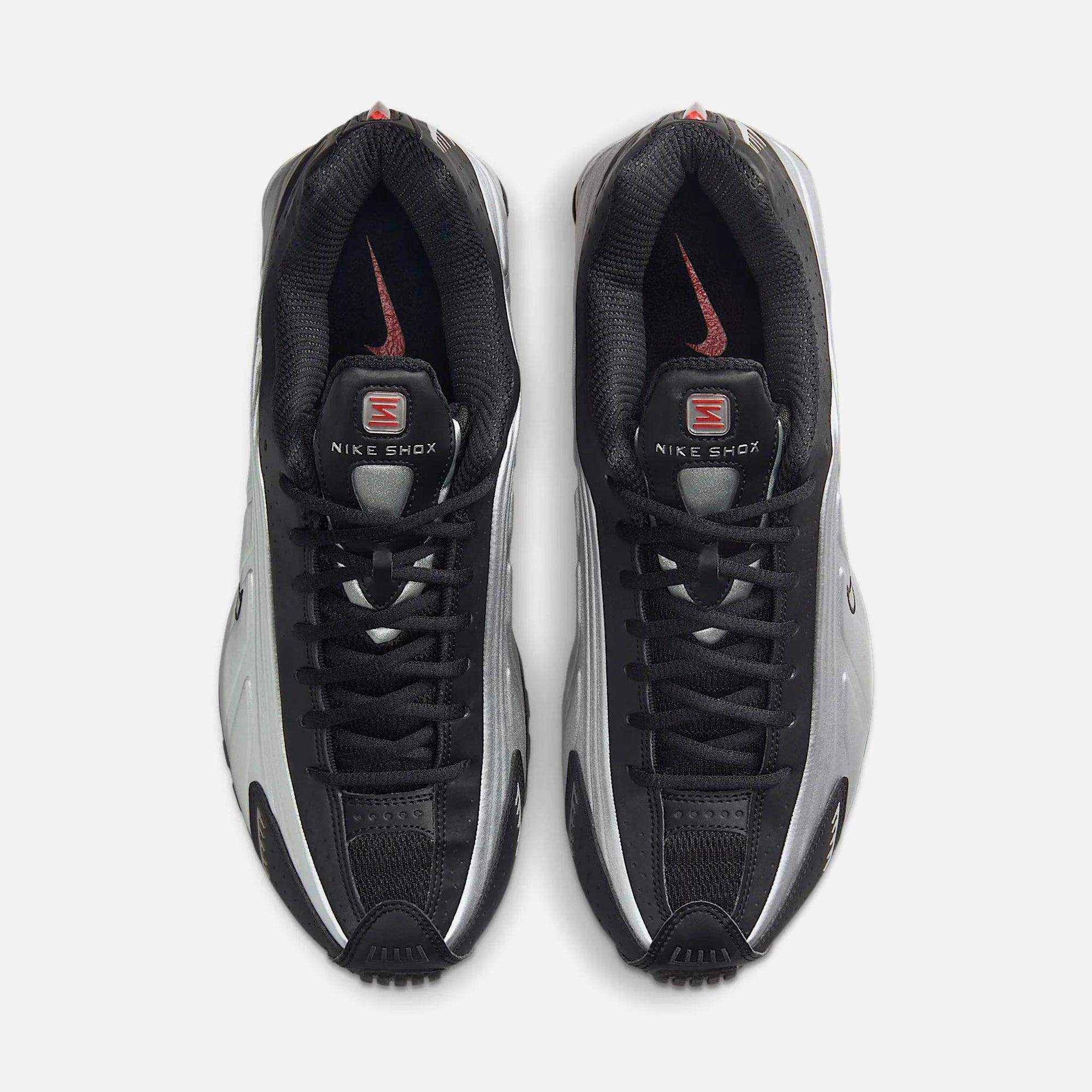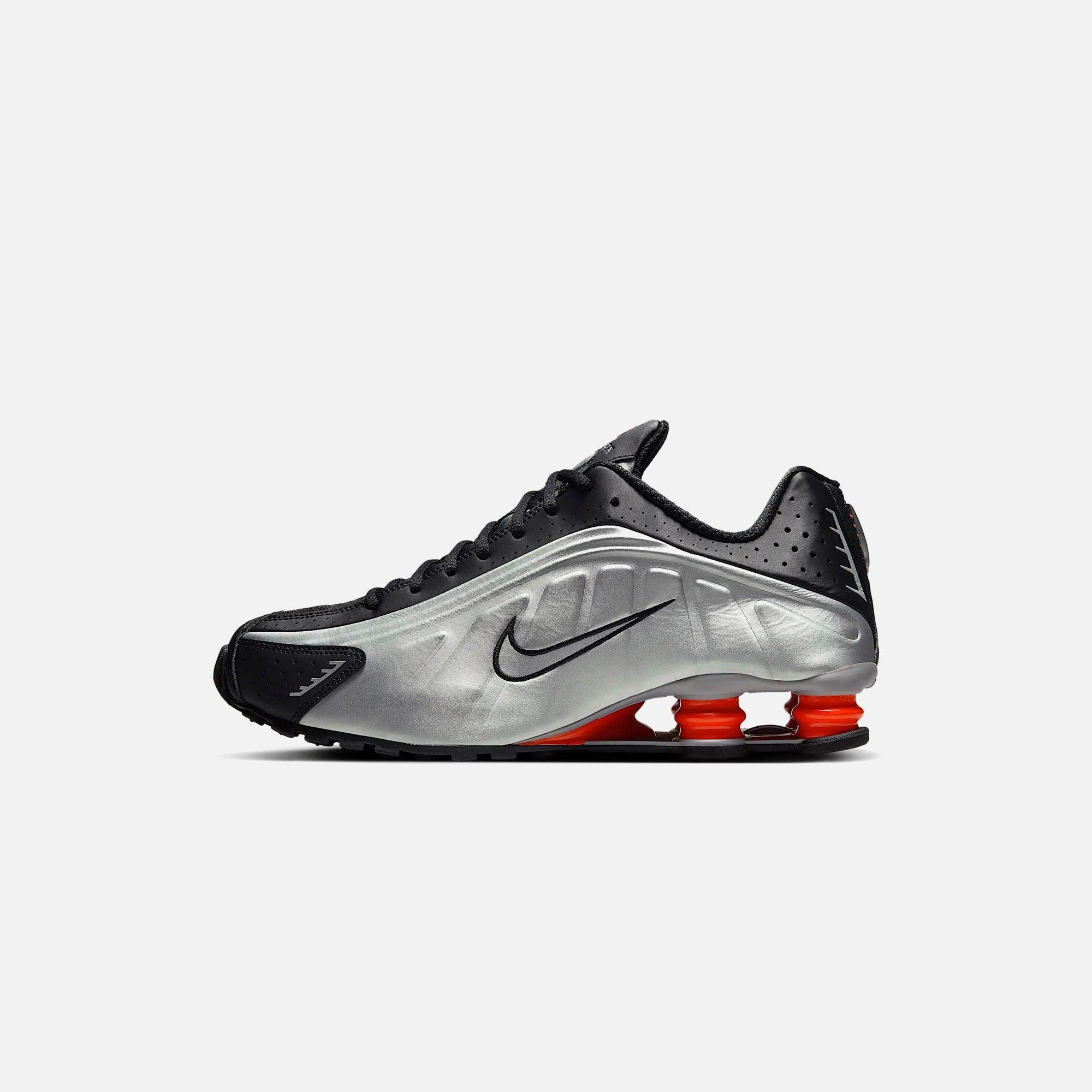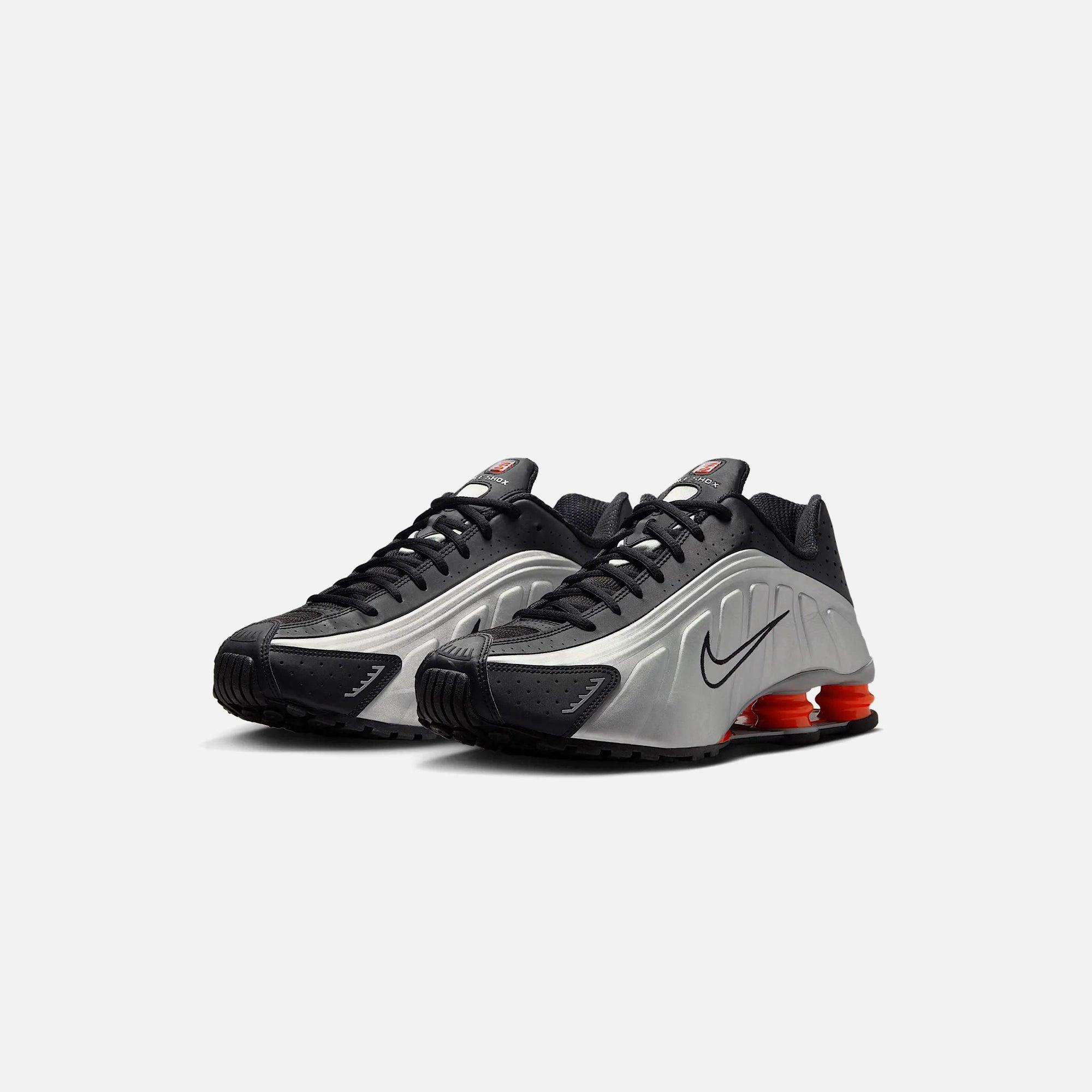 Shox R4 silhouette Leather upper Mesh liner Perforated details Embossed side panel details Embroidered Swoosh on side panels 3M hits on the toe and heel Shox R4 technology Rubber outsole Style: nkhq1988-002 Color: Metallic Silver / Black / Picante Red / Metallic Silver Material: Leather / Mesh