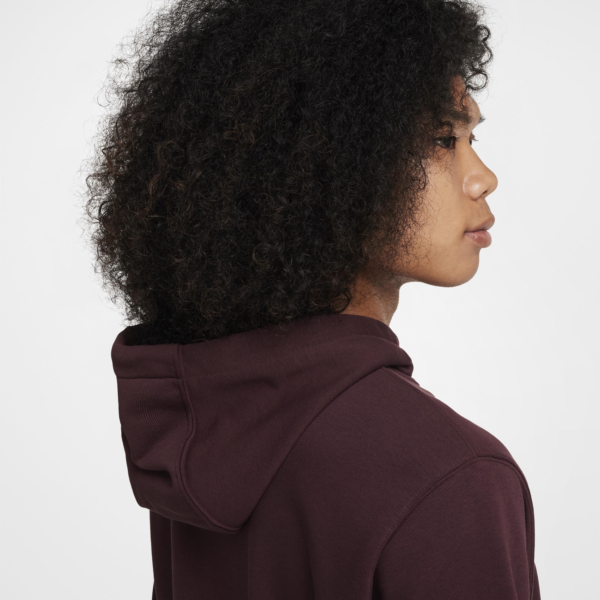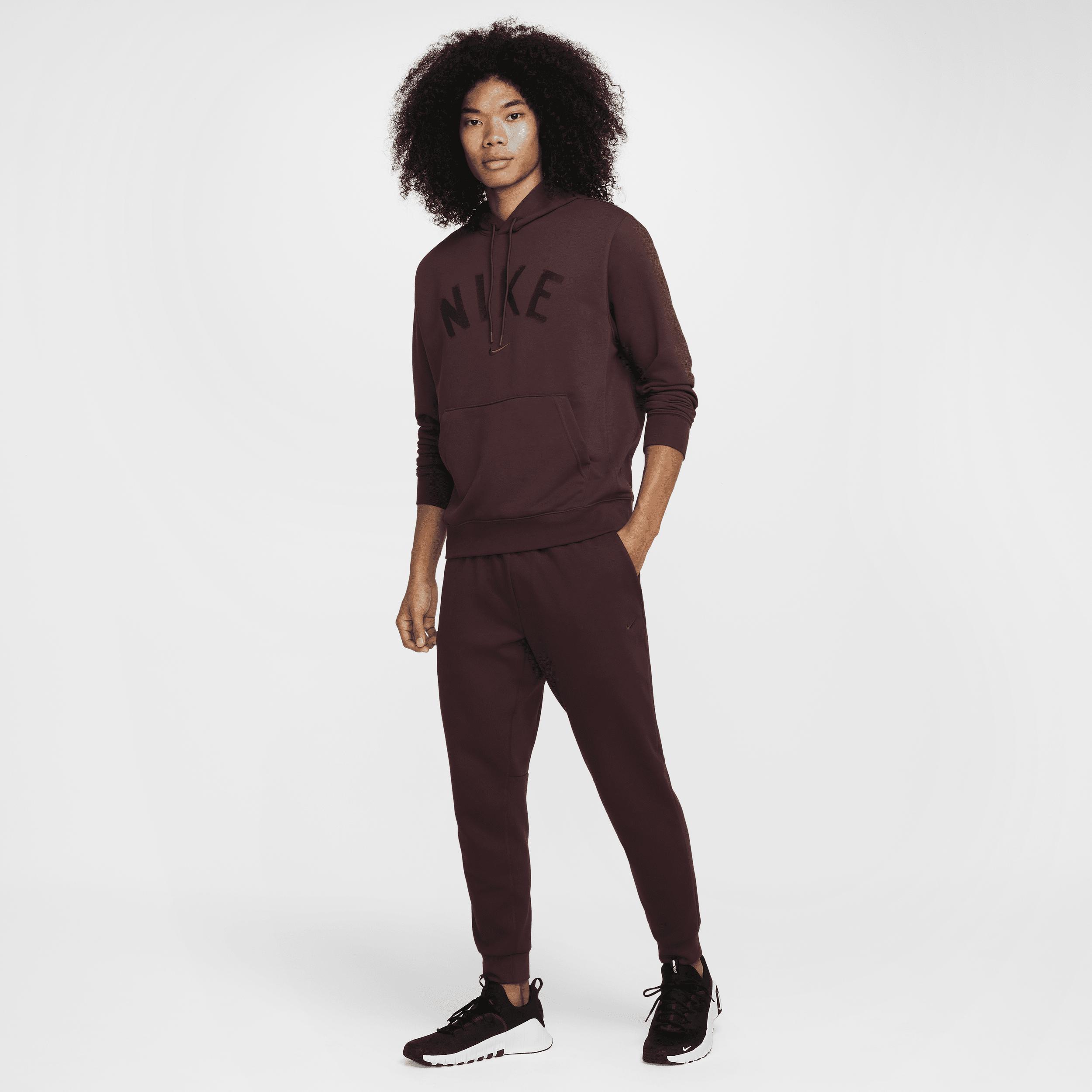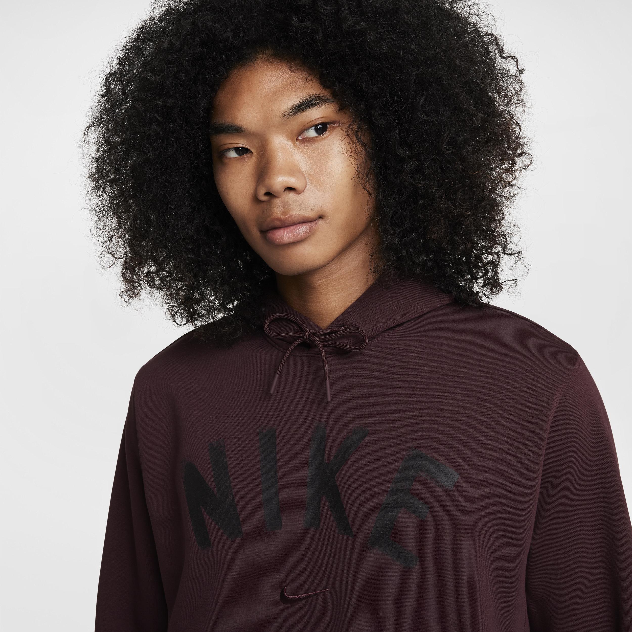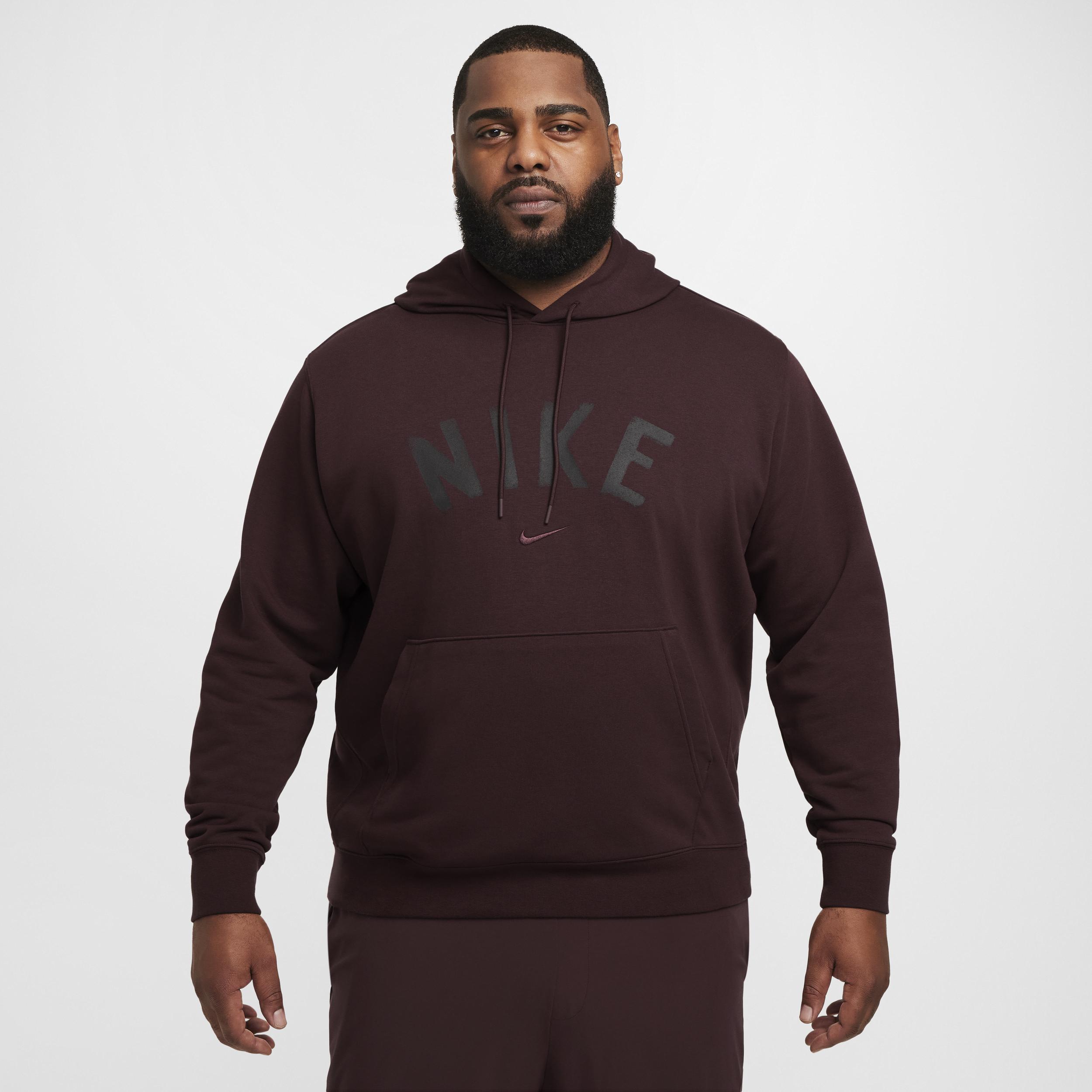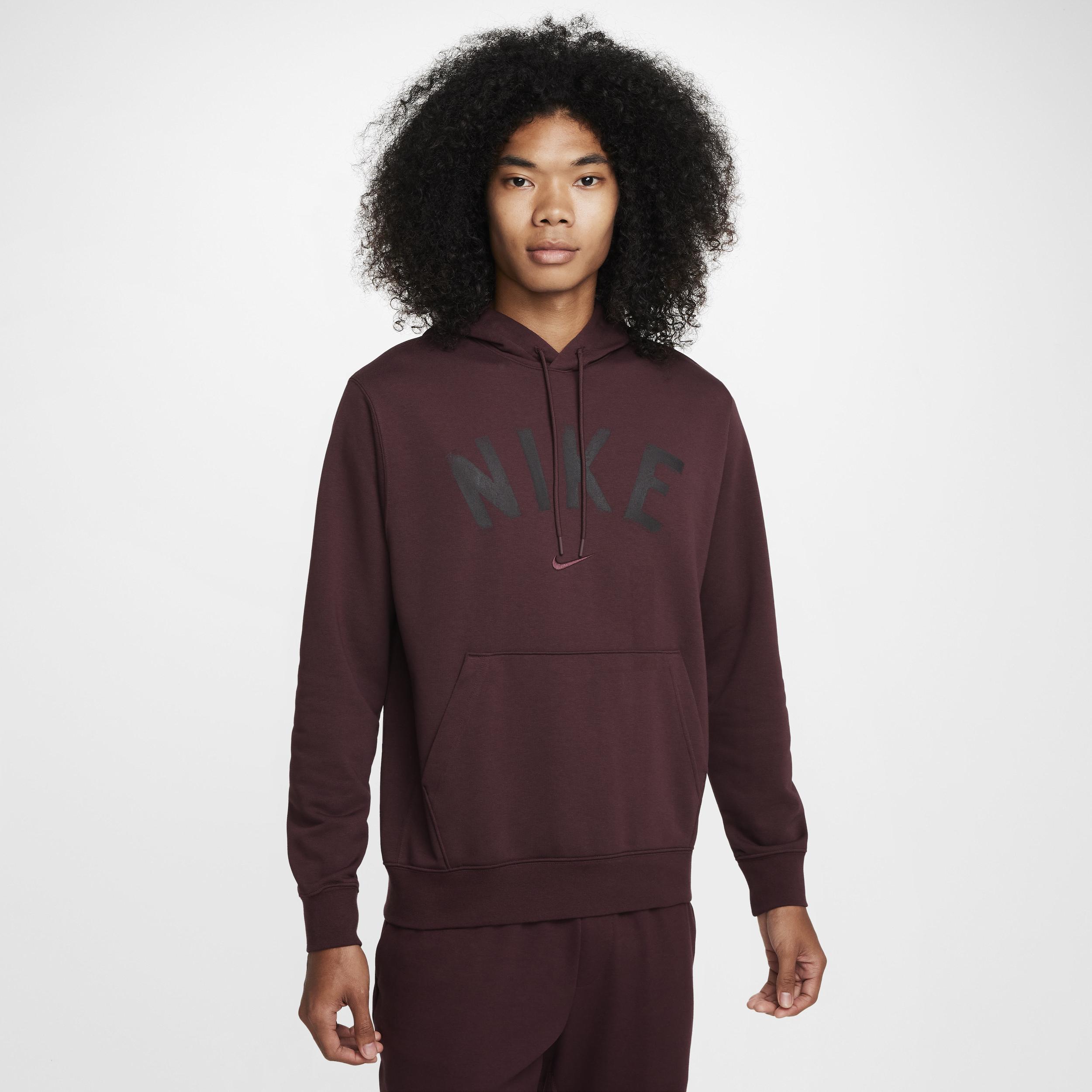 This midweight French terry hoodie is made for movement. A classic fit and soft, sweat-wicking fabric help you stay comfortable at the gym and beyond. Benefits:Nike Dri-FIT technology moves sweat away from your skin for quicker evaporation, helping you stay dry and comfortable. Smooth on the outside with unbrushed loops on the inside, this midweight French terry helps create breathability, so itâs comfy enough for you to wear all year long, no matter the temp. Lined hood has a soft, smooth feel. [] Product Details:Embroidered graphics. Drawcord at hood. Front pocket. Ribbed cuffs and hem. Body:56% polyester/44% cotton. Hood lining:100% cotton. Machine wash. Imported. Style: FV9919; Color: Burgundy Crush/Burgundy Crush/Black; Size: 3XL; Gender: Male; Age Group: Adult | Nike Swoosh Men's Dri-FIT French Terry Pullover Fitness Hoodie in Red, Size: 3XL | FV9919-652