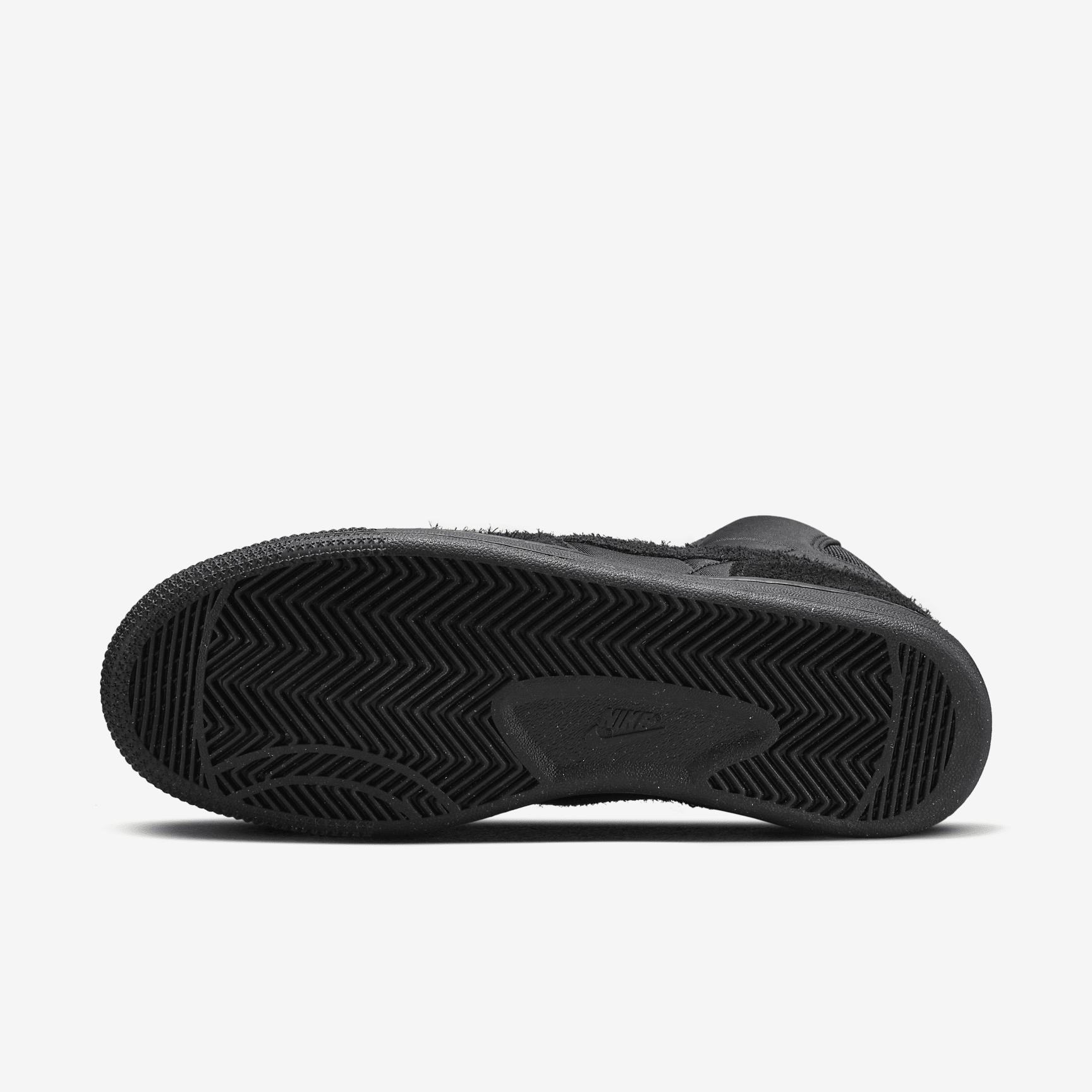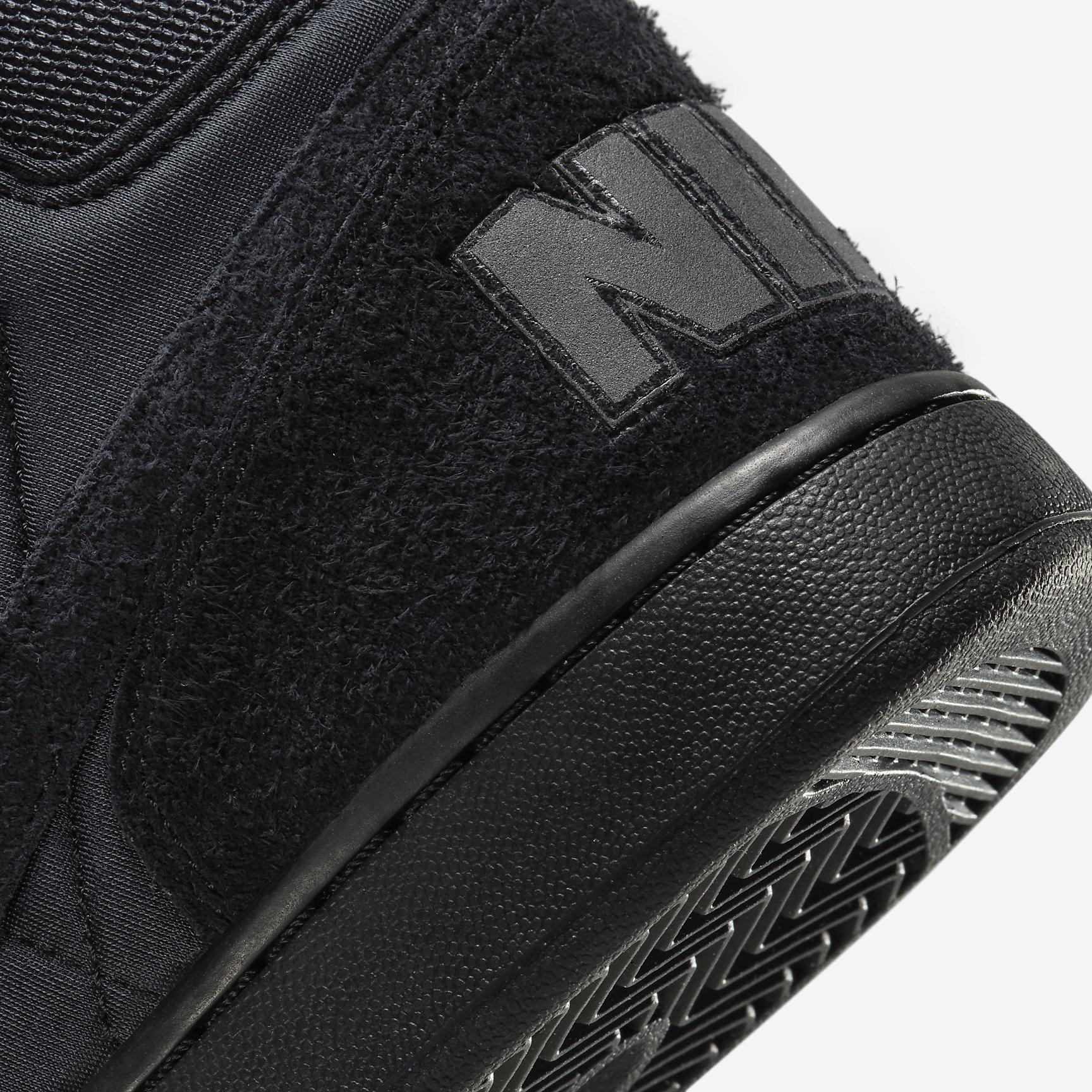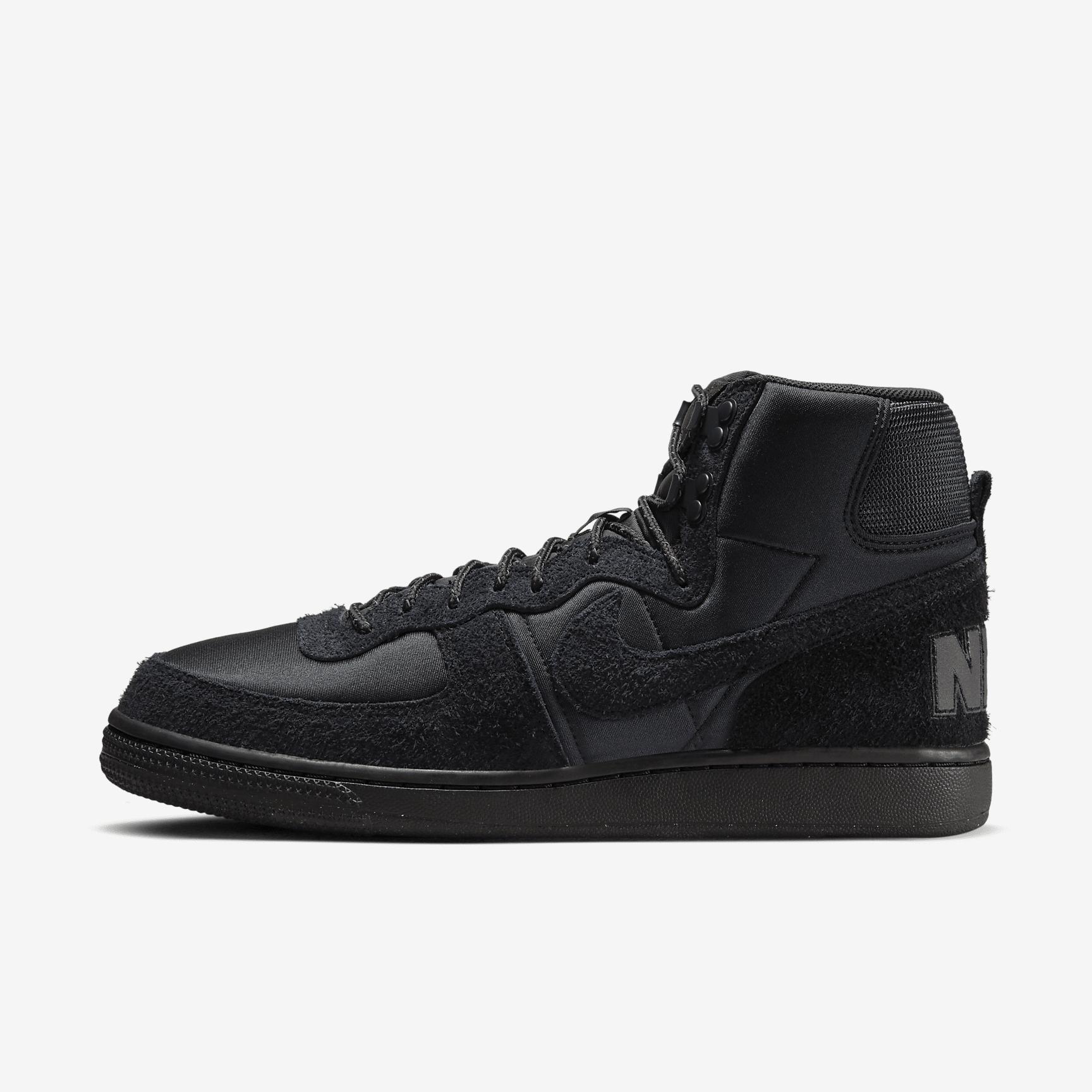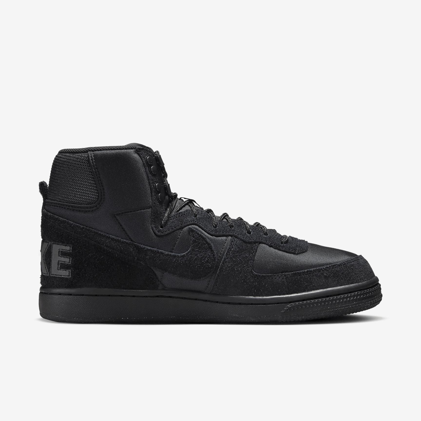 Bird lovers who hoop. Off-court stylists who take their game through stands of old-growth trees. Multifaceted and ready for whatever speaks to you, this fresh take on the Terminator lets you bridge worlds. Pulling inspiration from the great outdoors, your favorite retro hoops look gets a hiking boot twist. Hairy suede overlays nod to the wilderness beyond, while neoprene-like underlays keep 'em breezy to wear. Oh, and the all-black upper gives your style the perfect edge. Lace up and see where the day takes you. Benefits: Neoprene-like upper with suede overlays stands up to the demands of your day. Padded, high-top collar adds an old-school look that feels great. Rubber outsole gives you durable traction. Product Details: 2 sets of laces. Woven tongue label. Traditional lacing. Not intended for use as Personal Protective Equipment (PPE). Style: FJ5464; Color: Black/Black/Black; Size: 11; Gender: Male; Age Group: Adult | Nike Terminator High Men's Shoes in Black, Size: 11 | FJ5464-010