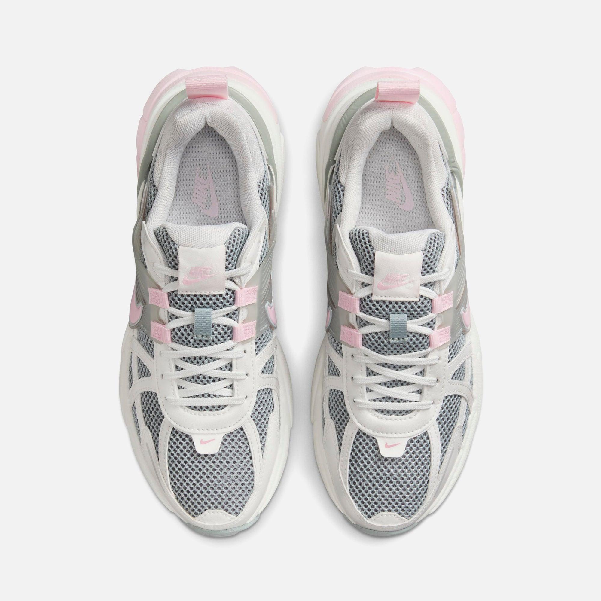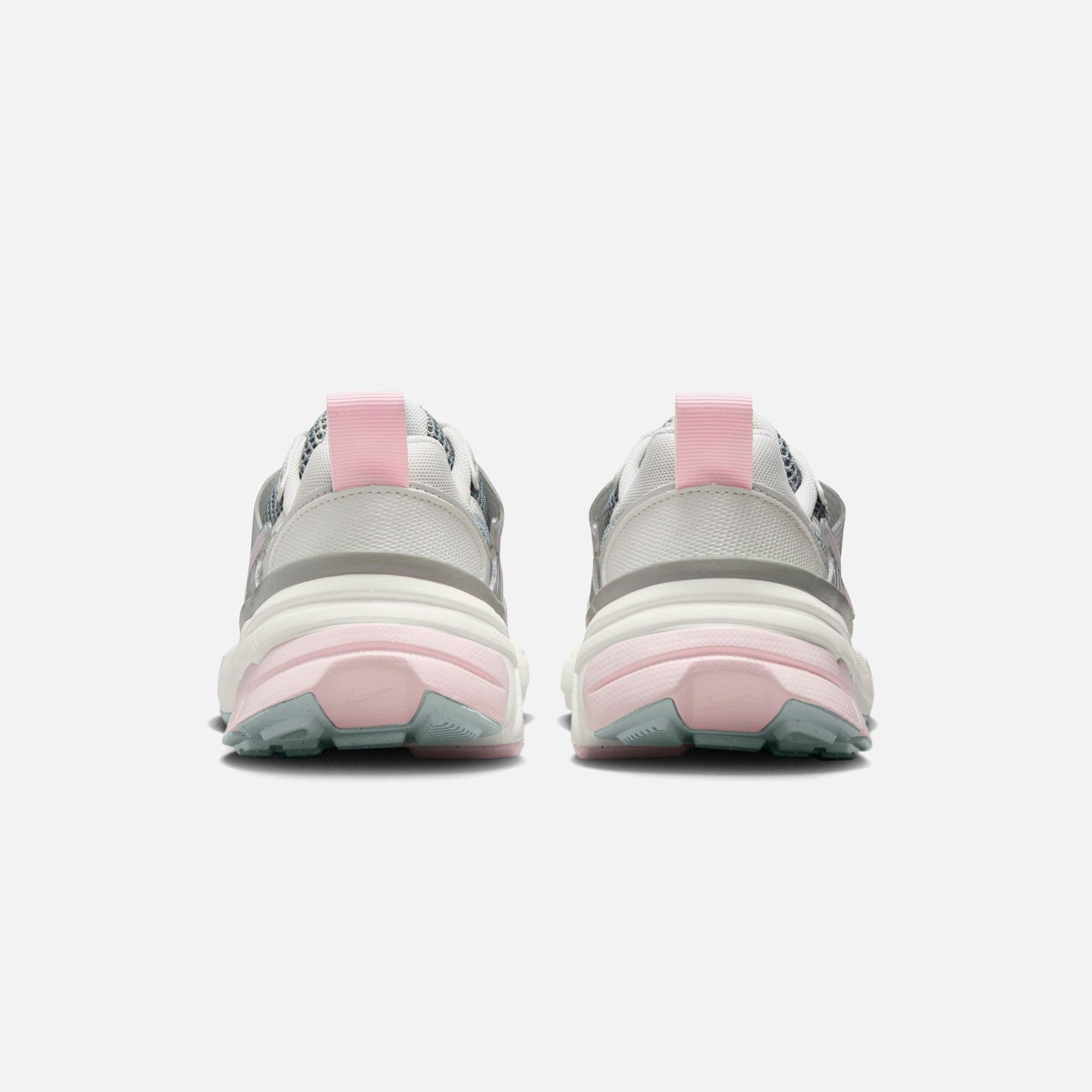 Women's V2K Run silhouette Mesh upper Synthetic leather overlay Padded collar Embroidered Nike logo patch on tongue Swoosh on side panel Cage on lateral side Nike Swoosh on toe TPU heel counter Heel pull Flat cotton laces Foam midsole Rubber outsole Style: nkhq4046-001 Color: Light Pumice / Pink Foam / Photon Dust Material: Mesh / Leather