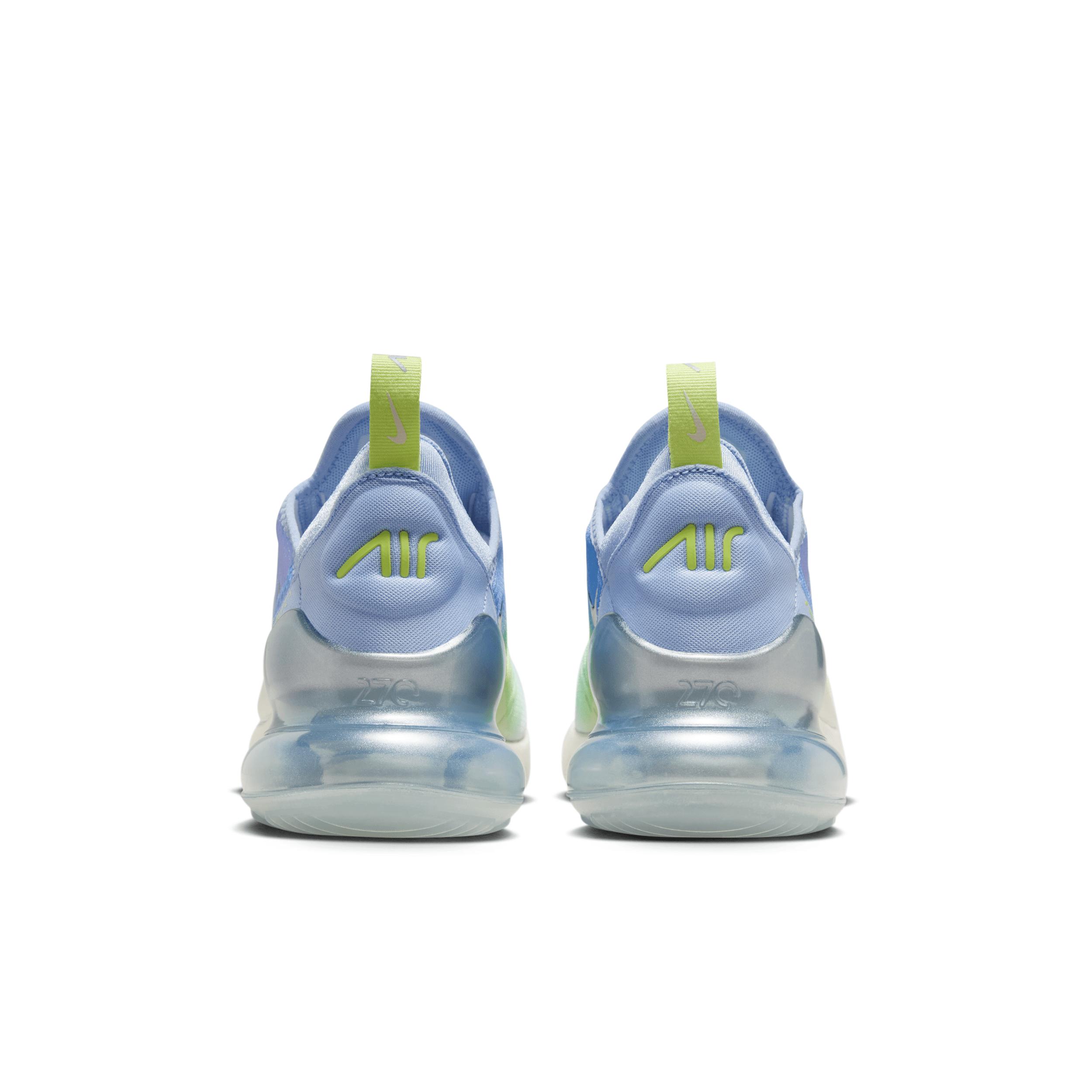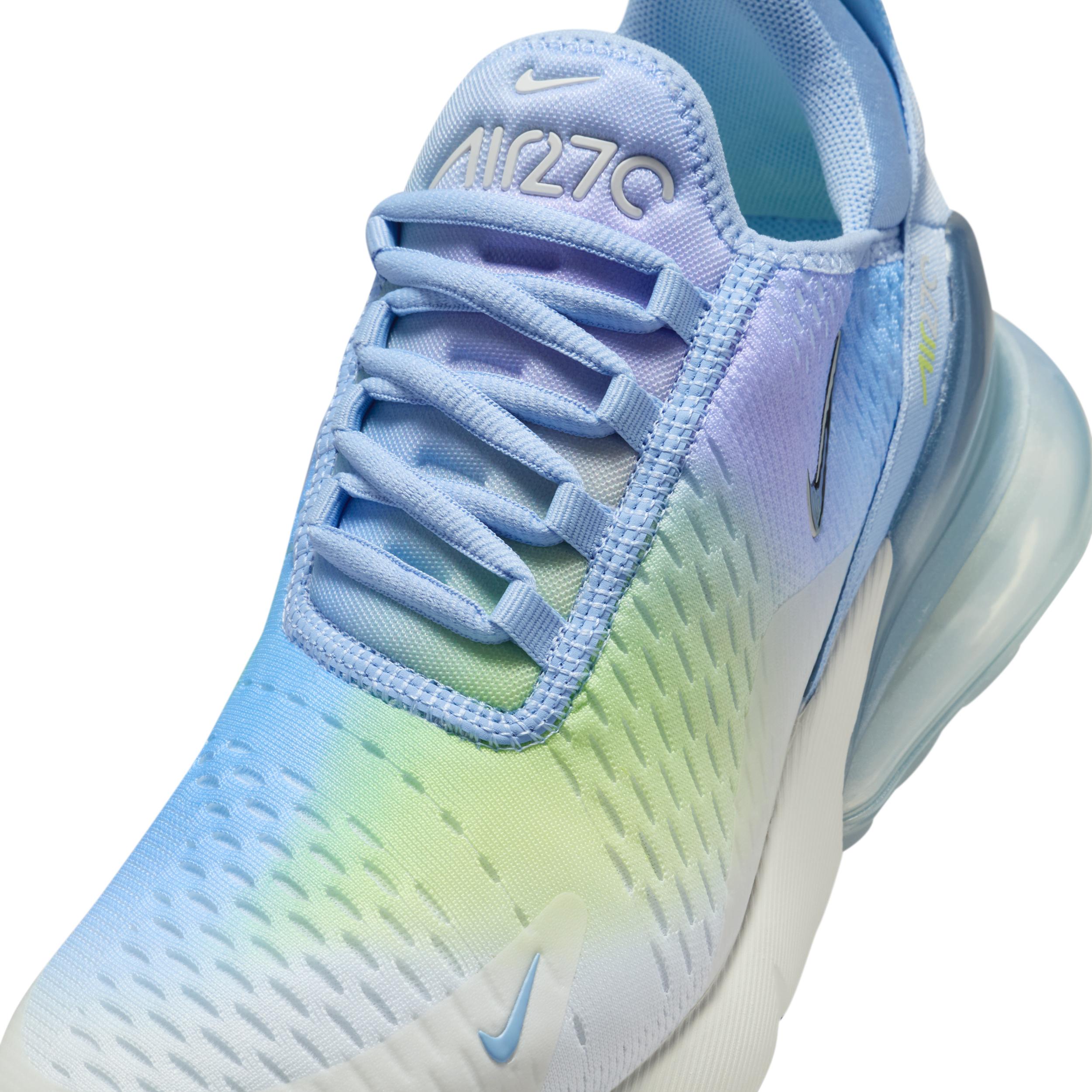 Nikes first lifestyle Air Max brings you style, comfort and big attitude. Drawing inspiration from Air Max icons, the Nike Air Max 270 showcases Nikes greatest innovation with its large window and fresh array of colors. Benefits:Max Air 270 unit delivers all-day comfort. Woven and synthetic fabric on the upper provides a lightweight fit and airy feel. Foam midsole feels soft and comfortable. Stretchy inner sleeve and bootie-like construction creates a personalized fit. Rubber on the outsole adds traction and durability. Style: IB7937; Color: Aluminum/Hydrangeas/Light Lemon Twist/Metallic Silver; Size: 11.5; Gender: Female; Age Group: Adult | Nike Air Max 270 Womens Shoes in Blue, Size: 11.5 | IB7937-468